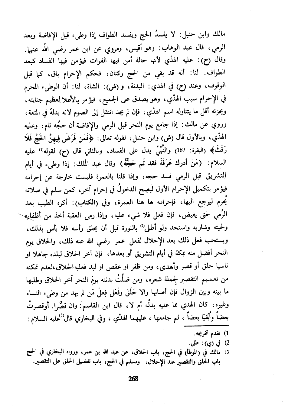 لقَوْله - صَلَّى اللَّهُ عَلَيْهِ وَسَلَّم َ - مَنْ أَدْرَكَ عَرَفَةَ فَقَدْ تَمَّ حَجُّهُ وَقَالَ عَبْدُ الْمَلِكِ إِذَا وَطِئَ فِي أَيَّامِ التَّشْرِيقِ قَبْلَ الرَّمْيِ فَسَدَ حَجُّهُ وَإِذَا قُلْنَا بِالْعُمْرَةِ فَلَيْسَتْ خَارِجَةً عَنْ إِحْرَامِهِ فَيُؤْمَرُ بِتَكْمِيلِ الْإِحْرَامِ الْأَوَّلِ لِيَصِحَّ الدُّخُولُ فِي إِحْرَامٍ آخَرَ كَمَنْ سَلَّمَ فِي صَلَاتِهِ يُحْرِمُ لِيَرْجِعَ إِلَيْهَا فَإِحْرَامُهُ هَا هُنَا الْعُمْرَةُ وَفِي الْكِتَابِ أَكْرَهُ الطِّيبَ بَعْدَ الرَّمْيِ حَتَّى يُفِيضَ فَإِنْ فَعَلَ فَلَا شَيْءَ عَلَيْهِ وَإِذَا رَمَى الْعَقَبَةَ أَخَذَ مِنْ أَظْفَارِهِ وَلِحْيَتِهِ وَشَارِبِهِ وَاسْتَحَدَّ وَلَوْ أَطَلَى بِالنَّوْرَةِ قَبْلَ أَنْ يَحْلِقَ رَأْسَهُ فَلَا بَأْسَ بِذَلِكَ وَيُسْتَحَبُّ فِعْلُ ذَلِكَ بَعْدَ الْإِحْلَالِ لِفِعْلِ عُمَرَ رَضِيَ اللَّهُ عَنْهُ ذَلِكَ وَالْحِلَاقُ يَوْمَ النَّحْرِ أَفْضَلُ مِنْهُ بِمَكَّةَ فِي أَيَّامِ التَّشْرِيقِ أَوْ بَعْدَهَا فَإِنْ أَخَّرَ الْحِلَاقَ لِبَلَدِهِ جَاهِلًا أَوْ نَاسِيًا حَلَقَ أَو قصر وَأهْدى وَمن ظفر أَوْ عَقَصَ أَوْ لَبَّدَ فَعَلَيْهِ الْحِلَاقُ لِعَدَمِ تَمَكُّنِهِ مِنْ تَعْمِيمِ التَّقْصِيرِ لِجُمْلَةِ شَعْرِهِ وَمَنْ ضَلَّتْ بَدَنَتُهُ يَوْمَ النَّحْرِ أَخَّرَ الْحِلَاقِ وَطَلَبَهَا مَا بَيْنَهُ وَبَيْنَ الزَّوَالِ فَإِنْ أَصَابَهَا وَإِلَّا حَلَقَ وَفَعَلَ فِعْلَ مَنْ لَمْ يُهْدِ مِنْ وطئ النِّسَاء وَغَيره كَانَ الْهَدْي مِمَّا عَلَيْهِ بدله أَو لَا قَالَ ابْن الْقَاسِم وَإِن قصرا أَو قصرت بَعْضًا وَأَبْقَيَا بَعْضًا ثُمَّ جَامَعَهَا عَلَيْهِمَا الْهَدْيُ وَفِي الْبُخَارِيِّ