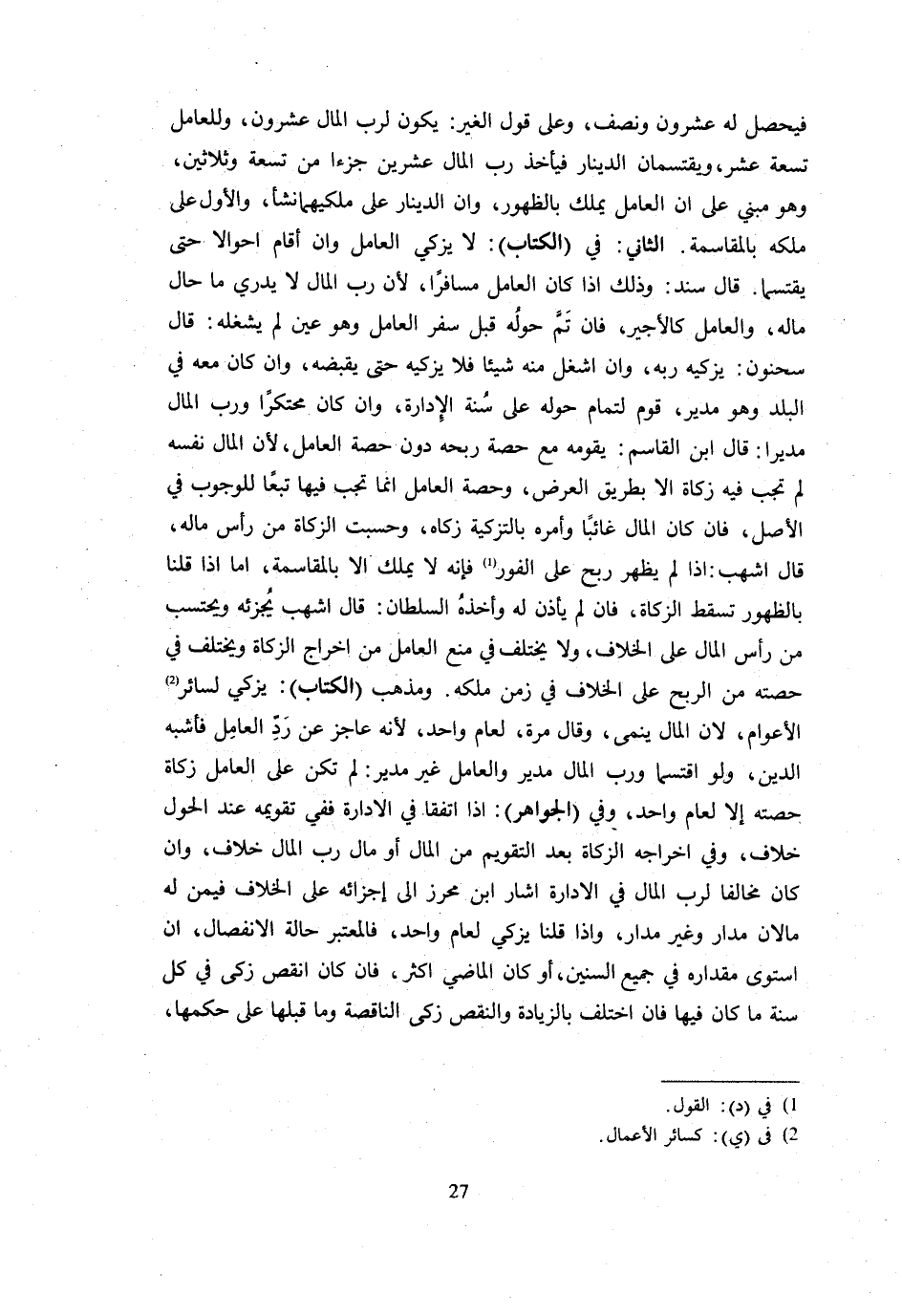 فَيَحْصُلُ لَهُ عِشْرُونَ وَنِصْفٌ وَعَلَى قَوْلِ الْغَيْرِ يَكُونُ لِرَبِّ الْمَالِ عِشْرُونَ وَلِلْعَامِلِ تِسْعَةَ عَشَرَ وَيَقْتَسِمَانِ الدِّينَارَ فَيَأْخُذُ رَبُّ الْمَالِ عِشْرِينَ جُزْءًا مِنْ تِسْعَةٍ وَثَلَاثِينَ وَهُوَ مَبْنِيٌ عَلَى أَنَّ الْعَامِلَ يَمْلُكُ بِالظُّهُورِ وَأنَّ الدِّينَارَ عَلَى مِلْكَيْهِمَا نَشَأَ وَالْأَوَّلُ عَلَى مِلْكِهِ بِالْمُقَاسَمَةِ الثَّانِي فِي الْكِتَابِ لَا يُزَكِّي الْعَامِلُ وَإِنْ أَقَامَ أَحْوَالًا حَتَّى يَقْتَسِمَا قَالَ سَنَدٌ وَذَلِكَ إِذَا كَانَ الْعَامِلُ مُسَافِرًا لِأَنَّ رَبَّ الْمَالِ لَا يَدْرِي مَا حَالُ مَالِهِ وَالْعَامِلُ كَالْأَجِيرِ فَإِنْ تَمَّ حَوْلُهُ قَبْلَ سَفَرِ الْعَامِلِ وَهُوَ عَيْنٌ لَمْ يَشْغَلْهُ قَالَ سَحْنُونٌ يُزَكِّيهِ رَبُّهُ وَإِنْ أَشْغَلَ مِنْهُ شَيْئًا فَلَا يُزَكِّيهِ حَتَّى يَقْبِضَهُ وَإِنْ كَانَ مَعَهُ فِي الْبَلَدِ وَهُوَ مُدِيرٌ قَوَّمَ لِتَمَامِ حَوْلِهِ عَلَى سَنَةِ الْإِدَارَةِ وَإِنْ كَانَ محتكرا وَرب المَال مديرا قَالَ ابْنُ الْقَاسِمِ يُقَوِّمُهُ مَعَ حِصَّةِ رِبْحِهِ دُونَ حِصَّةِ الْعَامِلِ لِأَنَّ الْمَالَ نَفْسُهُ لَمْ تَجِبْ فِيهِ زَكَاةٌ إِلَّا بِطَرِيقِ الْعَرْضِ وَحِصَّةُ الْعَامِلِ إِنَّمَا تَجِبُ فِيهَا تَبَعًا لِلْوُجُوبِ فِي الْأَصْلِ فَإِنْ كَانَ الْمَالُ غَائِبًا وَأَمَرَهُ بِالتَّزْكِيَةِ زَكَّاهُ وَحُسِبَتِ الزَّكَاةُ مِنْ رَأْسِ مَالِهِ قَالَ أَشْهَبُ إِذَا لَمْ يَظْهَرْ رِبْحٌ عَلَى الْفَوْرِ فَإِنَّهُ لَا يَمْلِكُ إِلَّا بِالْمُقَاسَمَةِ أَمَّا إِذَا قُلْنَا بِالظُّهُورِ تَسْقُطُ الزَّكَاةُ فَإِنْ لَمْ يَأْذَنْ لَهُ وَأَخذه السُّلْطَان قَالَ اشهب يُجزئهُ ويحتسب مِنْ رَأْسِ الْمَالِ عَلَى الْخِلَافِ وَلَا يُخْتَلَفُ فِي مَنْعِ الْعَامِلِ مِنْ إِخْرَاجِ الزَّكَاةِ وَيُخْتَلَفُ فِي حِصَّتِهِ مِنَ الرِّبْحِ عَلَى الْخِلَافِ فِي زَمَنِ مِلْكِهِ وَمَذْهَبُ الْكِتَابِ يُزَكِّي لِسَائِرِ الْأَعْوَامِ لِأَنَّ الْمَالَ يُنَمَّى وَقَالَ مَرَّةً لِعَامٍ وَاحِدٍ لِأَنَّهُ عَاجِزٌ عَنْ رَدِّ الْعَامِلِ فَأَشْبَهَ الدَّيْنَ وَلَوِ اقْتَسَمَا وَرَبُّ الْمَالِ مُدِيرٌ وَالْعَامِلُ غَيْرُ مُدِيرٍ لَمْ تَكُنْ عَلَى الْعَامِلِ زَكَاةُ حِصَّتِهِ إِلَّا لعام وَاحِد وَفِي الْجَوَاهِرِ إِذَا اتَّفَقَا فِي الْإِدَارَةِ فَفِي تَقْوِيمِهِ عِنْد الْحول خلاف وَفِي اخراجه الزَّكَاةَ بَعْدَ التَّقْوِيمِ مِنَ الْمَالِ أَوْ مَالِ رَبِّ الْمَالِ خِلَافٌ وَإِنْ كَانَ مُخَالِفًا لِرَبِّ المَال فِي الادارة اشار ابْن مُحرز الى إجزائه عَلَى الْخِلَافِ فِيمَنْ لَهُ مَالَانِ مَدَارٌ وَغَيْرُ مَدَارٍ وَإِذَا قُلْنَا يُزَكِّي لِعَامٍ وَاحِدٍ فَالْمُعْتَبَرُ حَالَة الِانْفِصَال إِنِ اسْتَوَى مِقْدَارُهُ فِي جَمِيعِ السِّنِينَ أَوْ كَانَ الْمَاضِي اكثر فان كَانَ أنْقصَ زَكَّى فِي كُلِّ سَنَةٍ مَا كَانَ فِيهَا فَإِنِ اخْتَلَفَ بِالزِّيَادَةِ وَالنَّقْصِ زَكَّى النَّاقِصَةَ وَمَا قَبَلَهَا عَلَى حُكْمِهَا