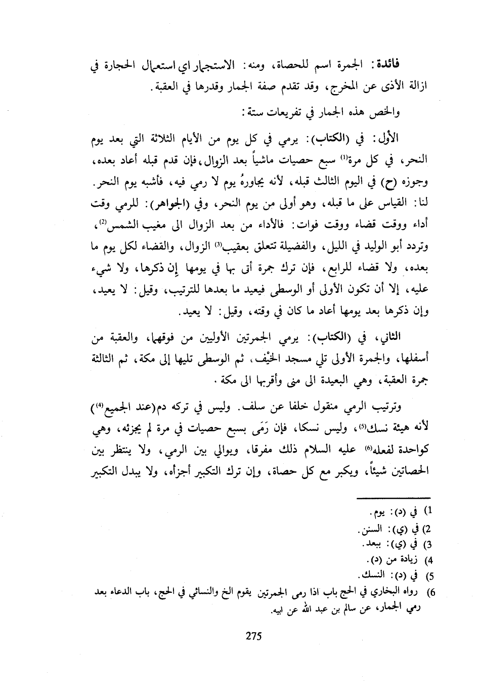 فَائِدَةٌ الْجَمْرَةُ اسْمٌ لِلْحَصَاةِ وَمِنْهُ الِاسْتِجْمَارُ أَيْ اسْتِعْمَال الْحِجَارَة فِي إِزَالَة الْأَذَى عَن الْمخْرج وَقَدْ تَقَدَّمَ صِفَةُ الْجِمَارِ وَقَدْرُهَا فِي الْعَقَبَةِ وَأُلَخِّصُ هَذِهِ الْجِمَارَ فِي تَفْرِيعَاتٍ سِتَّةٍ الْأَوَّلُ فِي الْكِتَابِ يَرْمِي فِي كُلِّ يَوْمٍ مِنَ الْأَيَّامِ الثَّلَاثَةِ الَّتِي بَعْدَ يَوْمِ النَّحْرِ فِي كُلِّ مَرَّةٍ سَبْعَ حَصَيَاتٍ مَاشِيًا بَعْدَ الزَّوَالِ فَإِنْ قَدِمَ قَبْلَهُ أَعَادَ بَعْدَهُ وَجَوَّزَهُ ح فِي الْيَوْمِ الثَّالِثِ قَبْلَهُ لِأَنَّهُ يُجَاوِرُهُ يَوْمٌ لَا رَمْيَ فِيهِ فَأَشْبَهَ يَوْمَ نَحْرٍ لَنَا الْقِيَاسُ عَلَى مَا قَبْلَهُ وَهُوَ أَوْلَى مِنْ يَوْمِ النَّحْرِ وَفِي الْجَوَاهِرِ لِلرَّمْيِ وَقْتُ أَدَاءٍ وَوَقْتُ قَضَاءٍ وَوَقْتُ فَوَاتٍ فَالْأَدَاءُ مِنْ بَعْدِ الزَّوَالِ إِلَى مَغِيبِ الشَّمْسِ وَتَرَدَّدَ أَبُو الْوَلِيدِ فِي اللَّيْلِ وَالْفَضِيلَةُ تَتَعَلَّقُ بِعُقَيْبِ الزَّوَالِ وَالْقَضَاءُ لِكُلِّ يَوْمٍ مَا بَعْدَهُ وَلَا قَضَاءَ لِلرَّابِعِ فَإِنْ تَرَكَ جَمْرَةً أَتَى بِهَا فِي يَوْمِهَا إِنْ ذَكَرَهَا وَلَا شَيْءَ عَلَيْهِ إِلَّا أَنْ يكون الْأُولَى أَوِ الْوُسْطَى فَيُعِيدُ مَا بَعْدَهَا لِلتَّرْتِيبِ وَقِيلَ لَا يُعِيدُ وَإِنْ ذَكَرَهَا بَعْدَ يَوْمِهَا أَعَادَ مَا كَانَ فِي وَقْتِهِ وَقِيلَ لَا يُعِيدُ الثَّانِي فِي الْكِتَابِ يَرْمِي الْجَمْرَتَيْنِ الْأُولَيَيْنِ مِنْ فَوْقِهِمَا وَالْعَقَبَةَ مِنْ أَسْفَلِهَا وَالْجَمْرَةَ الْأُولَى تَلِي مَسْجِدَ الْخَيْفِ ثُمَّ الْوُسْطَى تَلِيهَا إِلَى مَكَّةَ ثُمَّ الثَّالِثَةَ جَمْرَةَ الْعَقَبَةِ وَهِيَ الْبَعِيدَةُ إِلَى مِنًى وَأَقْرَبُهَا إِلَى مَكَّةَ وَتَرْتِيبُ الرَّمْيِ مَنْقُولٌ خَلَفًا عَنْ سَلَفٍ وَلَيْسَ فِي تَرْكِهِ دَمٌ عِنْدَ الْجَمِيعِ لِأَنَّهُ هَيْئَةُ نُسُكٍ وَلَيْسَ نُسُكًا فَإِنْ رَمَى بِسَبْعِ حَصَيَاتٍ فِي مَرَّةٍ لَمْ يُجْزِئْهُ وَهِيَ كَوَاحِدَةٍ لِفِعْلِهِ عَلَيْهِ السَّلَامُ ذَلِكَ مُفَرَّقًا وَيُوَالِي بَيْنَ الرَّمْيِ وَلَا يَنْتَظِرُ بَيْنَ الْحَصَاتَيْنِ شَيْئًا وَيُكَبِّرُ مَعَ كُلِّ حَصَاةٍ وَإِنْ تَرَكَ التَّكْبِيرَ أَجْزَأَهُ وَلَا يُبَدِّلُ التَّكْبِيرَ