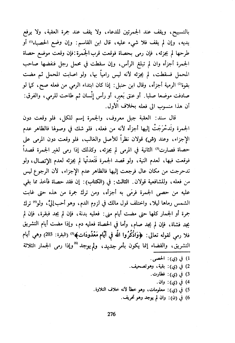 بِالتَّسْبِيحِ وَيَقِفُ عِنْدَ الْجَمْرَتَيْنِ لِلدُّعَاءِ وَلَا يَقِفُ عِنْدَ جَمْرَةِ الْعَقَبَةِ وَلَا يَرْفَعُ يَدَيْهِ وَإِنْ لَمْ يَقِفْ فَلَا شَيْءَ عَلَيْهِ قَالَ ابْنُ الْقَاسِمِ وَإِنْ وَضَعَ الْحَصْبَاءَ أَوْ طَرَحَهَا لَمْ يُجْزِئْهُ فَإِنْ رَمَى بِحَصَاةٍ فَوَقَعَتْ قُرْبَ الْجَمْرَةِ فَإِنْ وَقَعَتْ مَوْضِعَ حَصَاةِ الْجَمْرَةِ أَجْزَأَهُ وَإِنْ لَمْ تَبْلُغِ الرَّأْسَ وَإِنْ سَقَطَتْ فِي مَحْمَلِ رَجُلٍ فَنَفَضَهَا صَاحِبُ الْمَحْمَلِ فَسَقَطَتْ لَمْ يُجْزِئْهُ لِأَنَّهُ لَيْسَ رَامِيًا بِهَا وَلَوْ أَصَابَتِ الْمَحْمَلَ ثُمَّ مَضَتْ بِقُوَّةِ الرَّمْيَةِ أَجْزَأَهُ وَقَالَ ابْنُ حَنْبَلٍ إِذَا كَانَ ابْتِدَاءُ الرَّمْيِ مِنْ فِعْلِهِ صَحَّ كَمَا لَوْ صَادَفَتْ مَوْضِعًا صُلْبًا أَوْ عُنُقَ بَعِيرٍ أَوْ رَأْسَ إِنْسَانٍ ثُمَّ طَاحَتْ لِلرَّمْيِ وَالْفَرْقُ أَنَّ هَذَا مَنْسُوبٌ إِلَى فِعْلِهِ بِخِلَافِ الْأَوَّلِ قَالَ سَنَدٌ الْعَقَبَةُ جَبَلٌ مَعْرُوفٌ وَالْجَمْرَةُ اسْمٌ لِلْكُلِّ فَلَوْ وَقَعَتْ دُونَ الْجَمْرَةِ وَتَدَحْرَجَتْ إِلَيْهَا أَجْزَأَهُ لِأَنَّهُ مِنْ فِعْلِهِ فَلَوْ شكّ فِي وصولها فَالظَّاهِر عدم الإجراء وَعِنْدَ ش قَوْلَانِ نَظَرًا لِلْأَصْلِ وَالْغَالِبِ فَلَوْ وَقَعَتْ دُونَ الْمَرْمَى عَلَى حَصَاةٍ فَصَارَتِ الثَّانِيَةُ فِي الْمَرْمَى لَمْ يُجْزِئْهُ وَكَذَلِكَ إِذَا رَمَى لِغَيْرِ الْجَمْرَةِ قَصْدًا فَوَقَعَتْ فِيهَا لِعَدَمِ النِّيَّةِ وَلَوْ قَصَدَ الْجَمْرَةَ فَتَعَدَّتْهَا لَمْ يُجْزِئْهُ لِعَدَمِ الِاتِّصَالِ وَلَوْ تَدَحْرَجَتْ مِنْ مَكَانٍ عَالٍ فَرَجَعَتْ إِلَيْهَا فَالظَّاهِرُ عَدَمُ الْإِجْزَاءِ لِأَنَّ الرُّجُوعَ لَيْسَ مِنْ فِعْلِهِ وَلِلشَّافِعِيَّةِ قَوْلَانِ الثَّالِثُ فِي الْكِتَابِ إِنْ فَقَدَ حَصَاةً فَأَخَذَ مِمَّا بَقِيَ عَلَيْهِ مِنْ حَصَى الْجَمْرَةِ فَرَمَى بِهِ أَجْزَأَهُ وَمَنْ تَرَكَ جَمْرَةً مِنْ هَذِهِ حَتَّى غَابَتِ الشَّمْسُ رَمَاهَا لَيْلًا وَاخْتَلَفَ قَوْلُ مَالِكٍ فِي لُزُومِ الدَّمِ وَهُوَ أَحَبُّ إِلَيَّ وَلَوْ تَرَكَ جَمْرَةً أَوِ الْجِمَارَ كُلَّهَا حَتَّى مَضَتْ أَيَّامُ مِنًى فَعَلَيْهِ بَدَنَةٌ فَإِنْ لَمْ يَجِدْ فَبَقَرَةٌ فَإِنْ لم يجد فشاة فَإِن لم يجد صَامَ وَأَمَّا فِي الْحَصَاةِ فَعَلَيْهِ دَمٌ وَإِذَا مَضَتْ أَيَّامُ التَّشْرِيقِ فَلَا رَمْيَ لِقَوْلِهِ تَعَالَى {وَاذْكُرُوا اللَّهَ فِي أَيَّامٍ مَعْدُودَاتٍ} الْبَقَرَة 203 وَهِيَ أَيَّامُ التَّشْرِيقِ وَالْقَضَاءُ إِنَّمَا يَكُونُ بِأَمْرٍ جَدِيدٍ وَلَمْ يُوجَدْ وَإِذَا رَمَى الْجِمَارَ الثَّلَاثَةَ