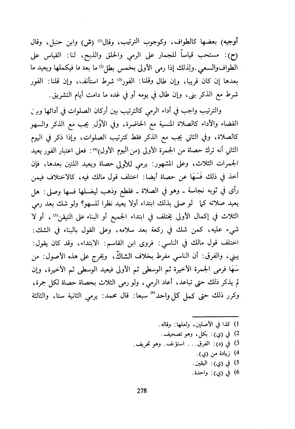 أوجه بَعْضُهَا كَالطَّوَافِ وَكَوُجُوبِ التَّرْتِيبِ وَقَالَ ش وَابْنُ حَنْبَلٍ وَقَالَ ح مُسْتَحَبٌّ قِيَاسًا لِلْجِمَارِ عَلَى الرَّمْيِ وَالْحَلْقِ وَالذَّبْحِ لَنَا الْقِيَاسُ عَلَى الطَّوَافِ وَالسَّعْيِ وَلِذَلِكَ إِذَا رَمَى الْأُولَى بِخَمْسٍ بَطَلَ مَا بَعْدَهَا فَيُكَمِّلُهَا وَيُعِيدُ مَا بَعْدَهَا إِنْ كَانَ قَرِيبا وَأَن طَال وَقُلْنَا الْفَوْرُ شَرْطٌ اسْتَأْنَفَ وَإِنْ قُلْنَا الْفَوْرُ شَرْطٌ مَعَ ذكر بَنَى وَإِنْ طَالَ فِي يَوْمِهِ أَوْ غَدِهِ مَا دَامَتْ أَيَّامُ التَّشْرِيقِ وَالتَّرْتِيبُ وَاجِبٌ فِي أَدَاءِ الرَّمْيِ كَالتَّرْتِيبِ بَيْنَ أَرْكَانِ الصَّلَوَاتِ فِي أَدَائِهَا وَبَيْنَ الْقَضَاءِ وَالْأَدَاءِ كَالصَّلَاةِ الْمَنْسِيَّةِ مَعَ الْحَاضِرَة وَفِي الأولى يَجِبُ مَعَ الذِّكْرِ وَالسَّهْوِ كَالصَّلَاةِ وَفِي الثَّانِي يَجِبُ مَعَ الذِّكْرِ فَقَطْ كَتَرْتِيبِ الصَّلَوَاتِ وَإِذَا ذَكَرَ فِي الْيَوْمِ الثَّانِي أَنَّهُ تَرَكَ حَصَاةً مِنَ الْجَمْرَةِ الْأُولَى مِنَ الْيَوْمِ الْأَوَّلِ فَعَلَى اعْتِبَارِ الْفَوْرِ يُعِيدُ الْجَمَرَاتِ الثَّلَاثَ وَعَلَى الْمَشْهُورِ يَرْمِي لِلْأُولَى حَصَاةً وَيُعِيدُ اللَّتَيْنِ بَعْدَهَا فَإِنْ أَخَذَ فِي ذَلِكَ فَسَهَا عَنْ حَصَاةٍ أَيْضًا اخْتَلَفَ قَوْلُ مَالِكٍ فِيهِ كَالِاخْتِلَافِ فِيمَنْ رَأَى فِي ثَوْبِهِ نَجَاسَةً وَهُوَ فِي الصَّلَاةِ فَقَطَعَ وَذَهَبَ لِيَغْسِلَهَا فَسَهَا وَصَلَّى هَلْ يُعِيدُ صَلَاتَهُ كَمَا لَو صلى بذلك ابْتِدَاء أَولا يُعِيد نظر لِلسَّهْوِ وَلَوْ شَكَّ بَعْدَ رَمْيٍ الثَّلَاثِ فِي إِكْمَالِ الْأُولَى يَخْتَلِفُ فِي ابْتِدَاءِ الْجَمِيعِ أَوِ الْبِنَاءِ عَلَى التَّيَقُّنِ أَوْ لَا شَيْءَ عَلَيْهِ كَمَنْ شَكَّ فِي رَكْعَةٍ بَعْدَ سَلَامِهِ وَعَلَى الْقَوْلِ بِالْبِنَاءِ فِي الشَّكِّ اخْتَلَفَ قَوْلُ مَالِكٍ فِي النَّاسِي فَرَوَى ابْنُ قَاسِمٍ الِابْتِدَاءَ وَقَدْ كَانَ يَقُول بيني وَالْفَرْقُ أَنَّ النَّاسِيَ مُفَرِّطٌ بِخِلَافِ الشَّاكِّ وَيَخْرُجُ عَلَى هَذِهِ الْأُصُولِ مِنْ سَهَا فَرَمَى الْجَمْرَةَ الْأَخِيرَةَ ثُمَّ الْوُسْطَى ثُمَّ الْأُولَى فَيُعِيدُ الْوُسْطَى ثُمَّ الْأَخِيرَةَ وَإِنْ لَمْ يَذْكُرْ ذَلِكَ حَتَّى تَبَاعَدَ أَعَادَ الرَّمْيَ وَلَوْ رَمَى الثَّلَاثَ بِحَصَاةٍ حَصَاةٍ لِكُلِّ جَمْرَةٍ وَكَرَّرَ ذَلِكَ حَتَّى كَمَّلَ كُلَّ وَاحِدٍ سَبْعًا قَالَ مُحَمَّدٌ يَرْمِي الثَّانِيَةَ سِتا وَالثَّالِثَة