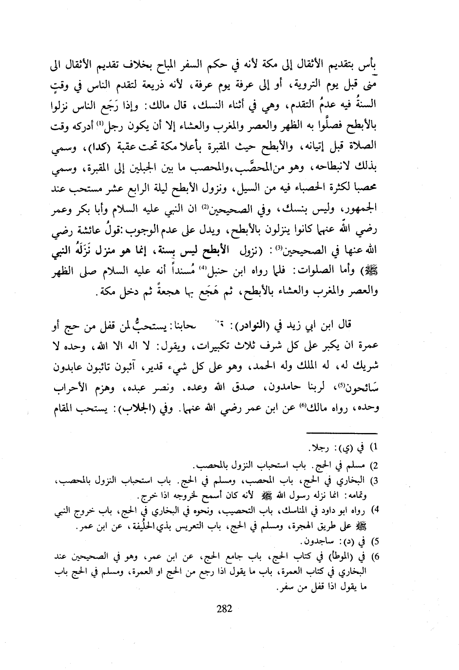 بَأْسَ بِتَقْدِيمِ الْأَثْقَالِ إِلَى مَكَّةَ لِأَنَّهُ فِي حُكْمِ السَّفَرِ الْمُبَاحِ بِخِلَافِ تَقْدِيمِ الْأَثْقَالِ إِلَى مِنًى قَبْلَ يَوْمِ التَّرْوِيَةِ أَوْ إِلَى عَرَفَةَ يَوْمَ عَرَفَةَ لِأَنَّهُ ذَرِيعَةٌ لِتَقَدُّمِ النَّاسِ فِي وَقْتٍ السُّنَّةُ فِيهِ عَدَمُ التَّقَدُّمِ وَهِيَ فِي أَثْنَاءِ النُّسُكِ قَالَ مَالِكٌ وَإِذَا رَجَعَ النَّاسُ نَزَلُوا بِالْأَبْطَحِ فَصَلَّوْا بِهِ الظُّهْرَ وَالْعَصْرَ وَالْمَغْرِبَ وَالْعِشَاءَ إِلَّا أَنْ يَكُونَ رَجُلٌ أَدْرَكَهُ وَقْتُ الصَّلَاة قبل إِتْيَانه والأبطح حَيْثُ الْمقْبرَة بأعلا مَكَّة تَحت عقبَة كدا وَسُمِّيَ بِذَلِكَ لِانْبِطَاحِهِ وَهُوَ مِنَ الْمُحَصَّبِ وَالْمُحَصَّبُ مَا بَيْنَ الْجَبَلَيْنِ إِلَى الْمَقْبُرَةِ وَسُمِّيَ مُحَصَّبًا لِكَثْرَةِ الْحَصْبَاءِ فِيهِ مِنَ السَّيْلِ وَنُزُولُ الْأَبْطَحِ لَيْلَةَ الرَّابِعَ عَشَرَ مُسْتَحَبٌّ عِنْدَ الْجُمْهُورِ وَلَيْسَ بنسك وَفِي الصَّحِيحَيْنِ أَنَّ النَّبِيَّ - صَلَّى اللَّهُ عَلَيْهِ وَسَلَّم َ - وَأَبَا بَكْرٍ وَعُمَرَ رَضِيَ اللَّهُ عَنْهُمَا كَانُوا يَنْزِلُونَ بِالْأَبْطَحِ وَيَدُلُّ عَلَى عَدَمِ الْوُجُوبِ قَوْلُ عَائِشَةَ رَضِيَ اللَّهُ عَنْهَا فِي الصَّحِيحَيْنِ نُزُولُ الْأَبْطَحِ لَيْسَ بِسُنَّةٍ إِنَّمَا هُوَ مَنْزِلٌ نَزَلَهُ النَّبِي - صَلَّى اللَّهُ عَلَيْهِ وَسَلَّم َ - وَأما الصَّلَوَات فَلَمَّا رَوَاهُ ابْن حَنْبَل مُسْندًا أَنه - صَلَّى اللَّهُ عَلَيْهِ وَسَلَّم َ - صَلَّى الظُّهْرَ وَالْعَصْرَ وَالْمَغْرِبَ وَالْعِشَاءَ بِالْأَبْطَحِ ثُمَّ هَجَعَ بِهَا هَجْعَةً ثُمَّ دَخَلَ مَكَّةَ قَالَ ابْنُ أَبِي زَيْدٍ فِي النَّوَادِرِ قَالَ أَصْحَابُنَا يُسْتَحَبُّ لِمَنْ قَفَلَ مِنْ حَجٍّ أَوْ عُمْرَةٍ أَنْ يُكَبِّرَ عَلَى كُلِّ شَرَفٍ ثَلَاثَ تَكْبِيرَاتٍ وَيَقُولَ لَا إِلَهَ إِلَّا اللَّهُ وَحْدَهُ لَا شَرِيكَ لَهُ لَهُ الْمُلْكُ وَلَهُ الْحَمْدُ وَهُوَ عَلَى كل شَيْء قدير آئبون تائبون عَابِدُونَ سائحون لِرَبِّنَا حَامِدُونَ صَدَقَ اللَّهُ وَعْدَهُ وَنَصَرَ عَبْدَهُ وَهَزَمَ الْأَحْزَابَ وَحْدَهُ رَوَاهُ مَالِكٌ عَنِ ابْنِ عُمَرَ رَضِيَ اللَّهُ عَنْهُمَا وَفِي الْجُلَّابِ يُسْتَحَبُّ الْمقَام