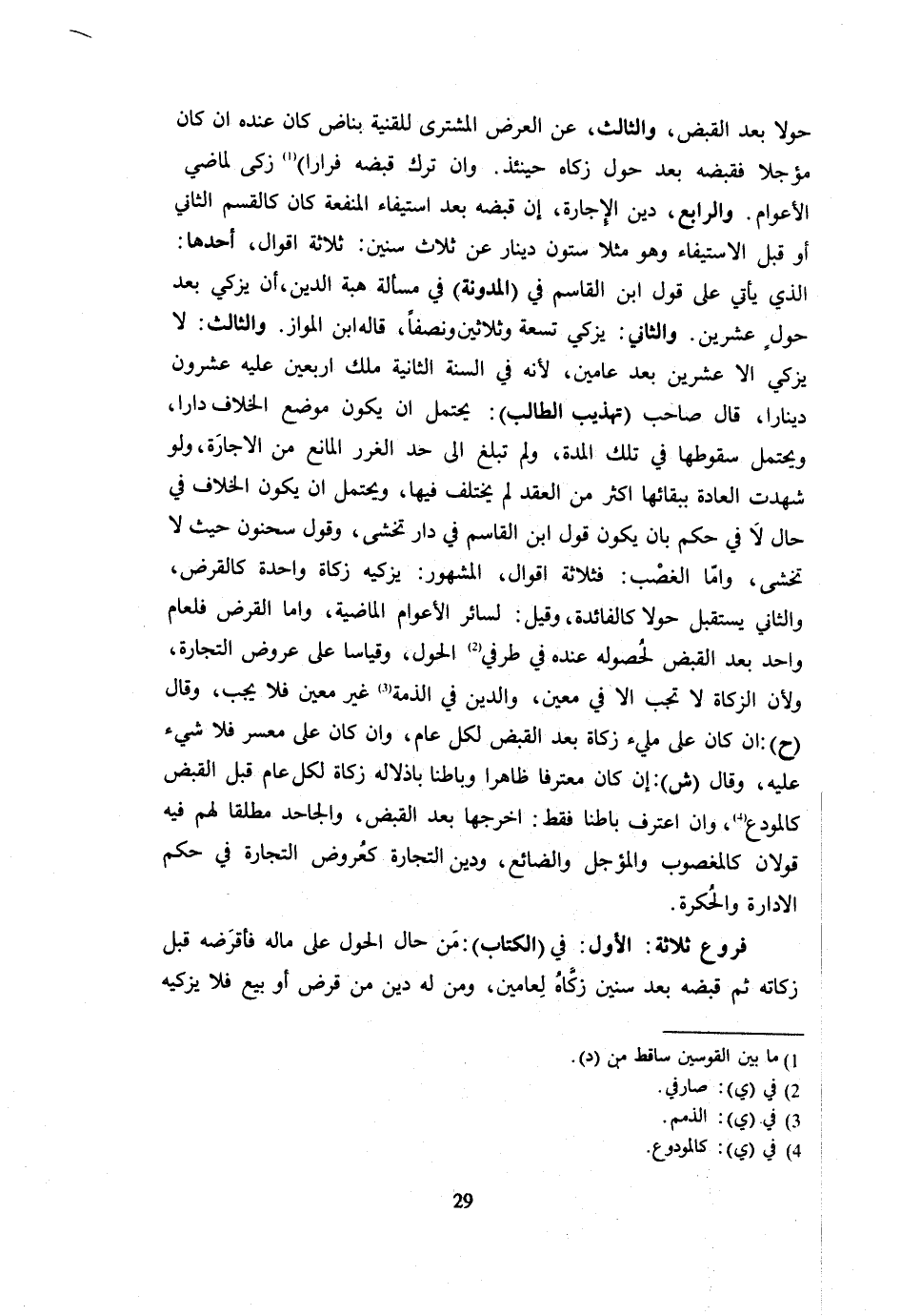 حَوْلًا بَعْدَ الْقَبْضِ وَالثَّالِثُ عَنِ الْعَرْضِ الْمُشْتَرَى لِلْقِنْيَةِ بِنَاضٍّ كَانَ عِنْدَهُ إِنْ كَانَ مُؤَجَّلًا فَقَبْضَهُ بَعْدَ حَوْلٍ زَكَّاهُ حِينَئِذٍ وَإِنْ تَرَكَ قَبْضَهُ فِرَارًا زَكَّى لِمَاضِي الْأَعْوَامِ وَالرَّابِعُ دَيْنُ الْإِجَارَةِ إِنْ قَبَضَهُ بَعْدَ اسْتِيفَاءِ الْمَنْفَعَةِ كَانَ كالقسم الثَّانِي أَو قبل الِاسْتِيفَاء وَهُوَ مَثَلًا سِتُّونَ دِينَارًا عَنْ ثَلَاثِ سِنِينَ ثَلَاثَة أَقْوَالٍ أَحَدُهَا الَّذِي يَأْتِي عَلَى قَوْلِ ابْنِ الْقَاسِمِ فِي الْمُدَوَّنَةِ فِي مَسْأَلَةِ هِبَةِ الدَّيْنِ أَنْ يُزَكِّيَ بَعْدَ حَوْلٍ عِشْرِينَ وَالثَّانِي يُزَكِّي تِسْعَةً وَثَلَاثِينَ وَنِصْفًا قَالَهُ ابْنُ الْمَوَّازِ وَالثَّالِثُ لَا يُزَكِّي إِلَّا عِشْرِينَ بَعْدَ عَامَيْنِ لِأَنَّهُ فِي السَّنَةِ الثَّانِيَةِ مَلِكَ أَرْبَعِينَ عَلَيْهِ عِشْرُونَ دِينَارًا قَالَ صَاحِبُ تَهْذِيبِ الطَّالِبِ يُحْتَمَلُ أَنْ يَكُونَ مَوْضِعُ الْخِلَافِ دَارًا وَيُحْتَمَلُ سُقُوطُهَا فِي تِلْكَ الْمُدَّةِ وَلَمْ تَبْلُغْ إِلَى حَدِّ الْغَرَرِ الْمَانِعِ مِنَ الْإِجَارَةِ وَلَوْ شَهِدَتِ الْعَادَةُ بِبَقَائِهَا أَكْثَرَ مِنَ الْعَقْدِ لَمْ يُخْتَلَفْ فِيهَا وَيُحْتَمَلُ أَنْ يَكُونَ الْخِلَافُ فِي حَالٍ لَا فِي حُكْمٍ بِأَنْ يَكُونَ قَوْلُ ابْنِ الْقَاسِمِ فِي دَارٍ تُخْشَى وَقَوْلُ سَحْنُونٍ حَيْثُ لَا تُخْشَى وَأَمَّا الْغَصْبُ فَثَلَاثَةُ أَقْوَالٍ الْمَشْهُورُ يُزَكِّيهِ زَكَاةً وَاحِدَةً كَالْقَرْضِ وَالثَّانِي يَسْتَقْبِلُ حَوْلًا كَالْفَائِدَةِ وَقِيلَ لِسَائِرِ الْأَعْوَامِ الْمَاضِيَةِ وَأَمَّا الْقَرْضُ فَلِعَامٍ وَاحِدٍ بَعْدَ الْقَبْضِ لِحُصُولِهِ عِنْدَهُ فِي طَرَفَيِ الْحَوَلِ وَقِيَاسًا عَلَى عُرُوضِ التِّجَارَةِ وَلِأَنَّ الزَّكَاةَ لَا تَجِبُ إِلَّا فِي مُعَيَّنٍ وَالدَّيْنُ فِي الذِّمَّةِ غَيْرُ مُعَيَّنٍ فَلَا يَجِبُ وَقَالَ (ح) إِنْ كَانَ عَلَى مَلِيءٍ زَكَّاهُ بَعْدَ الْقَبْضِ لِكُلِّ عَامٍ وَإِنْ كَانَ عَلَى مُعْسِرٍ فَلَا شَيْءَ عَلَيْهِ وَقَالَ (ش) إِنْ كَانَ مُعْتَرِفًا ظَاهِرًا وَبَاطنا باذلاله زَكاه لِكُلِّ عَامٍ قَبْلَ الْقَبْضِ كَالْمُودِعِ وَإِنِ اعْتَرَفَ بَاطِنًا فَقَطْ أَخْرَجَهَا بَعْدَ الْقَبْضِ وَالْجَاحِدُ مُطْلَقًا لَهُمْ فِيهِ قَوْلَانِ كَالْمَغْصُوبِ وَالْمُؤَجَّلِ وَالضَّائِعِ وَدَيْنِ التِّجَارَةِ كَعُرُوضِ التِّجَارَةِ فِي حُكْمِ الْإِدَارَةِ وَالْحُكْرَةِ فُرُوعٌ ثَلَاثَةٌ الْأَوَّلُ فِي الْكِتَابِ مَنْ حَالَ الْحَوْلُ عَلَى مَالِهِ فَأَقْرَضَهُ قَبْلَ زَكَاتِهِ ثمَّ قَبضه بعد سِنِين زَكَّاهُ لعامين وَمَنْ لَهُ دَيْنٌ مِنْ قَرْضٍ أَوْ بَيْعٍ فَلَا يُزَكِّيه