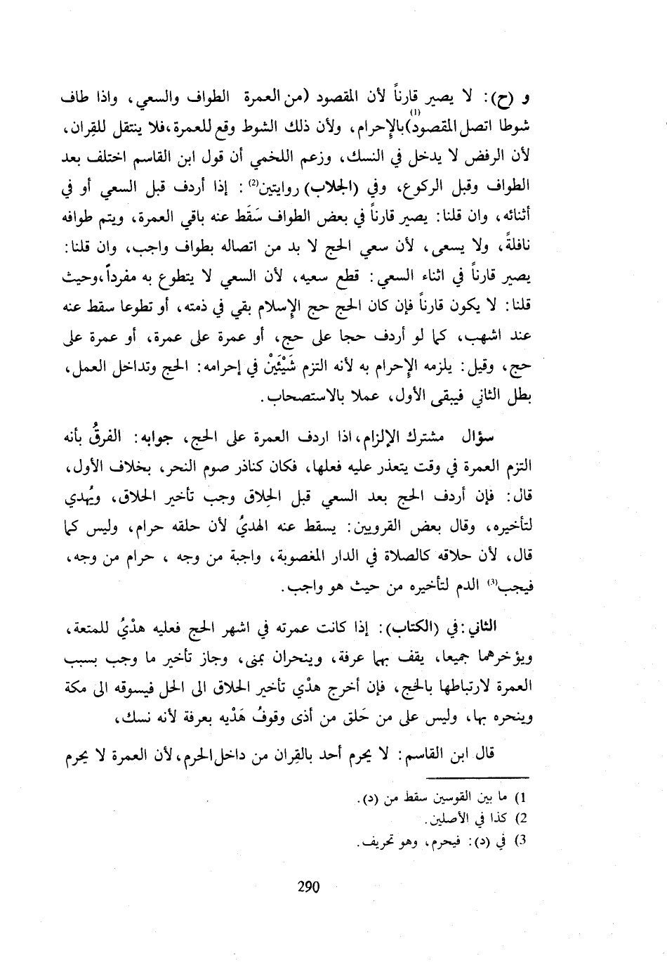 وح لَا يَصِيرُ قَارِنًا لِأَنَّ الْمَقْصُودَ مِنَ الْعُمْرَةِ الطَّوَافُ وَالسَّعْيُ وَإِذَا طَافَ شَوْطًا اتَّصَلَ الْمَقْصُودُ بِالْإِحْرَامِ وَلِأَن ذَلِك الشوط وَقع لِلْعُمْرَةِ فَلَا يَنْتَقِلُ لِلْقِرَانِ لِأَنَّ الرَّفْضَ لَا يَدْخُلُ فِي النُّسُكِ وَزَعَمَ اللَّخْمِيُّ أَنَّ قَوْلَ الْقَاسِمِ اخْتَلَفَ بَعْدَ الطَّوَافِ وَقَبْلَ الرُّكُوعِ وَفِي الْجُلَّابِ رِوَايَتَيْنِ إِذَا أَرْدَفَ قَبْلَ السَّعْيِ أَوْ فِي أَثْنَائِهِ وَإِنْ قُلْنَا يَصِيرُ قَارِنًا فِي بعض الطّواف سقط عَنهُ بَاقِي الْعمرَة وينم طَوَافَهُ نَافِلَةً وَلَا يَسْعَى لِأَنَّ سَعْيَ الْحَجِّ لَا بُدَّ مِنِ اتِّصَالِهِ بِطَوَافٍ وَاجِبٍ وَإِنْ قُلْنَا يَصِيرُ قَارِنًا فِي أَثْنَاءِ السَّعْيِ قَطَعَ سَعْيه لِأَن السَّعْي لَا يتَطَوَّع بِهِ مُنْفَردا وَحَيْثُ قُلْنَا لَا يَكُونُ قَارِنًا فَإِنْ كَانَ الْحَجُّ حَجَّ الْإِسْلَامِ بَقِيَ فِي ذِمَّتِهِ أَوْ تَطَوُّعًا سَقَطَ عَنْهُ عِنْدَ أَشْهَبَ كَمَا لَوْ أَرْدَفَ حَجًّا عَلَى حَجٍّ أَوْ عُمْرَةً عَلَى عمْرَة أَو عمْرَة على حج يَلْزَمُهُ الْإِحْرَامُ بِهِ لِأَنَّهُ الْتَزَمَ شَيْئَيْنِ فِي إِحْرَامه الْحَج وتداخل الْعَمَل بَطل الثَّانِي فَيَبْقَى الْأَوَّلُ عَمَلًا بِالِاسْتِصْحَابِ سُؤَالٌ مُشْتَرَكُ الْإِلْزَامِ إِذَا أَرْدَفَ الْعُمْرَةَ عَلَى الْحَجِّ جَوَابُهُ الْفَرْقُ بِأَنَّهُ الْتَزَمَ الْعُمْرَةَ فِي وَقْتٍ يَتَعَذَّرُ عَلَيْهِ فِعْلُهَا فَكَانَ كَنَاذِرِ صَوْمِ النَّحْرِ بِخِلَافِ الْأَوَّلِ قَالَ فَإِنْ أَرْدَفَ الْحَجَّ بَعْدَ السَّعْيِ قَبْلَ الْحِلَاقِ وَجَبَ تَأْخِيرُ الْحِلَاقِ وَيُهْدِي لِتَأْخِيرِهِ وَقَالَ بَعْضُ الْقَرَوِيِّينَ يَسْقُطُ عَنْهُ الْهَدْيُ لِأَنَّ حَلْقَهُ حَرَامٌ وَلَيْسَ كَمَا قَالَ لِأَنَّ حِلَاقَهُ كَالصَّلَاةِ فِي الدَّارِ الْمَغْصُوبَةِ وَاجِبَةٌ مِنْ وَجْهٍ حرَام مِنْ وَجْهٍ فَيَجِبُ الدَّمُ لِتَأْخِيرِهِ مِنْ حَيْثُ هُوَ وَاجِبٌ الثَّانِي فِي الْكِتَابِ إِذَا كَانَتْ عُمْرَتُهُ فِي أَشْهُرِ الْحَجِّ فَعَلَيْهِ هَدْيٌ لِلْمُتْعَةِ وَيُؤَخِّرُهُمَا جَمِيعًا يَقِفُ بِهِمَا عَرَفَةَ وَيُنْحَرَانِ بِمِنًى وَجَازَ تَأْخِيرُ مَا وَجَبَ بِسَبَبِ الْعُمْرَةِ لِارْتِبَاطِهَا بِالْحَجِّ فَإِنْ أَخْرَجَ هَدْيَ تَأْخِيرِ الْحِلَاقِ إِلَى الْحِلِّ فَيَسُوقُهُ إِلَى مَكَّةَ وَيَنْحَرُهُ بِهَا وَلَيْسَ عَلَى مَنْ حَلَقَ مِنْ أَذَى وُقُوفِ هَدْيِهِ بِعَرَفَةَ لِأَنَّهُ نُسُكٌ قَالَ ابْنُ الْقَاسِمِ لَا يُحْرِمُ أَحَدٌ بِالْقِرَانِ مِنْ دَاخِلِ الْحَرَمِ لِأَنَّ الْعُمْرَةَ لَا يُحْرَمُ