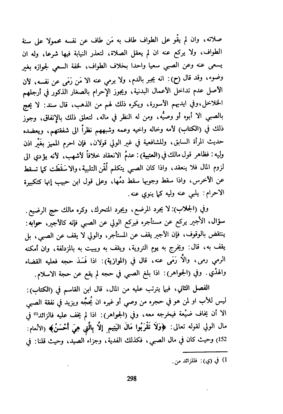 صَلَاتِهِ وَإِنْ لَمْ يَقْوَ عَلَى الطَّوَافِ طَافَ بِهِ مَنْ طَافَ عَنْ نَفْسِهِ مَحْمُولًا عَلَى سُنَّةِ الطَّوَافِ وَلَا يَرْكَعُ عَنْهُ إِنْ لَمْ يَعْقِلِ الصَّلَاةَ لِتَعَذُّرِ النِّيَابَةِ فِيهَا شَرْعًا وَلَهُ أَنْ يَسْعَى عَنْهُ وَعَنِ الصَّبِيِّ سَعْيًا وَاحِدًا بِخِلَافِ الطَّوَافِ لِخِفَّةِ السَّعْيِ لِجَوَازِهِ بِغَيْرِ وُضُوءٍ وَقَدْ قَالَ ح إِنَّهُ يُجْبَرُ بِالدَّمِ وَلَا يَرْمِي عَنْهُ إِلَّا مَنْ رَمَى عَنْ نَفْسِهِ لِأَنَّ الْأَصْلَ عَدَمُ تَدَاخُلِ الْأَعْمَالِ الْبَدَنِيَّةِ وَيَجُوزُ الْإِحْرَامُ بِالصِّغَارِ الذُّكُورِ فِي أَرْجُلِهِمُ الْخَلَاخِلُ وَفِي أَيْديهم الإسورة ذَلِكَ لَهُمْ مِنَ الذَّهَبِ قَالَ سَنَدٌ لَا يَحُجُّ بِالصَّبِيُّ إِلَّا أَبُوهُ أَوْ وَصِيُّهُ وَمَنْ لَهُ النَّظَرُ فِي مَالِهِ لِتَعَلُّقِ ذَلِكَ بِالْإِنْفَاقِ وَجَوَّزَ ذَلِكَ فِي الْكِتَابِ لِأُمِّهِ وَخَالِهِ وَأَخِيهِ وَعَمِّهِ وَشِبْهِهِمْ نَظَرًا إِلَى شَفَقَتِهِمْ وَيُعَضِّدُهُ حَدِيثُ الْمَرْأَةِ السَّابِقُ وَلِلشَّافِعِيَّةِ فِي غَيْرِ الْوَلِيِّ قَوْلَانِ فَإِنْ أَحْرَمَ الْمُمَيِّزُ بِغَيْرِ إِذْنِ وَلَيِّهِ فَظَاهَرُ قَوْلِ مَالِكٍ فِي الْعُتْبِيَّةِ عَدَمُ الِانْعِقَادِ خِلَافًا لِأَشْهَبَ لِأَنَّهُ يُؤَدِّي إِلَى لُزُومِ الْمَالِ فَلَا يَنْعَقِدُ وَإِذَا كَانَ الصَّبِيُّ يَتَكَلَّمُ لُقِّنَ التَّلْبِيَةَ وَإِلَّا سَقَطَتْ كَمَا تَسْقُطُ عَنِ الْأَخْرَسِ وَإِذَا سَقَطَ وُجُوبُهَا سَقَطَ دَمُهَا وَعَلَى قَوْلِ ابْنِ حَبِيبٍ إِنَّهَا كَتَكْبِيرَةِ الْإِحْرَامِ يُلَبِّي عَنْهُ وَلَيُّهُ كَمَا يَنْوِي عَنْهُ وَفِي الْجُلَّابِ لَا يُجَرَّدُ الْمُرْضَعُ وَيُجَرَّدُ الْمُتَحَرِّكُ وَكَرِهَ مَالِكٌ حَجَّ الرَّضِيعِ سُؤَالٌ الْأَجِيرُ يَرْكَعُ عَنْ مُسْتَأْجِرِهِ فَيَرْكَعُ الْوَلِيُّ عَن الصَّبِي فَإِنَّهُ كالأجير حوابه يَنْتَقِضُ بِالْوُقُوفِ فَإِنَّ الْأَجِيرَ يَقِفُ عَنِ الْمُسْتَأْجِرِ وَالْوَلِيُّ لَا يَقِفُ عَنِ الصَّبِيِّ بَلْ يَقِفُ بِهِ قَالَ وَيَخْرُجُ بِهِ يَوْمَ التَّرْوِيَةِ وَيَقِفُ بِهِ وَيَبِيتُ بِهِ بِالْمُزْدَلِفَةِ وَإِنْ أَمْكَنَهُ الرَّمْيُ رَمَى وَإِلَّا رَمَى عَنْهُ قَالَ فِي الْمَوَّازِيَّةِ إِذَا فَسَدَ حَجُّهُ فَعَلَيْهِ الْقَضَاءُ وَالْهَدْيُ وَفِي الْجَوَاهِرِ إِذَا بَلَغَ الصَّبِيُّ فِي حَجِّهِ لَمْ يَقَعْ عَنْ حَجَّةِ الْإِسْلَامِ الْفَصْلُ الثَّانِي فِيمَا يَتَرَتَّبُ عَلَيْهِ مِنَ الْمَالِ قَالَ ابْنُ الْقَاسِمِ فِي الْكِتَابِ لَيْسَ لِلْأَبِ أَوْ لِمَنْ هُوَ فِي حِجْرِهِ مِنْ وَصِيٍّ أَوْ غَيْرِهِ أَنْ يُحِجَّهُ وَيَزِيدَ فِي نَفَقَةِ الصَّبِيِّ إِلَّا أَنْ يخَاف ضيعه فَيُخْرِجَهُ مَعَهُ وَفِي الْجَوَاهِرِ إِذَا لَمْ يَخَفْ عَلَيْهِ فَالزَّائِدُ فِي مَالِ الْوَلِيِّ لِقَوْلِهِ تَعَالَى {وَلا تَقْرَبُوا مَالَ الْيَتِيمِ إِلا بِالَّتِي هِيَ أَحْسَنُ} الْأَنْعَام 152 وَحَيْثُ كَانَ فِي مَالِ الصَّبِيِّ فَكَذَلِكَ الْفِدْيَةُ وَجَزَاءُ الصَّيْدِ وَحَيْثُ قُلْنَا فِي