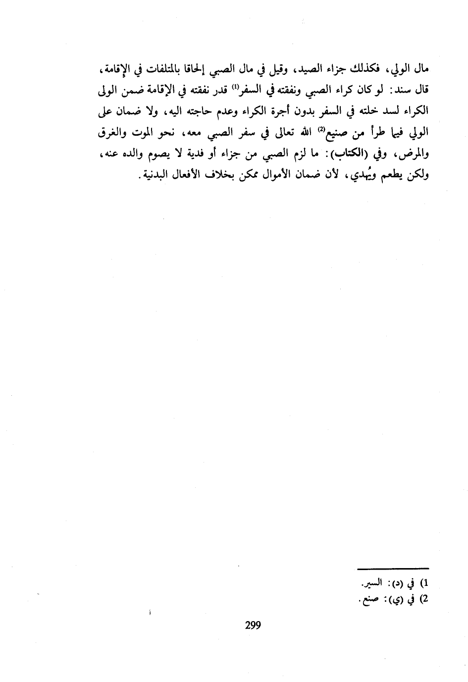 مَالِ الْوَلِيِّ فَكَذَلِكَ جَزَاءُ الصَّيْدِ وَقِيلَ فِي مَالِ الصَّبِيِّ إِلْحَاقًا بِالْمَتْلَفَاتِ فِي الْإِقَامَةِ قَالَ سَنَد لَو كَانَ كِرَاء الصَّبِيِّ وَنَفَقَتُهُ فِي السَّفَرِ قَدْرَ نَفَقَتِهِ فِي الْإِقَامَةِ ضَمِنَ الْوَلِيُّ الْكِرَاءَ لَسَدِّ خَلَّتِهِ فِي السَّفَرِ بِدُونِ أُجْرَةِ الْكِرَاءِ وَعَدَمِ حَاجَتِهِ إِلَيْهِ وَلَا ضَمَانَ عَلَى الْوَلِيِّ فِيمَا طَرَأَ مِنْ صَنِيعِ اللَّهِ تَعَالَى فِي سَفَرِ الصَّبِيِّ مَعَهُ نَحْوَ الْمَوْتِ وَالْغَرَقِ وَالْمَرَضِ وَفِي الْكِتَابِ مَا لَزِمَ الصَّبِيَّ مِنْ جَزَاءٍ أَوْ فِدْيَةٍ لَا يَصُومُ وَالِدُهُ عَنْهُ وَلَكِنْ يُطْعِمُ وَيُهْدِي لِأَنَّ ضَمَان الْأَمْوَال مُمكن بِخِلَاف الْأَفْعَال الْبَدَنِيَّة