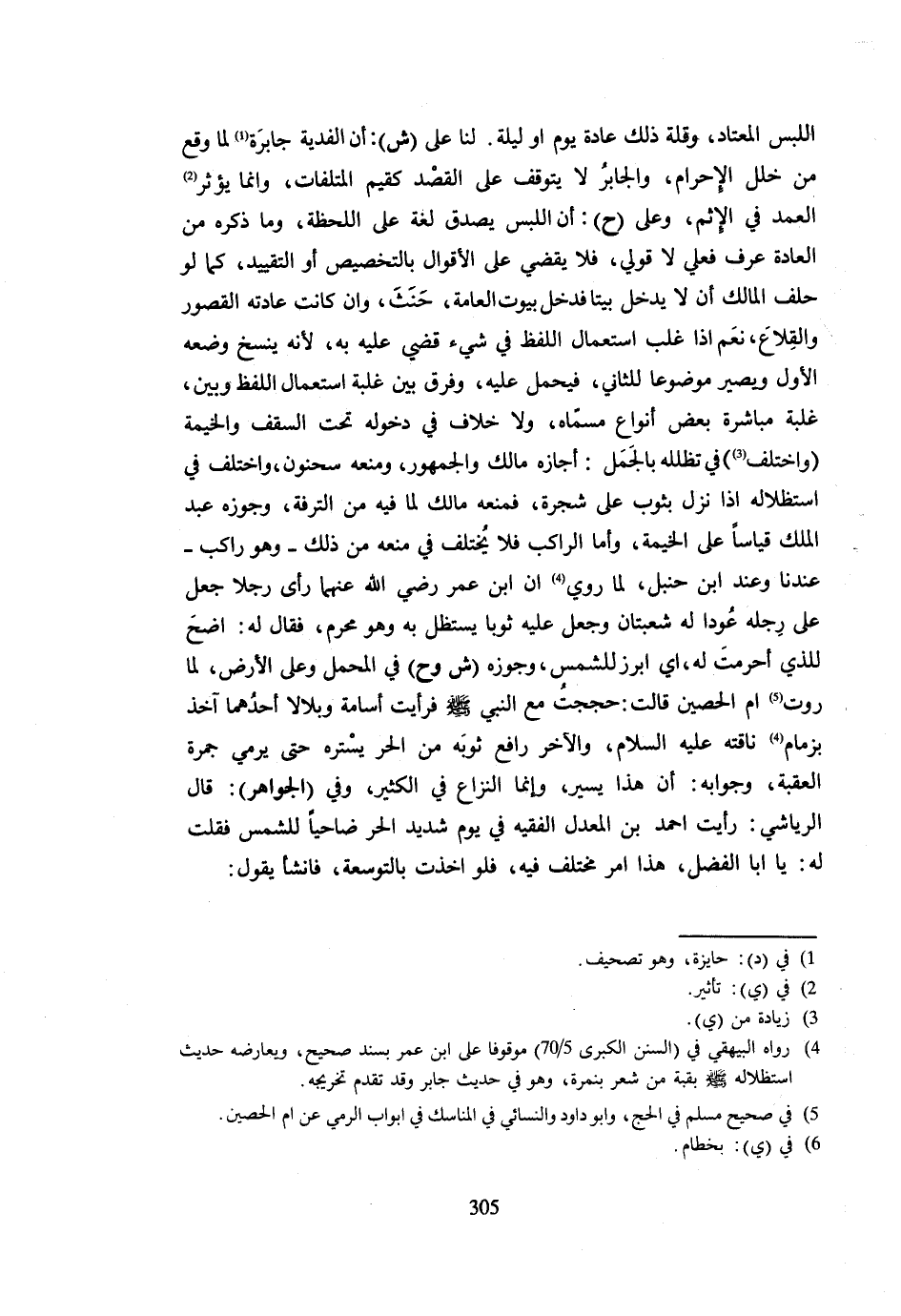 اللُّبْسِ الْمُعْتَادِ وَقِلَّةُ ذَلِكَ عَادَةً يَوْمٌ أَوْ لَيْلَةٌ لَنَا عَلَى ش أَنَّ الْفِدْيَةَ جَابِرَةٌ لِمَا وَقَعَ مِنْ خَلَلِ الْإِحْرَامِ وَالْجَابِرُ لَا يَتَوَقَّفُ عَلَى الْقَصْدِ كَقِيَمِ الْمُتْلَفَاتِ وَإِنَّمَا يُؤَثِّرُ الْعَمْدُ فِي الْإِثْمِ وَعَلَى ح أَنَّ اللُّبْسَ يَصْدُقُ لُغَةً عَلَى اللَّحْظَةِ وَمَا ذَكَرَهُ مِنَ الْعَادَةِ عُرْفٌ فِعْلِيٌّ لَا قَوْلِيٌّ فَلَا يَقْضِي عَلَى الْأَقْوَالِ بِالتَّخْصِيصِ أَوِ التَّقْيِيدِ كَمَا لَوْ حَلَفَ الْمَالِكُ أَنْ لَا يَدْخُلَ بَيْتًا فَدَخَلَ بُيُوتَ الْعَامَّةِ حَنِثَ وَإِنْ كَانَتْ عَادَتُهُ الْقُصُورَ وَالْقِلَاعَ نَعَمْ إِذَا غَلَبَ اسْتِعْمَالُ اللَّفْظِ فِي شَيْءٍ قُضِيَ عَلَيْهِ بِهِ لِأَنَّهُ يَنْسَخُ وَضْعَهُ الْأَوَّلَ وَيَصِيرُ مَوْضُوعًا لِلثَّانِي فَيُحْمَلُ عَلَيْهِ وَفَرْقٌ بَيْنَ غَلَبَةِ اسْتِعْمَالِ اللَّفْظِ وَبَيْنَ غَلَبَةِ مُبَاشَرَةِ بعض أَنْوَاع مُسَمَّاهُ وَلَا خلاف فِي دُخُول تَحْتَ السَّقْفِ وَالْخَيْمَةِ وَاخْتُلِفَ فِي تَظَلُّلِهِ بِالْجَمَلِ أَجَازَهُ مَالِكٌ وَالْجُمْهُورُ وَمَنَعَهُ سَحْنُونٌ وَاخْتُلِفَ فِي استظلاله إِذا نزل فِي بِثَوْبٍ عَلَى شَجَرَةٍ فَمَنَعَهُ مَالِكٌ لِمَا فِيهِ مِنَ التَّرَفُّهِ وَجَوَّزَهُ عَبْدُ الْمَلِكِ قِيَاسًا عَلَى الْخَيْمَةِ وَأَمَّا الرَّاكِبُ فَلَا يُخْتَلَفُ فِي مَنْعِهِ مِنْ ذَلِكَ وَهُوَ رَاكِبٌ عِنْدَنَا وَعِنْدَ ابْنِ حَنْبَلٍ لِمَا رُوِيَ أَنَّ ابْنَ عُمَرَ رَضِيَ اللَّهُ عَنْهُمَا رَأَى رجلا جعل على رجله عودا لَهُ شعبتان وَجَعَلَ عَلَيْهِ ثَوْبًا يَسْتَظِلُّ بِهِ وَهُوَ مُحْرِمٌ فَقَالَ لَهُ اضْحَ لِلَّذِي أَحْرَمْتَ لَهُ أَيْ ابرز للشمس وَجوزهُ ش وح فِي الْمَحْمَلِ وَعَلَى الْأَرْضِ لِمَا رَوَتْ أُمُّ الْحصين فَقَالَت حَجَجْتُ مَعَ النَّبِيِّ - صَلَّى اللَّهُ عَلَيْهِ وَسَلَّم َ - فَرَأَيْت أُسَامَة وبلال أَحدهمَا آخذ بزمام نَاقَته - صَلَّى اللَّهُ عَلَيْهِ وَسَلَّم َ - وَالْآخَرُ رَافِعٌ ثَوْبَهُ مِنَ الْحَرِّ يَسْتُرُهُ حَتَّى يَرْمِيَ جَمْرَةَ الْعَقَبَةِ وَجَوَابُهُ أَنَّ هَذَا يَسِيرُ وَإِنَّمَا النِّزَاعُ فِي الْكَثِيرِ وَفِي الْجَوَاهِرِ قَالَ الرِّيَاشِيُّ رَأَيْتُ أَحْمَدَ بْنَ الْمُعَدَّلِ الْفَقِيهُ فِي يَوْمٍ شَدِيدِ الْحَرِّ ضَاحِيًا لِلشَّمْسِ فَقُلْتُ لَهُ يَا أَبَا الْفَضْلِ هَذَا أَمْرٌ مُخْتَلَفٌ فِيهِ فَلَوْ أَخَذْتَ بِالتَّوْسِعَةِ فَأَنْشَأَ يَقُولُ