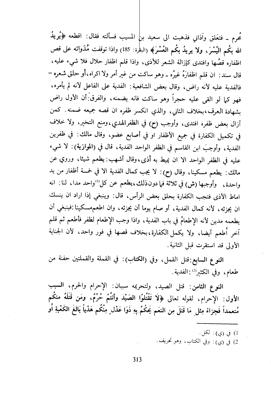 محرم فَتعلق آذَانِي فَذَهَبْتُ إِلَى سَعِيدِ بْنِ الْمُسَيِّبِ فَسَأَلْتُهُ فَقَالَ اقْطَعْهُ {يُرِيدُ اللَّهُ بِكُمُ الْيُسْرَ وَلا يُرِيدُ بِكُمُ الْعُسْرَ} الْبَقَرَة 185 وَإِذَا تَوَقَّفَتْ مُدَوَاتُهُ عَلَى قصّ أَظْفَاره قصها وَافْتَدَى كَإِزَالَةِ الشَّعْرِ لِلْأَذَى وَإِذَا قَلَّمَ أَظْفَارَ حَلَالٍ فَلَا شَيْءَ عَلَيْهِ قَالَ سَنَدٌ إِنْ قَلَّمَ أَظْفَارَهُ غَيْرُهُ وَهُوَ سَاكِتٌ مِنْ غَيْرِ أَمْرٍ وَلَا إِكْرَاهٍ أَوْ حَلَقَ شَعْرَهُ فَالْفِدْيَةُ عَلَيْهِ لِأَنَّهُ رَاضٍ وَقَالَ بَعْضُ الشَّافِعِيَّةِ الْفِدْيَةُ عَلَى الْفَاعِلِ لِأَنَّهُ لَمْ يَأْمُرْهُ فَهُوَ كَمَا لَوْ أَلْقَى عَلَيْهِ حَجَرًا وَهُوَ سَاكِتٌ فَإِنَّهُ يَضْمَنُهُ وَالْفَرْقُ أَنَّ الْأَوَّلَ رَاضٍ بِشَهَادَةِ الْعُرْفِ بِخِلَافِ الثَّانِي وَالَّذِي انْكَسَرَ ظُفُرُهُ إِنْ قَصَّهُ جَمِيعَهُ ضَمِنَهُ كَمَنْ أَزَالَ بَعْضَ ظُفُرِهِ افْتَدَى وَأوجب ح فِي اظفر الْهَدْيَ وَمَنَعَ التَّخَيُّرَ وَلَا خِلَافَ فِي تَكْمِيلِ الْكَفَّارَةِ فِي جَمِيعِ الْأَظْفَارِ أَوْ فِي أَصَابِعِ عُضْوٍ وَقَالَ مَالِكٌ فِي ظُفُرَيْنِ الْفِدْيَةُ وَأَوْجَبَ ابْنُ الْقَاسِمِ فِي الظُّفُرِ الْوَاحِدِ الْفِدْيَةَ قَالَ فِي الْمَوَّازِيَّةِ لَا شَيْءَ عَلَيْهِ فِي الظُّفُرِ الْوَاحِدِ إِلَّا أَنْ يُمِيطَ بِهِ أَذًى وَقَالَ أَشْهَبُ يُطْعِمُ شَيْئًا وَرُوِيَ عَنْ مَالِكٍ يُطْعِمُ مِسْكِينًا وَقَالَ ح لَا يَجِبُ كَمَالُ الْفِدْيَةِ إِلَّا فِي خَمْسَةِ أَظْفَارٍ مِنْ يَدٍ وَاحِدَةٍ وَأَوْجَبَهَا ش فِي ثَلَاثَةٍ فَمَا دُونَ ذَلِكَ يُطْعِمُ عَنْ كُلِّ وَاحِدٍ مُدًّا لَنَا أَنَّهُ أَمَاطَ الْأَذَى فَتَجِبُ الْكَفَّارَةُ بِحَلْقِ بَعْضِ الرَّأْسِ قَالَ وَيَنْبَغِي إِذَا أَرَادَ أَنْ يَنْسِكَ أَنْ يُجْزِئَهُ لِأَنَّهُ كَمَالُ الْفِدْيَةِ أَوْ صَامَ يَوْمًا أَنْ يُجْزِئَهُ وَإِنْ أَطْعَمَ مِسْكِينًا فَيَنْبَغِي أَنْ يُطْعِمَهُ مُدَّيْنِ لِأَنَّهُ الْإِطْعَامُ فِي بَابِ الْفِدْيَةِ وَإِذَا وَجَبَ الْإِطْعَامُ لِظُفُرٍ فَأَطْعَمَ ثُمَّ قَلَّمَ آخَرَ أَطْعَمَ أَيْضًا وَلَا يُكْمِلُ الْكَفَّارَةَ بِخِلَافِ قَصِّهَا فِي فَوْرٍ وَاحِدٍ لِأَنَّ الْجِنَايَةَ الْأُولَى قَدِ اسْتَقَرَّتْ قَبْلَ الثَّانِيَةِ النَّوْعُ السَّابِعُ قَتْلُ الْقُمَّلِ وَفِي الْكِتَابِ فِي الْقَمْلَةِ وَالْقَمْلَتَيْنِ حَفْنَةٌ مِنْ طَعَامٍ وَفِي الْكَثِيرِ الْفِدْيَةُ النَّوْعُ الثَّامِنُ قتل الصَّيْد ولتحريمه سببان وَالْإِحْرَام وَالْحَرَمُ السَّبَبُ الْأَوَّلُ الْإِحْرَامُ لِقَوْلِهِ تَعَالَى {لَا تَقْتُلُوا الصَّيْدَ وَأَنْتُمْ حُرُمٌ وَمَنْ قَتَلَهُ مِنْكُمْ مُتَعَمِّدًا فَجَزَاءٌ مِثْلُ مَا قَتَلَ مِنَ النَّعَمِ يَحْكُمُ بِهِ ذَوَا عَدْلٍ مِنْكُمْ هَدْيًا بَالِغَ الْكَعْبَةِ أَوْ