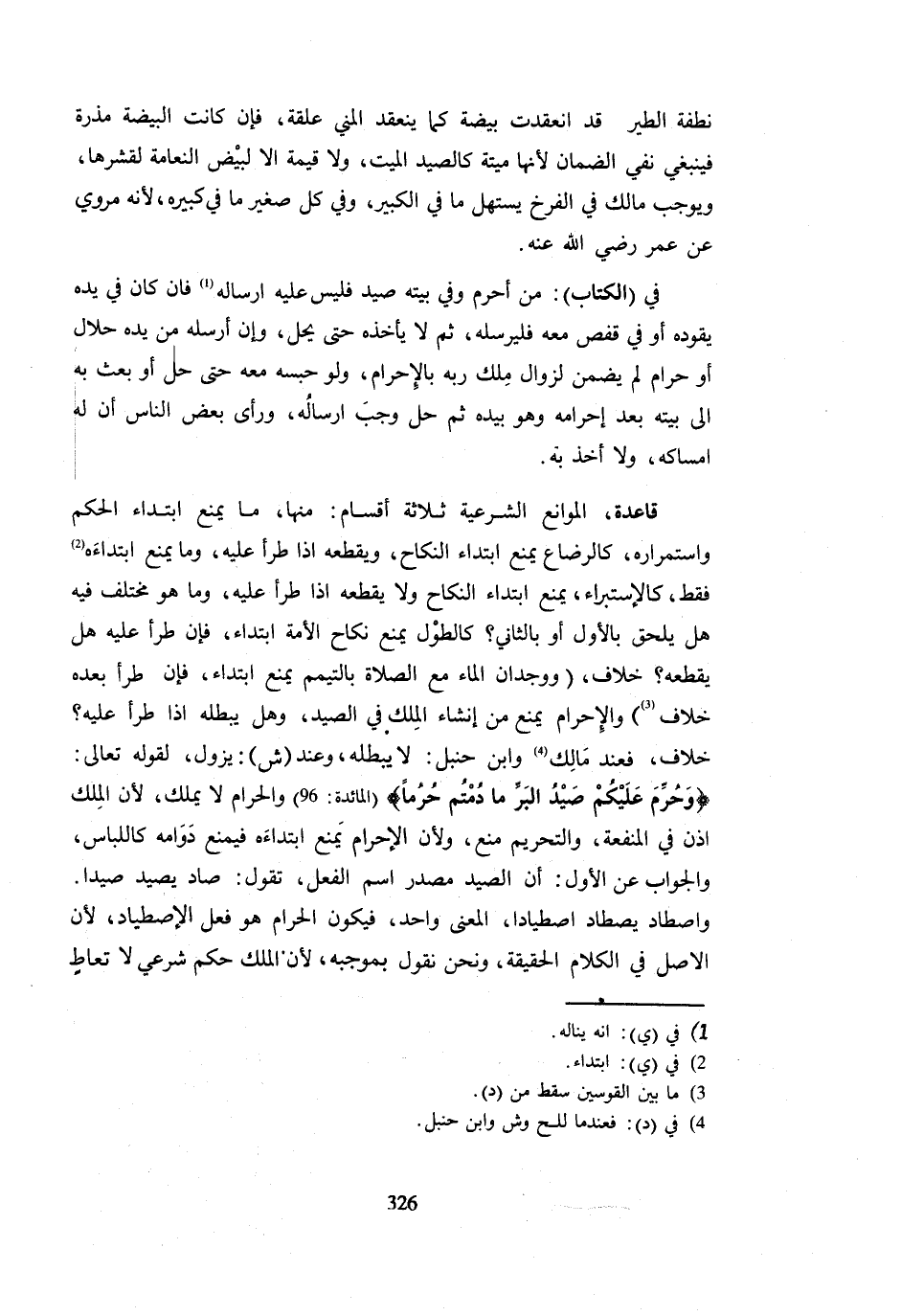 نُطْفَةَ الطَّيْرِ قَدِ انْعَقَدَتْ بَيْضَةً كَمَا يَنْعَقِدُ الْمَنِيُّ عَلَقَةً فَإِنْ كَانَتِ الْبَيْضَةُ مَذِرَةً فَيَنْبَغِي نَفْيُ الضَّمَانِ لِأَنَّهَا مَيِّتَةٌ كَالصَّيْدِ الْمَيِّتِ وَلَا قِيمَةَ إِلَّا لِبَيْضِ النَّعَامَةِ لِقِشْرِهَا وَيُوجِبُ مَالِكٌ فِي الْفَرْخِ يَسْتَهِلُّ مَا فِي الْكَبِيرِ وَفِي كُلِّ صَغِيرٍ مَا فِي كَبِيرِهِ لِأَنَّهُ مَرْوِيٌّ عَنْ عُمَرَ رَضِيَ اللَّهُ عَنْهُ فِي الْكِتَابِ مَنْ أَحْرَمَ وَفِي بَيْتِهِ صَيْدٌ فَلَيْسَ عَلَيْهِ إِرْسَالُهُ فَإِنْ كَانَ فِي يَدِهِ يَقُودُهُ أَوْ فِي قَفَصٍ مَعَهُ فَلْيُرْسِلْهُ ثُمَّ لَا يَأْخُذُهُ حَتَّى يُحِلَّ وَإِنْ أَرْسَلَهُ مِنْ يَدِهِ حَلَالٌ أَوْ حَرَامٌ لَمْ يَضْمَنْ لِزَوَالِ مِلْكِ رَبِّهِ بِالْإِحْرَامِ وَلَوْ حَبَسَهُ مَعَهُ حَتَّى حَلَّ أَوْ بَعَثَ بِهِ إِلَى بَيْتِهِ بَعْدَ إِحْرَامِهِ وَهُوَ بِيَدِهِ ثُمَّ حَلَّ وَجَبَ إِرْسَالُهُ وَرَأَى بَعْضُ النَّاسِ أَنَّ لَهُ إِمْسَاكَهُ وَلَا أَخْذَ بِهِ قَاعِدَةٌ الْمَوَانِعُ الشَّرْعِيَّةُ ثَلَاثَةِ أَقْسَامٍ مِنْهَا مَا يَمْنَعُ ابْتِدَاءَ الْحُكْمِ وَاسْتِمْرَارَهُ كَالرَّضَاعِ يَمْنَعُ ابْتِدَاءَ النِّكَاحِ وَيَقْطَعُهُ إِذَا طَرَأَ عَلَيْهِ وَمَا يَمْنَعُ ابْتِدَاءَهُ فَقَطْ كَالِاسْتِبْرَاءِ يَمْنَعُ ابْتِدَاءَ النِّكَاحِ وَلَا يَقْطَعُهُ إِذَا طَرَأَ عَلَيْهِ وَمَا هُوَ مُخْتَلَفٌ فِيهِ هَلْ يُلْحَقُ بِالْأَوَّلِ أَوْ بِالثَّانِي كَالطَّوْلِ يمْنَع نِكَاح الْأمة ابْتِدَاء فَإِن طَرَأَ عَلَيْهِ هَلْ يَقْطَعُهُ خِلَافٌ وَوِجْدَانُ الْمَاءِ مَعَ الصَّلَاةِ بِالتَّيَمُّمِ يَمْنَعُ ابْتِدَاءَ فَإِنْ طَرَأَ بَعْدَهُ خِلَافٌ وَالْإِحْرَامُ يَمْنَعُ مِنْ إِنْشَاءِ الْمِلْكِ فِي الصَّيْدِ وَهَلْ يُبْطِلُهُ إِذَا طَرَأَ عَلَيْهِ خِلَافٌ فَعِنْدَ مَالك وَابْنِ حَنْبَلٍ لَا يُبْطِلُهُ وَعِنْدَ ش يَزُولُ لِقَوْلِهِ تَعَالَى {وَحُرِّمَ عَلَيْكُمْ صَيْدُ الْبَرِّ مَا دُمْتُمْ حُرُمًا} الْمَائِدَة 96 وَالْحَرَامُ لَا يُمْلَكُ لِأَنَّ الْمِلْكَ إِذْنٌ فِي الْمَنْفَعَةِ وَالتَّحْرِيمُ مَنْعٌ وَلِأَنَّ الْإِحْرَامَ يَمْنَعُ ابْتِدَاءَهُ فَيَمْنَعُ دَوَامَهُ كَاللِّبَاسِ وَالْجَوَابُ عَنِ الْأَوَّلِ أَنَّ الصَّيْدَ مَصْدَرُ اسْمِ الْفِعْلِ تَقُولُ صَادَ يَصِيدُ صَيْدًا وَاصْطَادَ يَصْطَادُ اصْطِيَادًا الْمَعْنَى وَاحِدٌ فَيَكُونُ الْحَرَامُ هُوَ فِعْلَ الِاصْطِيَادِ لِأَنَّ الْأَصْلَ فِي الْكَلَامِ الْحَقِيقَةُ وَنَحْنُ نَقُولُ بِمُوجِبِهِ لِأَنَّ الْمِلْكَ حُكْمٌ شَرْعِيٌّ لَا تَعَاطٍ