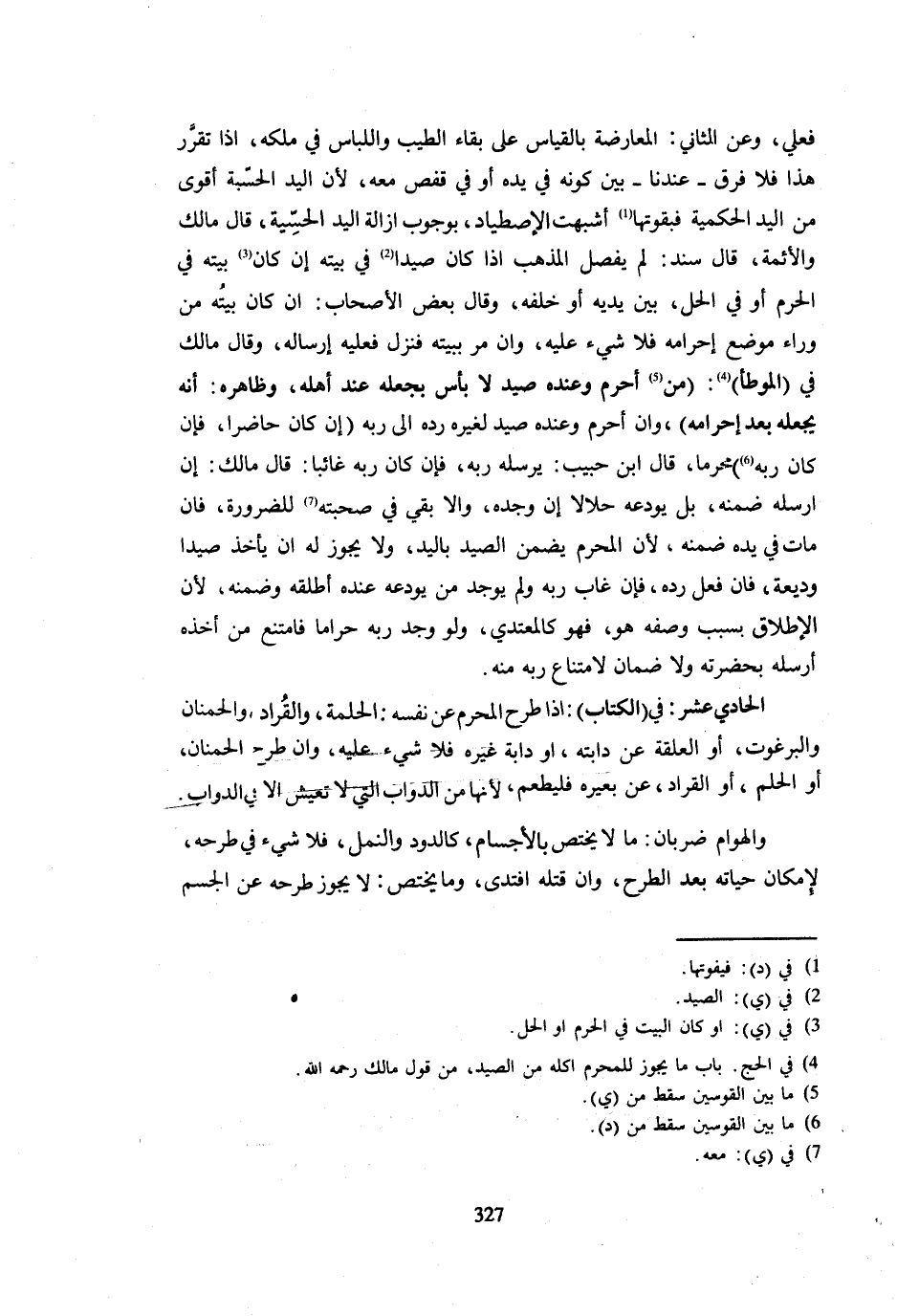 فِعْلِيٍّ وَعَنِ الثَّانِي الْمُعَارَضَةُ بِالْقِيَاسِ عَلَى بَقَاءِ الطِّيبِ وَاللِّبَاسِ فِي مِلْكِهِ إِذَا تَقَرَّرَ هَذَا فَلَا فَرْقَ عِنْدَنَا بَيْنَ كَوْنِهِ فِي يَدِهِ أَو فِي قفص مَعَه لِأَن الْيَد الْحِسْبَة أَقْوَى مِنَ الْيَدِ الْحُكْمِيَّةِ فَبِقُوَّتِهَا أَشْبَهَتِ الِاصْطِيَادَ بِوُجُوب إِزَالَة الْيَد الحسية قَالَ مَالِكٌ وَالْأَئِمَّةُ قَالَ سَنَدٌ لَمْ يُفَصِّلِ الْمَذْهَبُ إِذَا كَانَ صَيْدًا فِي بَيْتِهِ إِنْ كَانَ بَيْتُهُ فِي الْحَرَمِ أَوْ فِي الْحِلِّ بَيْنَ يَدَيْهِ أَوْ خَلْفَهُ وَقَالَ بَعْضُ الْأَصْحَابِ إِنْ كَانَ بَيْتُهُ مِنْ وَرَاءِ مَوْضِعِ إِحْرَامِهِ فَلَا شَيْءَ عَلَيْهِ وَإِنْ مَرَّ بِبَيْتِهِ فَنَزَلَ فَعَلَيْهِ إِرْسَالُهُ وَقَالَ مَالِكٌ فِي الْمُوَطَّأِ مَنْ أَحْرَمَ وَعِنْدَهُ صَيْدٌ لَا بَأْسَ بِجَعْلِهِ عِنْدَ أَهْلِهِ وَظَاهِرُهُ أَنَّهُ يَجْعَلُهُ بَعْدَ إِحْرَامِهِ وَإِنْ أَحْرَمَ وَعِنْدَهُ صَيْدٌ لِغَيْرِهِ رَدَّهُ إِلَى رَبِّهِ إِنْ كَانَ حَاضِرًا فَإِنْ كَانَ رَبُّهُ مُحْرِمًا قَالَ ابْن حبيب يُرْسِلهُ ربه فَإِن كَانَ ربه غَائِبًا قَالَ مَالِكٌ إِنْ أَرْسَلَهُ ضَمِنَهُ بَلْ يُودِعُهُ حَلَالًا إِنْ وَجَدَهُ وَإِلَّا بَقِيَ فِي صُحْبَتِهِ لِلضَّرُورَةِ فَإِنْ مَاتَ فِي يَدِهِ ضَمِنَهُ لِأَنَّ الْمُحْرِمَ يَضْمَنُ الصَّيْدَ بِالْيَدِ وَلَا يَجُوزُ لَهُ أَنْ يَأْخُذَ صَيْدًا وَدِيعَةً فَإِنْ فَعَلَ رَدَّهُ فَإِنْ غَابَ رَبُّهُ وَلَمْ يُوجَدْ مَنْ يودعه عمده أَطْلَقَهُ وَضَمِنَهُ لِأَنَّ الْإِطْلَاقَ بِسَبَبِ وَصْفِهِ هُوَ فَهُوَ كَالْمُعْتَدِي وَلَوْ وَجَدَ رَبُّهُ حَرَامًا فَامْتَنَعَ مِنْ أَخْذِهِ أَرْسَلَهُ بِحَضْرَتِهِ وَلَا ضَمَانَ لِامْتِنَاعِ رَبِّهِ مِنْهُ الْحَادِيَ عَشَرَ فِي الْكِتَابِ إِذَا طَرَحَ الْمُحْرِمُ عَنْ نَفْسِهِ الْحَلَمَةَ وَالْقُرَادَ وَالْحَمْنَانَ والبرغوث أَو الْعلقَة عَنْ دَابَّتِهِ أَوْ دَابَّةِ غَيْرِهِ فَلَا شَيْءَ عَلَيْهِ وَإِن طرح المنان أَوِ الْحَلَمَ أَوِ الْقُرَادَ عَنْ بَعِيرِهِ فَلْيُطْعِمْ لِأَنَّهَا مِنَ الدَّوَابِّ الَّتِي لَا تَعِيشُ إِلَّا فِي الدَّوَابِّ وَالْهَوَامُّ ضَرْبَانِ مَا لَا يَخْتَصُّ بِالْأَجْسَامِ كَالدُّودِ وَالنَّمْلِ فَلَا شَيْءَ فِي طَرْحِهِ لِإِمْكَانِ حَيَاتِهِ بَعْدَ الطَّرْحِ وَإِنْ قَتَلَهُ افْتَدَى وَمَا يَخْتَصُّ لَا يَجُوزُ طَرْحُهُ عَنِ الْجِسْمِ