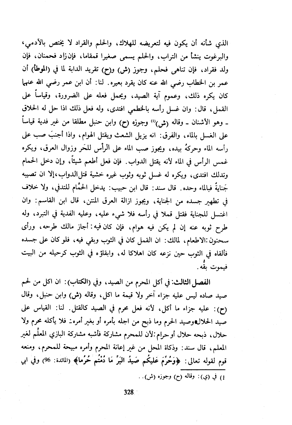 الَّذِي شَأْنه أَن يكون فِيهِ لتعرضه لِلْهَلَاكِ وَالْحَلَمُ وَالْقُرَادُ لَا يَخْتَصُّ بِالْآدَمِيِّ وَالْبُرْغُوثُ يَنْشَأُ مِنَ التُّرَابِ وَالْحَلَمُ يُسَمَّى صَغِيرًا قَمْقَامًا فَإِن زَاد فحمنان فَإِن ولد فقراد فَإِن تناهى فحلم وَجوز ش وح تَقْرِيدَ الدَّابَّةِ لِمَا فِي الْمُوَطَّأِ أَنَّ عُمَرَ بْنَ الْخَطَّابِ رَضِيَ اللَّهُ عَنْهُ كَانَ يُقَرِّدُ بَعِيرَهُ لَنَا أَنَّ ابْنَ عُمَرَ رَضِيَ اللَّهُ عَنْهُمَا كَانَ يَكْرَهُ ذَلِكَ وَعُمُومُ آيَةِ الصَّيْدِ وَيُحْمَلُ فِعْلُهُ عَلَى الضَّرُورَةِ وَقِيَاسًا عَلَى الْقُمَّلِ قَالَ وَإِنْ غَسَلَ رَأْسَهُ بِالْخِطْمَيِّ افْتَدَى وَلَهُ فِعْلُ ذَلِكَ إِذَا حَلَّ لَهُ الْحِلَاقُ وَهُوَ الْأُشْنَانُ وَقَالَهُ ش وَجَوَّزَهُ ح وَابْنُ حَنْبَلٍ مُطْلَقًا مِنْ غَيْرِ فِدْيَةٍ قِيَاسًا عَلَى الْغَسْلِ بِالْمَاءِ وَالْفَرْقُ أَنَّهُ يُزِيلُ الشَّعَثَ وَيَقْتُلُ الْهَوَامَّ وَإِذَا أَجْنَبَ صَبَّ عَلَى رَأْسِهِ الْمَاءَ وَحَرَّكَهُ بِيَدِهِ وَيَجُوزُ صَبُّ الْمَاءِ عَلَى الرَّأْسِ لِلْحَرِّ وَزَوَالِ الْعَرَقِ وَيُكْرَهُ غَمْسُ الرَّأْسِ فِي الْمَاءِ لِأَنَّهُ يَقْتُلُ الدَّوَابَّ فَإِنْ فَعَلَ أَطْعَمَ شَيْئًا وَإِنْ دَخَلَ الْحَمَّامَ وَتَدَلَّكَ افْتَدَى وَيُكْرَهُ لَهُ غَسْلُ ثَوْبِهِ وَثَوْبِ غَيْرِهِ خَشْيَةَ قَتْلِ الدَّوَابِّ إِلَّا أَنْ تُصِيبَهُ جَنَابَةٌ فَبِالْمَاءِ وَحْدَهُ قَالَ سَنَدٌ قَالَ ابْنُ حَبِيبٍ يَدْخُلُ الْحَمَّامَ لِلتَّدَفِّي وَلَا خِلَافَ فِي تَطْهِيرِ جَسَدِهِ مِنَ الْجَنَابَةِ وَيَجُوزُ إِزَالَةُ الْعَرَقِ الْمُنْتِنِ قَالَ ابْنُ الْقَاسِمِ وَإِنِ اغْتَسَلَ لِلْجَنَابَةِ فَقَتَلَ قَمْلًا فِي رَأْسِهِ فَلَا شَيْء عَلَيْهِ وَعَلِيهِ الْفِدْيَة فِي التبريد وَلَهُ طَرْحُ ثَوْبِهِ عَنْهُ إِنْ لَمْ يَكُنْ فِيهِ هَوَامُّ فَإِنْ كَانَ فِيهِ أَجَازَ مَالِكٌ طَرحه وَرَأى أتحنون الْإِطْعَامَ لِمَالِكٍ أَنَّ الْقُمَّلَ كَانَ فِي الثَّوْبِ وَبَقِيَ فِيهِ فَلَوْ كَانَ عَلَى جَسَدِهِ فَأَلْقَاهُ فِي الثَّوْب حِين نَزعه كَانَ هَلَاكًا لَهُ وَإِبْقَاؤُهُ فِي الثَّوْبِ كَرَحِيلِهِ مِنَ الْبَيْتِ فَيَمُوتُ بَقُّهُ الْفَصْلُ الثَّالِثُ فِي أَكْلِ الْمُحْرِمِ مِنَ الصَّيْدِ وَفِي الْكِتَابِ إِنْ أَكَلَ مِنْ لَحْمِ صَيْدٍ صَادَهُ لَيْسَ عَلَيْهِ جَزَاءٌ آخَرُ وَلَا قِيمَةُ مَا أَكَلَ وَقَالَهُ ش وَابْنُ حَنْبَلٍ وَقَالَ ح عَلَيْهِ جَزَاءُ مَا أَكَلَ لِأَنَّهُ فِعْلٌ مُحَرَّمٌ فِي الصَّيْدِ كَالْقَتْلِ لَنَا الْقِيَاسُ عَلَى صَيْدِ الْحَلَالِ وَصَيْدِ الْحُرُمِ وَمَا ذُبِحَ مِنْ أَجْلِهِ بِأَمْرِهِ أَوْ بِغَيْرِ أَمْرِهِ فَلَا يَأْكُلُهُ مُحْرِمٌ وَلَا حَلَالٌ ذَبَحَهُ حَلَالٌ أَوْ حَرَامٌ لِأَنَّ لِلْمُحْرِمِ مُشَارَكَةً فَأَشْبَهَ مُشَارَكَةَ الْبَازِيِّ الْمُعَلَّمِ لِغَيْرِ الْمُعَلَّمِ قَالَ سَنَدٌ وَذَكَاةُ الْمُحِلِّ مِنْ غَيْرِ إِعَانَةِ الْمُحْرِمِ وَأَمْرِهِ مُبِيحَةٌ لِلْمُحْرِمِ وَمَنَعَهُ قَوْمٌ لِقَوْلِهِ تَعَالَى {وَحُرِّمَ عَلَيْكُمْ صَيْدُ الْبَرِّ مَا دُمْتُمْ حُرُمًا} الْمَائِدَة 96 وَفِي أبي