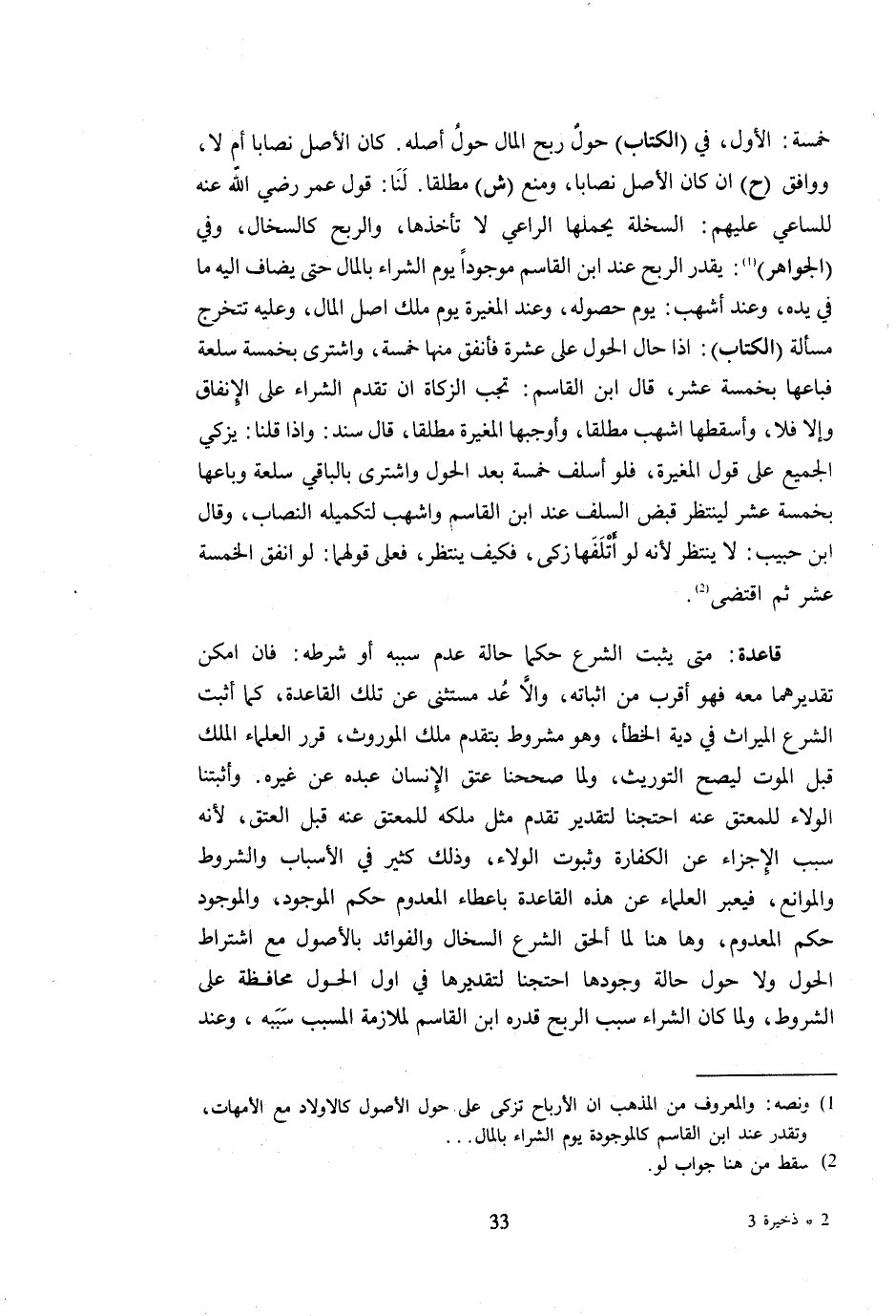 خَمْسَةٌ الْأَوَّلُ فِي الْكِتَابِ حَوْلَ رِبْحِ الْمَالِ حَوْلَ أَصْلِهِ كَانَ الْأَصْلُ نِصَابًا أَمْ لَا وَوَافَقَ (ح) إِنْ كَانَ الْأَصْلُ نِصَابًا وَمَنَعَ (ش) مُطْلَقًا لَنَا قَوْلُ عُمَرَ رَضِيَ اللَّهُ عَنْهُ لِلسَّاعِي عَلَيْهِمْ السَّخْلَةُ يَحْمِلُهَا الرَّاعِي لَا تَأْخُذُهَا وَالرِّبْحُ كَالسِّخَالِ وَفِي الْجَوَاهِرِ يُقَدِّرُ الرِّبْحَ عِنْدَ ابْنِ الْقَاسِمِ مَوْجُودًا يَوْمَ الشِّرَاءِ بِالْمَالِ حَتَّى يُضَافَ إِلَيْهِ مَا فِي يَدِهِ وَعِنْدَ أَشْهَبَ يَوْمَ حُصُولِهِ وَعِنْدَ الْمُغِيرَةِ يَوْمَ مَلِكَ أَصْلَ الْمَالِ وَعَلَيْهِ تَتَخَرَّجُ مَسْأَلَةُ الْكِتَابِ إِذَا حَالَ الْحَوْلُ عَلَى عَشْرَةٍ فَأَنْفَقَ مِنْهَا خَمْسَةً وَاشْتَرَى بِخَمْسَةٍ سِلْعَةً فَبَاعَهَا بِخَمْسَةَ عَشَرَ قَالَ ابْنُ الْقَاسِمِ تَجِبُ الزَّكَاةُ إِنْ تَقَدَّمَ الشِّرَاءُ عَلَى الْإِنْفَاقِ وَإِلَّا فَلَا وَأَسْقَطَهَا أَشْهَبُ مُطْلَقًا وَأَوْجَبَهَا الْمُغِيرَةُ مُطْلَقًا قَالَ سَنَدٌ وَإِذَا قُلْنَا يُزَكِّي الْجَمِيعَ عَلَى قَوْلِ الْمُغِيرَةِ فَلَوْ أَسْلَفَ خَمْسَةً بَعْدَ الْحَوْلِ وَاشْتَرَى بِالْبَاقِي سِلْعَةً وَبَاعَهَا بِخَمْسَةَ عَشَرَ لِيَنْتَظِرَ قَبْضَ السَّلَفِ عِنْدَ ابْنِ الْقَاسِمِ وَأَشْهَبَ لِتَكْمِيلِهِ النِّصَابَ وَقَالَ ابْنُ حَبِيبٍ لَا يَنْتَظِرُ لِأَنَّهُ لَوْ أَتْلَفَهَا زَكَّى فَكَيْفَ ينْتَظر فعلى قَوْلهَا لَوْ أَنْفَقَ الْخَمْسَةَ عَشَرَ ثُمَّ اقْتَضَى قَاعِدَةٌ مَتَى يُثْبِتُ الشَّرْعُ حُكْمَا حَالَةِ عَدَمِ سَبَبِهِ أَوْ شَرْطِهِ فَإِنْ أَمْكَنَ تَقْدِيرُهُمَا مَعَهُ فَهُوَ أَقْرَبُ مِنْ إِثْبَاتِهِ وَإِلَّا عُدَّ مُسْتَثْنَى عَنْ تِلْكَ الْقَاعِدَةِ كَمَا أَثْبَتَ الشَّرْعُ الْمِيرَاثَ فِي دِيَةِ الْخَطَأِ وَهُوَ مَشْرُوطٌ بِتَقَدُّمِ مِلْكَ الْمَوْرُوثِ قَرَّرَ الْعُلَمَاءُ الْمَلِكَ قَبْلَ الْمَوْتِ لِيَصِحَّ التَّوْرِيثُ وَلِمَا صَحَّحْنَا عِتْقَ الْإِنْسَانِ عَبْدَهُ عَنْ غَيْرِهِ وَأَثْبَتْنَا الْوَلَاءَ لِلْمُعْتِقِ عَنْهُ احْتَجْنَا لِتَقْدِيرِ تَقَدُّمٍ مِثْلَ مِلْكِهِ لِلْمُعْتَقِ عَنْهُ قَبْلَ الْعِتْقِ لِأَنَّهُ سَبَبُ الْإِجْزَاءِ عَنِ الْكَفَّارة وَثُبُوتِ الْوَلَاءِ وَذَلِكَ كَثِيرٌ فِي الْأَسْبَابِ وَالشُّرُوطِ وَالْمَوَانِعِ فَيُعَبِّرُ الْعُلَمَاءُ عَنْ هَذِهِ الْقَاعِدَةِ بِإِعْطَاءِ الْمَعْدُومِ حُكْمَ الْمَوْجُودِ وَالْمَوْجُود حكم الْمَعْدُوم وَهَا هُنَا لِمَا أَلْحَقَ الشَّرْعُ السِّخَالَ وَالْفَوَائِدَ بِالْأُصُولِ مَعَ اشْتِرَاطِ الْحَوَلِ وَلَا حَوْلَ حَالَةَ وُجُودِهَا احْتَجْنَا لِتَقْدِيرِهَا فِي أَوَّلِ الْحَوْلِ مُحَافَظَةً عَلَى الشُّرُوطِ وَلَمَّا كَانَ الشِّرَاءُ سَبَبَ الرِّبْحِ قَدَّرَهُ ابْنُ الْقَاسِمِ لِمُلَازَمَةِ الْمُسَبِّبِ سَبَبَهُ وَعِنْدَ