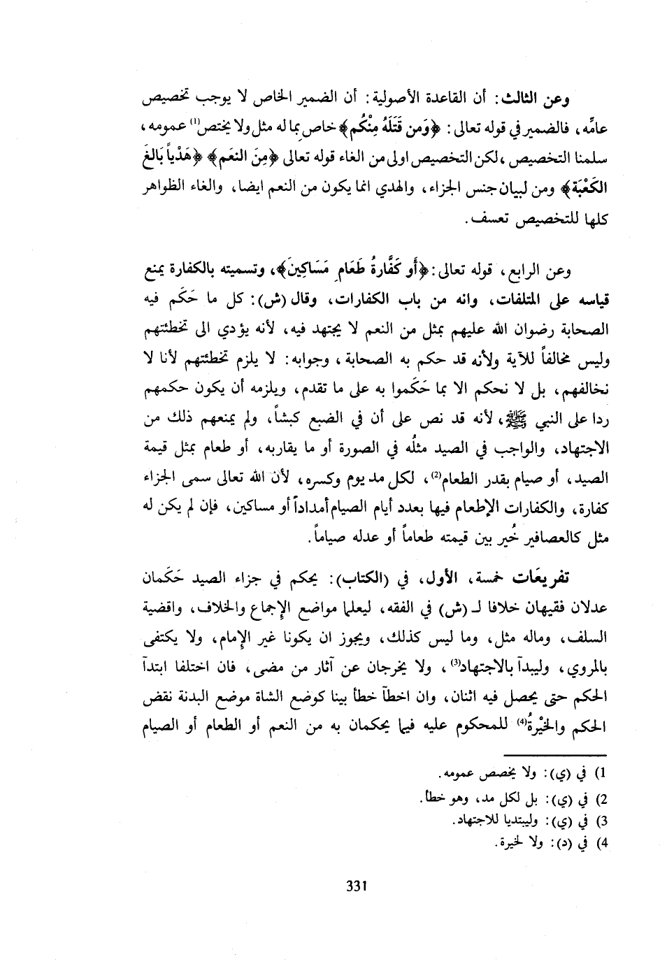 وَعَنِ الثَّالِثِ أَنِ الْقَاعِدَةَ الْأُصُولِيَّةَ أَنَّ الضَّمِيرَ الْخَاصَّ لَا يُوجِبُ تَخْصِيصَ عَامِّهِ فَالضَّمِيرُ فِي قَوْله تَعَالَى {وَمن قَتله مِنْكُم} خَاصٌّ بِمَا لَهُ مِثْلٌ وَلَا يَخْتَصُّ عُمُومَهُ سَلَّمْنَا التَّخْصِيصَ لَكِنَّ التَّخْصِيصَ أَوْلَى مِنْ إِلْغَاءِ قَوْله تَعَالَى {من النعم} {هَديا بَالغ الْكَعْبَة} وَمِنْ لِبَيَانِ جِنْسِ الْجَزَاءِ وَالْهَدْيُ إِنَّمَا يَكُونُ مِنَ النَّعَمِ أَيْضًا وَإِلْغَاءُ الظَّوَاهِرِ كُلِّهَا لِلتَّخْصِيصِ تَعَسُّفٌ وَعَنِ الرَّابِعِ قَوْله تَعَالَى {أَوْ كَفَّارَةٌ طَعَام مَسَاكِين} وَتَسْمِيَتُهُ بِالْكَفَّارَةِ يَمْنَعُ قِيَاسَهُ عَلَى الْمُتْلَفَاتِ وَإِنَّهُ مِنْ بَابِ الْكَفَّارَاتِ وَقَالَ ش كُلُّ مَا حَكَمَ فِيهِ الصَّحَابَةُ رِضْوَانُ اللَّهِ عَلَيْهِمْ بِمِثْلٍ مِنَ النَّعَمِ لَا يُجْتَهَدُ فِيهِ لِأَنَّهُ يُؤَدِّي إِلَى تخطئتهم وَلَيْسَ مُخَالفا لِلْآيَةِ وَلِأَنَّهُ قَدْ حَكَمَ بِهِ الصَّحَابَةُ وَجَوَابُهُ لَا يَلْزَمُ تَخْطِئَتُهُمْ لِأَنَّا لَا نُخَالِفُهُمْ بَلْ لَا نَحْكُمُ إِلَّا بِمَا حَكَمُوا بِهِ عَلَى مَا تَقَدَّمَ وَيَلْزَمُهُ أَنْ يَكُونَ حُكْمُهُمْ رَدًّا عَلَى النَّبِيِّ - صَلَّى اللَّهُ عَلَيْهِ وَسَلَّم َ - لِأَنَّهُ قَدْ نَصَّ عَلَى أَنَّ فِي الضَّبُعِ كَبْشًا وَلَمْ يَمْنَعْهُمْ ذَلِكَ مِنَ الِاجْتِهَادِ وَالْوَاجِبُ فِي الصَّيْدِ مِثْلُهُ فِي الصُّورَةِ أَوْ مَا يُقَارِبُهُ أَوْ طَعَامٌ بِمِثْلِ قِيمَةِ الصَّيْدِ أَوْ صِيَامٌ بِقِدْرِ الطَّعَامِ لِكُلِّ مُدٍّ يَوْمٌ وَكِسْرَةٌ لِأَنَّ اللَّهَ تَعَالَى سَمَّى الْجَزَاءَ كَفَّارَةً وَالْكَفَّارَاتُ الْإِطْعَامُ فِيهَا بِعَدَدِ أَيَّامِ الصِّيَامِ أَمْدَادًا أَوْ مَسَاكِينَ فَإِنْ لَمْ يَكُنْ لَهُ مِثْلٌ كَالْعَصَافِيرِ خُيِّرَ بَيْنَ قِيمَتِهِ طَعَامًا أَوْ عَدْلِهِ صِيَامًا تَفْرِيعَاتٌ خَمْسَةٌ الْأَوَّلُ فِي الْكِتَابِ يَحْكُمُ فِي جَزَاءِ الصَّيْدِ حَكَمَانِ عَدْلَانِ فَقِيهَانِ خِلَافًا لِ ش فِي الْفِقْهِ لِيَعْلَمَا مَوَاضِعَ الْإِجْمَاعِ وَالْخِلَافِ وأقضية السّلف وَمَاله مِثْلٌ وَمَا لَيْسَ كَذَلِكَ وَيَجُوزُ أَنْ يَكُونَا غير الإِمَام وَلَا يَكْتَفِي بالمروي وليبدآ بِالِاجْتِهَادِ وَلَا يَخْرُجَانِ عَنْ آثَارِ مَنْ مَضَى فَإِن اخْتلفَا ابتدآ الحكم حَتَّى يحصل فِيهِ اثْنَان وَإِن اخطأ خطأ بَينا كوضع الشَّاة مَوضِع الْبَدنَة نقص الْحُكْمُ وَالْخِيَرَةُ لِلْمَحْكُومِ عَلَيْهِ فِيمَا يَحْكُمَانِ بِهِ من النعم أَو الطَّعَام أَو الصّيام