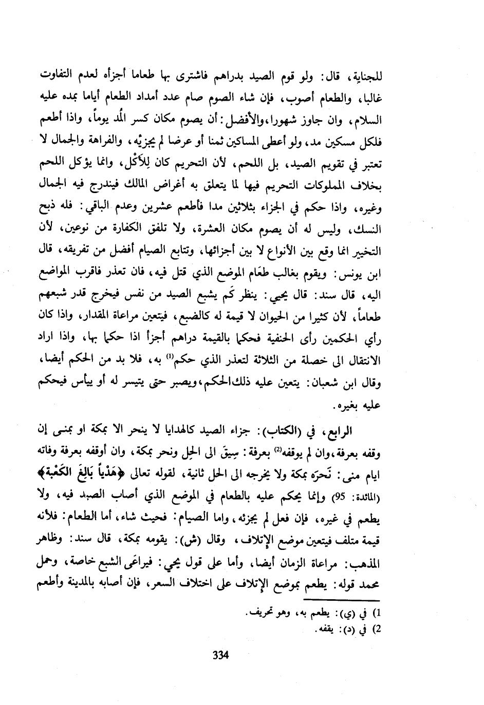 لِلْجِنَايَةِ قَالَ وَلَوْ قَوَّمَ الصَّيْدَ بِدَرَاهِمَ فَاشْتَرَى بِهَا طَعَامًا أَجْزَأَهُ لِعَدَمِ التَّفَاوُتِ غَالِبًا وَالطَّعَامُ أَصْوَبُ فَإِنْ شَاءَ الصَّوْمَ صَامَ عَدَدَ أَمْدَادِ الطَّعَام أَيَّامًا بمده عَلَيْهِ السَّلَام وَإِن جاور شُهُورًا وَالْأَفْضَلُ أَنْ يَصُومَ مَكَانَ كَسْرِ الْمُدِّ يَوْمًا وَإِذَا أَطْعَمَ فَلِكُلِّ مِسْكِينٍ مُدٌّ وَلَوْ أَعْطَى الْمَسَاكِينَ ثَمَنًا أَوْ عَرَضًا لَمْ يُجْزِئْهُ وَالْفَرَاهَةُ وَالْجَمَالُ لَا تُعْتَبَرُ فِي تَقْوِيمِ الصَّيْدِ بَلِ اللَّحْمُ لِأَنَّ التَّحْرِيمَ كَانَ لِلْأَكْلِ وَإِنَّمَا يُؤْكَلُ اللَّحْمُ بِخِلَافِ الْمَمْلُوكَاتِ التَّحْرِيمُ فِيهَا لِمَا يَتَعَلَّقُ بِهِ أَغْرَاضُ الْمَالِكِ فَيَنْدَرِجُ فِيهِ الْجَمَالُ وَغَيْرُهُ وَإِذَا حُكِمَ فِي الْجَزَاءِ بِثَلَاثِينَ مُدًّا فَأَطْعَمَ عِشْرِينَ وَعَدِمَ الْبَاقِيَ فَلَهُ ذَبْحُ النُّسُكِ وَلَيْسَ لَهُ أَنْ يَصُومَ مَكَانَ الْعَشَرَةِ وَلَا تُلَفَّقُ الْكَفَّارَةُ مِنْ نَوْعَيْنِ لِأَنَّ التَّخْيِيرَ إِنَّمَا وَقَعَ بَيْنَ الْأَنْوَاعِ لَا بَيْنَ أَجْزَائِهَا وَتَتَابَعُ الصِّيَامِ أَفْضَلُ مِنْ تَفْرِيقِهِ قَالَ ابْنُ يُونُسَ وَيُقَوَّمُ بِغَالِبِ طَعَامِ الْمَوْضِعِ الَّذِي قُتِلَ فِيهِ فَإِنْ تَعَذَّرَ فَأَقْرَبُ الْمَوَاضِعِ إِلَيْهِ قَالَ سَنَدٌ قَالَ يَحْيَى يَنْظُرُ كَمْ يُشْبِعُ الصَّيْدُ مِنْ نَفْسٍ فَيُخْرِجُ قَدْرَ شِبَعِهِمْ طَعَامًا لِأَنَّ كَثِيرًا مِنَ الْحَيَوَانِ لَا قِيمَةَ لَهُ كَالضَّبُعِ فَيَتَعَيَّنُ مُرَاعَاةُ الْمِقْدَارِ وَإِذَا كَانَ رَأْيُ الْحَكَمَيْنِ رَأْيَ الْحَنَفِيَّةِ فَحَكَمَا بِالْقِيمَةِ دَرَاهِمَ أَجْزَأَ إِذَا حَكَمَا بِهَا وَإِذَا أَرَادَ الِانْتِقَالَ إِلَى خَصْلَةٍ مِنَ الثَّلَاثَةِ لِتَعَذُّرِ الَّذِي حُكِمَ بِهِ فَلَا بُدَّ مِنَ الْحُكْمِ أَيْضًا وَقَالَ ابْنُ شَعْبَانَ يَتَعَيَّنُ عَلَيْهِ ذَلِكَ الْحُكْمُ وَيَصْبِرُ حَتَّى يَتَيَسَّرَ لَهُ أَوْ يَيْأَسَ فَيُحْكَمُ عَلَيْهِ بِغَيْرِهِ الرَّابِعُ فِي الْكِتَابِ جَزَاءُ الصَّيْدِ كَالْهَدَايَا لَا يُنْحَرُ إِلَّا بِمَكَّةَ أَوْ بِمِنًى إِنْ وَقَفَهُ بِعَرَفَةَ وَإِنْ لَمْ يُوقِفْهُ بِعَرَفَةَ سِيقَ إِلَى الْحِلِّ وَنُحِرَ بِمَكَّةَ وَإِنْ أَوْقَفَهُ بِعَرَفَةَ وَفَاتَهُ أَيَّامَ مِنًى نَحَرَهُ بِمَكَّةَ وَلَا يُخْرِجُهُ إِلَى الْحِلِّ ثَانِيَةً لِقَوْلِهِ تَعَالَى {هَدْيًا بَالِغَ الْكَعْبَةِ} الْمَائِدَة 95 وَإِنَّمَا يُحْكَمُ عَلَيْهِ بِالطَّعَامِ فِي الْمَوْضِعِ الَّذِي أَصَابَ الصَّيْدَ فِيهِ وَلَا يُطْعِمُ فِي غَيْرِهِ فَإِنْ فَعَلَ لَمْ يُجْزِئْهُ وَأَمَّا الصِّيَامُ فَحَيْثُ شَاءَ أَمَّا الطَّعَامُ فَلِأَنَّهُ قِيمَةُ مُتْلَفٍ فَيَتَعَيَّنُ مَوْضِعُ الْإِتْلَافِ وَقَالَ ش يُقَوِّمُهُ بِمَكَّةَ قَالَ سَنَدٌ وَظَاهِرُ الْمَذْهَبِ مُرَاعَاةُ الزَّمَانِ أَيْضًا وَأَمَّا عَلَى قَوْلِ يَحْيَى فَيُرَاعَى الشِّبَعُ خَاصَّةً وَحَمَلَ مُحَمَّدٌ قَوْلَهُ يُطْعِمُ بِمَوْضِعِ الْإِتْلَافِ عَلَى اخْتِلَافِ السِّعْرِ فَإِنْ أَصَابَهُ بِالْمَدِينَةِ وَأَطْعَمَ