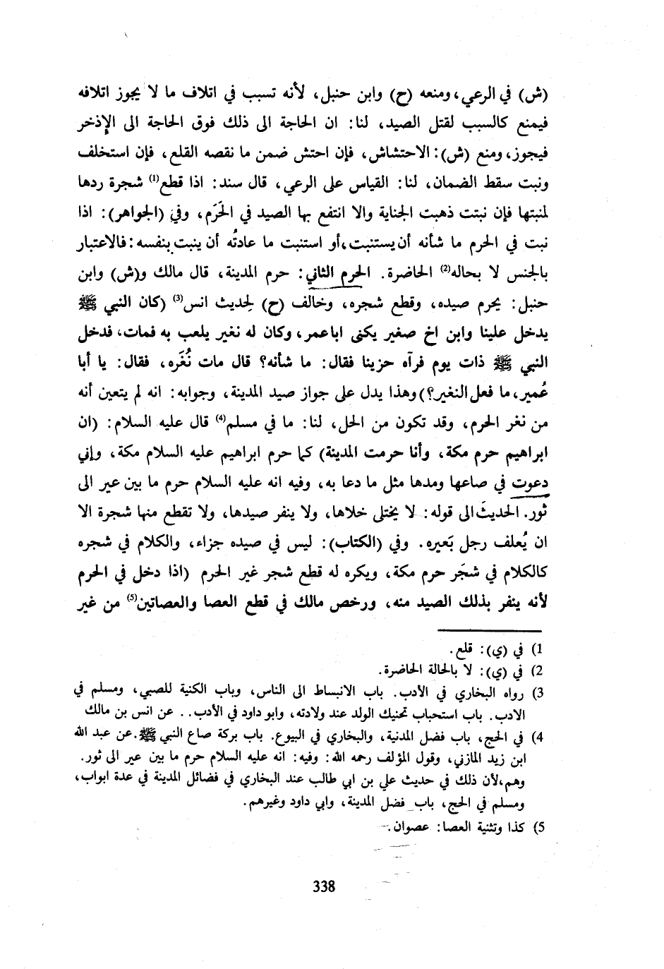 ش فِي الرَّعْيِ وَمَنْعَهُ ح وَابْنُ حَنْبَلٍ لِأَنَّهُ تَسَبَّبَ فِي إِتْلَافِ مَا لَا يَجُوزُ إِتْلَافُهُ فَيُمْنَعُ كَالسَّبَبِ لِقَتْلِ الصَّيْدِ لَنَا أَنَّ الْحَاجَةَ إِلَى ذَلِكَ فَوْقَ الْحَاجَةِ إِلَى الْإِذْخِرِ فَيَجُوزُ وَمَنَعَ ش الِاحْتِشَاشَ فَإِنِ احْتَشَّ ضَمِنَ مَا نَقَصَهُ الْقَلْعُ فَإِنِ اسْتَخْلَفَ وَنَبَتَ سَقَطَ الضَّمَانُ لَنَا الْقِيَاسُ عَلَى الرَّعْيِ قَالَ سَنَدٌ إِذَا قَطَعَ شَجَرَةً رَدَّهَا لِمَنْبَتِهَا فَإِنْ نَبَتَتْ ذَهَبَتِ الْجِنَايَةُ وَإِلَّا انْتَفَعَ بِهَا الصَّيْدُ فِي الْحَرَمِ وَفِي الْجَوَاهِرِ إِذَا نَبَتَ فِي الْحَرَمِ مَا شَأْنُهُ أَنْ يُسْتَنْبَتَ أَوِ اسْتَنْبَتَ مَا عَادَتُهُ أَنْ يَنْبُتَ بِنَفْسِهِ فَالِاعْتِبَارُ بِالْجِنْسِ لَا بِحَالِهِ الْحَاضِرَةِ الْحَرَمُ الثَّانِي حَرَمُ الْمَدِينَةِ قَالَ مَالك وش وَابْنُ حَنْبَلٍ يَحْرُمُ صَيْدُهُ وَقَطْعُ شَجَرِهِ وَخَالَفَ ح لِحَدِيثِ أَنَسٍ كَانَ النَّبِيُّ - صَلَّى اللَّهُ عَلَيْهِ وَسَلَّم َ - يدْخل علينا وَابْن أَخ صَغِير يكنى أَبَا عمر وَكَانَ لَهُ نُغَيْرٌ يَلْعَبُ بِهِ فَمَاتَ فَدَخَلَ النَّبِي - صَلَّى اللَّهُ عَلَيْهِ وَسَلَّم َ - ذَاتَ يَوْمٍ فَرَآهُ حَزِينًا فَقَالَ مَا شَأْنُهُ قَالَ مَاتَ نغره فَقَالَ يَا أَبَا عُمَيْرٍ مَا فَعَلَ النُّغَيْرُ وَهَذَا يَدُلُّ عَلَى جَوَازِ صَيْدِ الْمَدِينَةِ وَجَوَابُهُ أَنَّهُ لَمْ يَتَعَيَّنْ أَنَّهُ مَنْ نُغَرِ الْحَرَمِ وَقَدْ تَكُونُ مِنَ الْحِلِّ لَنَا مَا فِي مُسلم