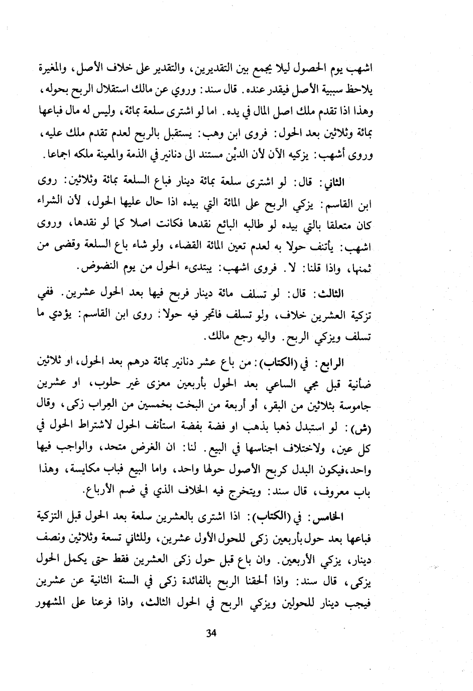 اشهب يَوْم الْحُصُول لَيْلًا يَجْمَعَ بَيْنَ التَّقْدِيرَيْنِ وَالتَّقْدِيرُ عَلَى خِلَافِ الْأَصْلِ وَالْمُغِيرَةُ يُلَاحِظُ سَبَبِيَّةَ الْأَصْلِ فَيُقَدَّرُ عِنْدَهُ قَالَ سَنَدٌ وَرُوِيَ عَنْ مَالِكٍ اسْتِقْلَالُ الرِّبْحِ بِحَوْلِهِ وَهَذَا إِذَا تَقَدَّمَ مِلْكُ أَصْلِ الْمَالِ فِي يَدِهِ أَمَّا لَوِ اشْتَرَى سِلْعَةً بِمِائَةٍ وَلَيْسَ لَهُ مَالٌ فَبَاعَهَا بِمِائَةٍ وَثَلَاثِينَ بَعْدَ الْحَوْلِ فَرَوَى ابْنُ وَهْبٍ يَسْتَقْبِلُ بِالرِّبْحِ لِعَدَمِ تَقَدُّمِ مِلْكٍ عَلَيْهِ وَرَوَى أَشْهَبُ يُزَكِّيهِ الْآنَ لِأَنَّ الدَّيْنَ مُسْتَنِدٌ إِلَى دَنَانِيرَ فِي الذِّمَّةِ وَالْمُعَيَّنَةُ مِلْكُهُ إِجْمَاعًا الثَّانِي قَالَ لَوِ اشْتَرَى سِلْعَةً بِمِائَةِ دِينَارٍ فَبَاعَ السِّلْعَةَ بِمِائَةٍ وَثَلَاثِينَ رَوَى ابْنُ الْقَاسِمِ يُزَكِّي الرِّبْحَ عَلَى الْمِائَةِ الَّتِي بِيَدِهِ إِذَا حَالَ عَلَيْهَا الْحَوْلُ لِأَنَّ الشِّرَاءَ كَانَ مُتَعَلِّقًا بِالَّتِي بِيَدِهِ لَوْ طَالَبَهُ الْبَائِعُ نَقْدَهَا فَكَانَتْ أَصْلًا كَمَا لَوْ نَقَدَهَا وَرَوَى أَشْهَبُ يَأْتَنِفُ حَوْلًا بِهِ لِعَدَمِ تَعَيُّنِ الْمِائَةِ الْقَضَاءِ وَلَوْ شَاءَ بَاعَ السِّلْعَةَ وَقَضَى مِنْ ثَمَنِهَا وَإِذَا قُلْنَا لَا فَرَوَى أَشْهَبُ يَبْتَدِئُ الْحَوْلَ مِنْ يَوْمِ النُّضُوضِ الثَّالِثُ قَالَ لَوْ تَسَلَّفَ مِائَةَ دِينَارٍ فَرَبِحَ فِيهَا بَعْدَ الْحَوْلِ عِشْرِينَ فَفِي تَزْكِيَةِ الْعِشْرِينَ خِلَافٌ وَلَوْ تَسَلَّفَ فَاتَّجَرَ فِيهِ حَوْلًا رَوَى ابْنُ الْقَاسِمِ يُؤَدِّي مَا تَسَلَّفَ وَيُزَكِّي الرِّبْحَ وَإِلَيْهِ رَجَعَ مَالِكٌ الرَّابِع فِي الْكتاب من بَاعَ عشر دَنَانِيرَ بِمِائَةِ دِرْهَمٍ بَعْدَ الْحَوَلِ أَوْ ثَلَاثِينَ ضأنية قبل مجي السَّاعِي بَعْدَ الْحَوْلِ بِأَرْبَعِينَ مِعْزًى غَيْرَ حَلُوبٍ أَوْ عِشْرِينَ جَامُوسَةً بِثَلَاثِينَ مِنَ الْبَقَرِ أَوْ أَرْبَعَةً مِنَ الْبُخْتِ بِخَمْسِينَ مِنَ الْعِرَابِ زَكَّى وَقَالَ (ش) لَوِ اسْتَبْدَلَ ذَهَبًا بِذَهَبٍ أَوْ فِضَّةً بِفِضَّةٍ اسْتَأْنَفَ الْحَوَلَ لِاشْتِرَاطِ الْحَوَلِ فِي كُلِّ عَيْنٍ وَلِاخْتِلَافِ أَجْنَاسِهَا فِي الْبَيْعِ لَنَا أَنَّ الْغَرَضَ مُتَّحِدٌ وَالْوَاجِبُ فِيهَا وَاحِدٌ فَيَكُونُ الْبَدَلُ كَرِبْحِ الْأُصُولِ حَوْلُهَا وَاحِدٌ وَأَمَّا الْبَيْعُ فَبَابُ مُكَايَسَةٍ وَهَذَا بَابٌ مَعْرُوفٌ قَالَ سَنَدٌ وَيَتَخَرَّجُ فِيهِ الْخِلَافُ الَّذِي فِي ضَمِّ الْأَرْبَاعِ الْخَامِسُ فِي الْكِتَابِ إِذَا اشْتَرَى بِالْعِشْرِينَ سِلْعَةً بَعْدَ الْحَوْلِ قَبْلَ التَّزْكِيَةِ فَبَاعَهَا بَعْدَ حَوْلٍ بِأَرْبَعِينَ زَكَّى لِلْحَوْلِ الْأَوَّلِ عِشْرِينَ وَلِلثَّانِي تِسْعَةً وَثَلَاثِينَ وَنِصْفَ دِينَارٍ يُزَكِّي الْأَرْبَعِينَ وَإِنْ بَاعَ قَبْلَ حَوْلٍ زَكَّى الْعِشْرِينَ فَقَطْ حَتَّى يُكْمِلَ الْحَوْلَ يُزَكِّي قَالَ سَنَدٌ وَإِذَا أَلْحَقْنَا الرِّبْحَ بِالْفَائِدَةِ زَكَّى فِي السَّنَةِ الثَّانِيَةِ عَنْ عِشْرِينَ فَيَجِبُ دِينَارٌ لِلْحَوْلَيْنِ وَيُزَكِّي الرِّبْحَ فِي الْحَوْلِ الثَّالِثِ وَإِذَا فَرَّعْنَا عَلَى الْمَشْهُورِ