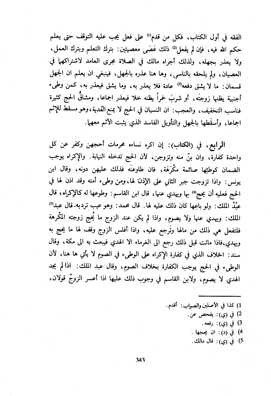 الْفِقْهِ فِي أَوَّلِ الْكِتَابِ فَكُلُّ مَنْ قَدِمَ عَلَى فِعْلٍ يَجِبُ عَلَيْهِ التَّوَقُّفُ حَتَّى يَعْلَمَ حُكْمَ اللَّهِ فِيهِ فَإِنْ لَمْ يَفْعَلْ ذَلِكَ عَصَى مَعْصِيَتَيْنِ بِتَرْكِ التَّعَلُّمِ وَبِتَرْكِ الْعَمَلِ وَلَا يُعْذَرُ بِجَهْلِهِ وَلِذَلِكَ أَجْرَاهُ مَالِكٌ فِي الصَّلَاةِ مَجْرَى الْعَامِدِ لِاشْتِرَاكِهِمَا فِي الْعِصْيَانِ وَلَمْ يُلْحِقْهُ بالناسي وَهَا هُنَا عَذَرَهُ بِالْجَهْلِ فَيَنْبَغِي أَنْ يُعْلَمَ أَنَّ الْجَهْلَ قِسْمَانِ مَا لَا يَشُقُّ دَفْعُهُ عَادَةً فَلَا يُعْذَرُ بِهِ وَمَا يَشُقُّ فَيُعْذَرُ بِهِ كَمَنْ وَطِئَ أَجْنَبِيَّةً يَظُنُّهَا زَوْجَتَهُ أَوْ شَرِبَ خَمْرًا يَظُنُّهُ خَلًّا فَيُعْذَرُ إِجْمَاعًا وَمَشَاقُّ الْحَجِّ كَثِيرَةٌ فَنَاسَبَ التَّخْفِيفَ وَالْعَجَبُ أَنَّ النِّسْيَانَ فِي الْحَجِّ لَا يَمْنَعُ الْفِدْيَةَ وَهُوَ مُسْقِطٌ لِلْإِثْمِ إِجْمَاعًا وَأَسْقَطَهَا بِالْجَهْلِ وَالتَّأْوِيلِ الْفَاسِدِ الَّذِي يَثْبُتُ الْإِثْمُ مَعَهُمَا الرَّابِعُ فِي الْكِتَابِ إِنْ أَكْرَهَ نِسَاءَهُ مُحْرِمَاتٍ أَحَجَهُنَّ وَكَفَّرَ عَنْ كُلِّ وَاحِدَةٍ كَفَارَّةً وَإِنْ بِنَّ مِنْهُ وَتَزَوَّجْنَ لِأَنَّ الْحَجَّ تَدْخُلُهُ النِّيَابَةُ وَالْإِكْرَاهُ يُوجِبُ الضَّمَانَ كَوَطْئِهَا صَائِمَةً مُكْرَهَةً فَإِنْ طَاوَعْنَهُ فَذَلِكَ عَلَيْهِنَّ دُونَهُ وَقَالَ ابْنُ يُونُسَ وَإِذَا تَزَوَّجَتْ جُبِرَ الثَّانِي عَلَى الْإِذْنِ لَهَا وَمَنْ وَطِئَ أَمَتَهُ وَقَدْ أَذِنَ لَهَا فِي الْحَجِّ فَعَلَيْهِ أَنْ يَحُجَّ بِهَا وَيُهْدِيَ عَنْهَا قَالَ ابْنُ الْقَاسِمِ وَطَوْعُهَا لَهُ كَالْإِكْرَاهِ قَالَ عَبْدُ الْمَلِكِ وَلَوْ بَاعَهَا كَانَ ذَلِكَ عَلَيْهِ لَهَا قَالَ مُحَمَّدٌ وَهُوَ عَيْبٌ تُرَدُّ بِهِ قَالَ عبد الْملك وَيهْدِي عَنْهَا وَلَا يَصُومُ وَإِذَا لَمْ يَكُنْ عِنْدَ الزَّوْجِ مَا يُحِجُّ زَوْجَتَهُ الْمُكْرَهَةَ فَلْتَفْعَلْ هِيَ ذَلِكَ مِنْ مَالِهَا وَتَرْجِعْ عَلَيْهِ وَإِذَا أَفْلَسَ الزَّوْجُ وَقَفَ لَهَا مَا يُحَجُّ بِهِ وَيُهْدَى فَإِذَا مَاتَتْ قَبْلَ ذَلِكَ رَجَعَ إِلَى الْغُرَمَاءِ إِلَّا الْهَدْيَ فَيَبْعَثُ بِهِ إِلَى مَكَّةَ وَقَالَ سَنَدٌ الْخِلَافُ الَّذِي فِي كَفَّارَةِ الْإِكْرَاهِ عَلَى الوطئ فِي الصَّوْم لَا يَأْتِي هَا هُنَا لِأَن الوطئ فِي الْحَجِّ يُوجِبُ الْكَفَّارَةَ بِخِلَافِ الصَّوْمِ وَقَالَ عَبْدُ الْمَلِكِ إِذَا لَمْ يَجِدِ الْهَدْيَ لَا يَصُومُ وَلِابْنِ الْقَاسِمِ فِي وُجُوبِ ذَلِكَ عَلَيْهَا إِذَا أَعْسَرَ الزَّوْجُ قَوْلَانِ