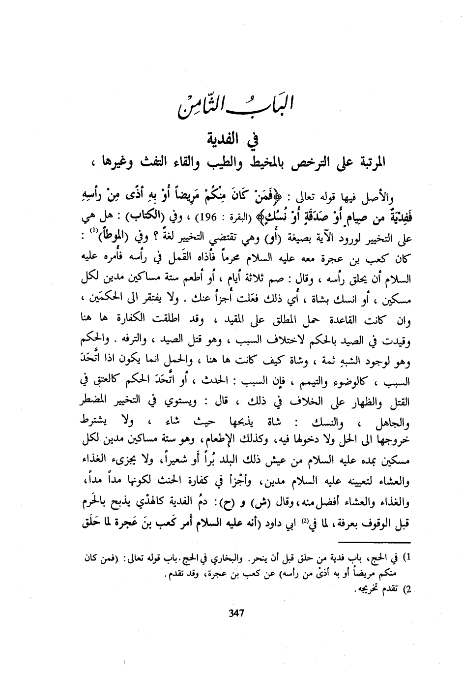 (الْبَاب الثَّامِن فِي الْفِدْيَة الْمُرَتَّبَةِ عَلَى التَّرْخِيصِ بِالْمَخِيطِ وَالطِّيبِ وَإِلْقَاءِ التَّفَثِ وَغَيرهَا)