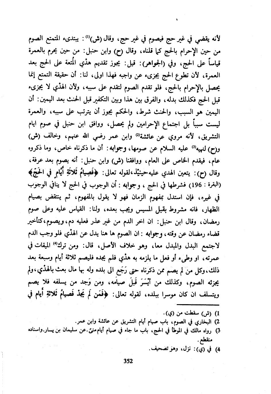 لِأَنَّهُ يَقْضِي فِي غَيْرِ حَجٍّ فَيَصُومُ فِي غير حج وَقَالَ ش يَبْتَدِئ الْمُتَمَتّع الصَّوْم مِنْ حِينِ الْإِحْرَامِ بِالْحَجِّ كَمَا قُلْنَاهُ وَقَالَ ح وَابْنُ حَنْبَلٍ مِنْ حِينِ يُحْرِمُ بِالْعُمْرَةِ قِيَاسًا عَلَى الْحَجِّ وَفِي الْجَوَاهِرِ قِيلَ يَجُوزُ تَقْدِيمُ هَدْيِ الْمُتْعَةِ عَلَى الْحَجِّ بَعْدَ الْعُمْرَةِ لِأَن التَّطَوُّع الْحَج يجزء عَنْ وَاجِبِهِ فَهَذَا أَوْلَى لَنَا أَنَّ حَقِيقَةَ التَّمَتُّعِ إِنَّمَا يَحْصُلُ بِالْإِحْرَامِ بِالْحَجِّ فَلَوْ تَقَدَّمَ الصَّوْمُ لَتَقَدَّمَ عَلَى سَبَبِهِ وَلِأَنَّ الْهَدْيَ لَا يُجْزِئُ قَبْلَ الْحَجِّ فَكَذَلِكَ بَدَلُهُ وَالْفَرْقُ بَيْنَ هَذَا وَبَين التَّكْفِير قبل الْحِنْث بعد بِالْيَمِينِ أَنَّ الْيَمِينَ هُوَ السَّبَبُ وَالْحِنْثُ شَرْطٌ وَالْحُكْمُ يَجُوزُ أَنْ يَتَرَتَّبَ عَلَى سَبَبِهِ وَالْعُمْرَةُ لَيْسَتْ سَبَبًا بَلِ اجْتِمَاعُ الْإِحْرَامَيْنِ وَلَمْ يَحْصُلْ وَوَافَقَ ابْنُ حَنْبَلٍ فِي صَوْمِ أَيَّامِ التَّشْرِيقِ لِأَنَّهُ مَرْوِيٌّ عَنْ عَائِشَةَ وَابْنِ عُمَرَ رَضِيَ اللَّهُ عَنْهُم خَالف ش وح لنَهْيه - صَلَّى اللَّهُ عَلَيْهِ وَسَلَّم َ - عَنْ صَوْمِهَا وَجَوَابُهُ أَنَّ مَا ذَكَرْنَاهُ خَاصٌّ وَمَا ذَكَرُوهُ عَامٌّ فَيُقَدَّمُ الْخَاصُّ عَلَى الْعَامِّ وَوَافَقَنَا ش وَابْنُ حَنْبَلٍ أَنَّهُ يَصُومُ بَعْدَ عَرَفَةَ وَقَالَ ح يَتَعَيَّنُ الْهَدْيُ عَلَيْهِ حِينَئِذٍ لِقَوْلِهِ تَعَالَى {فَصِيَامُ ثَلاثَةِ أَيَّامٍ فِي الْحَجِّ} الْبَقَرَة 196 فشرطها فِي الْحَج وَجَوَابه أَن الْوَاجِب فِي الْحَج لَا يُنَافِي الْوَاجِب فِي غَيْرِهِ فَإِنِ اسْتَدَلَّ بِمَفْهُومِ الزَّمَانِ فَهُوَ لَا يَقُولُ بِالْمَفْهُومِ ثُمَّ يَنْتَقِضُ بِصِيَامِ الظِّهَارِ فَإِنَّهُ مَشْرُوطٌ بِقَبْلِ الْمَسِيسِ وَيَجِبُ بَعْدَهُ وَلَنَا الْقِيَاسُ عَلَيْهِ وَعَلَى صَوْمِ رَمَضَانَ وَقَالَ ابْنُ حَنْبَلٍ إِنْ أَخَّرَ الدَّمَ لِغَيْرِ عُذْرٍ فَعَلَيْهِ دَمٌ وَيَصُومُ كَتَأْخِيرِ قَضَاءِ رَمَضَانَ عَنْ وَقْتِهِ وَجَوَابه أَن الصَّوْم هَا هُنَا يدل عَلَى الْهَدْيِ فَلَوْ وَجَبَ الدَّمُ لَاجْتَمَعَ الْبَدَلُ والمبدل مَعَه وَهُوَ خِلَافُ الْأَصْلِ قَالَ مَنْ تَرَكَ الْمِيقَاتَ فِي عُمْرَتِهِ أَوْ وَطِئَ أَوْ فَعَلَ مَا يَلْزَمُهُ بِهِ هَدْيٌ فَلَمْ يَجِدْهُ فَلْيَصُمْ ثَلَاثَةَ أَيَّامٍ وَسَبْعَةً بَعْدَ ذَلِكَ وَكُلُّ مَنْ لَمْ يَصُمْ مِمَّنْ ذَكَرْنَاهُ حَتَّى رَجَعَ إِلَى بَلَدِهِ وَلَهُ بِهَا مَالٌ بَعَثَ بِالْهَدْيِ وَلَمْ يُجْزِئْهُ الصَّوْمُ وَكَذَلِكَ مَنْ أَيْسَرَ قَبْلَ صِيَامِهِ وَمَنْ وَجَدَ مَنْ يُسْلِفُهُ فَلَا يَصُمْ وَيَتَسَلَّفُ إِنْ كَانَ مُوسِرًا بِبَلَدِهِ لِقَوْلِهِ تَعَالَى {فَمَنْ لَمْ يَجِدْ فَصِيَامُ ثَلاثَةِ أَيَّامٍ فِي