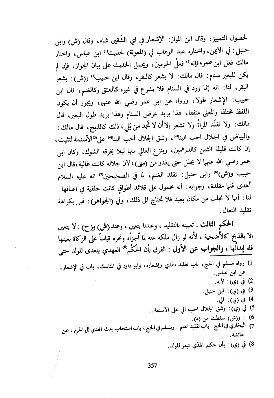 لحُصُول التَّمْيِيز قَالَ ابْنُ الْمَوَّازِ الْإِشْعَارُ فِي أَيِّ الشِّقَّيْنِ شَاءَ وَقَالَ ش وَابْنُ حَنْبَلٍ فِي الْأَيْمَنِ وَاخْتَارَهُ عبد الْوَهَّاب فِي المعونة لحديثه ابْنِ عَبَّاسٍ وَاخْتَارَ مَالِكٌ فِعْلَ ابْنِ عُمَرَ فَإِنَّهُ فِعْلُ الْحَرَمَيْنِ وَيُحْمَلُ الْحَدِيثُ عَلَى بَيَانِ الْجَوَازِ فَإِنْ لَمْ يَكُنْ لِلْبَعِيرِ سَنَامٌ قَالَ مَالِكٌ لَا يُشْعَرُ كَالْبَقَرِ قَالَ ابْنُ حَبِيبٍ وش يُشْعَرُ الْبَقَرُ لَنَا أَنَّهُ إِنَّمَا وَرَدَ فِي السَّنَامِ فَلَا يُشْرَعُ فِي غَيْرَهِ كَالْعِتْقِ وَكَالْغَنَمِ قَالَ ابْنُ حَبِيبٍ الْإِشْعَارُ طُولًا وَرَوَاهُ عَنِ ابْنِ عُمَرَ رَضِيَ اللَّهُ عَنْهُمَا وَيَجُوزُ أَنْ يَكُونَ اللَّفْظُ مُخْتَلِفًا وَالْمَعْنَى مُتَّفِقًا هَذَا يُرِيدُ عَرْضَ السَّنَامِ وَهَذَا يُرِيدُ طُولَ الْبَعِيرِ قَالَ مَالِكٌ وَلَا تُقَلِّدُ الْمَرْأَةُ وَلَا تُشْعِرُ إِلَّا أَنْ لَا تَجِدَ مَنْ يَلِي ذَلِكَ كَالذَّبْحِ قَالَ مَالِكٌ وَالْبَيَاضُ فِي الْجِلَالِ أَحَبُّ إِلَيْنَا وشق الْجلَال أحب إِلَيْنَا على الأسنمة لتثيت إِنْ كَانَتْ قَلِيلَةَ الثَّمَنِ كَالدِّرْهَمَيْنِ وَيُنْزَعُ الْعَالِي مِنْهَا لَيْلًا يخرقه الشوك وَكَانَ ابْنُ عُمَرَ رَضِيَ اللَّهُ عَنْهُمَا لَا يُجَلِّلُ حَتَّى يَغْدُوَ مِنْ مِنًى لِأَنَّ جِلَالَهُ كَانَت غَالِيَة قَالَ ابْن حبيب وش وَابْنُ حَنْبَلٍ تُقَلَّدُ الْغَنَمُ لِمَا فِي الصَّحِيحَيْنِ أَنَّهُ - صَلَّى اللَّهُ عَلَيْهِ وَسَلَّم َ - أَهْدَى غَنَمًا مُقَلَّدَةً وَجَوَابُهُ أَنَّهُ مَحْمُولٌ عَلَى قَلَائِدِ أَطْوَاقٍ كَانَتْ حَلْقِيَّةً فِي أَعْنَاقِهَا لَنَا لِأَنَّهَا لَا تُجْلَبُ مِنْ مَكَانٍ بَعِيدٍ فَلَا تَحْتَاجُ إِلَى ذَلِكَ وَفِي الْجَوَاهِرِ قِيلَ بِكَرَاهَةِ تَقْلِيدِ النِّعَال الْحُكْمُ الثَّالِثُ تَعْيِينُهُ بِالتَّقْلِيدِ وَعِنْدَنَا يَتَعَيَّنُ وَعِنْدَ ش وح لَا يَتَعَيَّنُ إِلَّا بِالذَّبْحِ كَالْأُضْحِيَّةِ لِأَنَّهُ لَوْ زَالَ مِلْكُهُ عَنْهُ لَمَا أَجْزَأَهُ وَنَحَرَهُ قِيَاسًا عَلَى الزَّكَاةِ بِعَيْنِهَا فَلَهُ إِبْدَالُهَا وَالْجَوَابُ عَنِ الْأَوَّلِ الْفَرْقُ بِأَنَّ الْحُكْمَ الْعَهْدِيَّ يَتَعَدَّى لِلْوَلَدِ حَتَّى