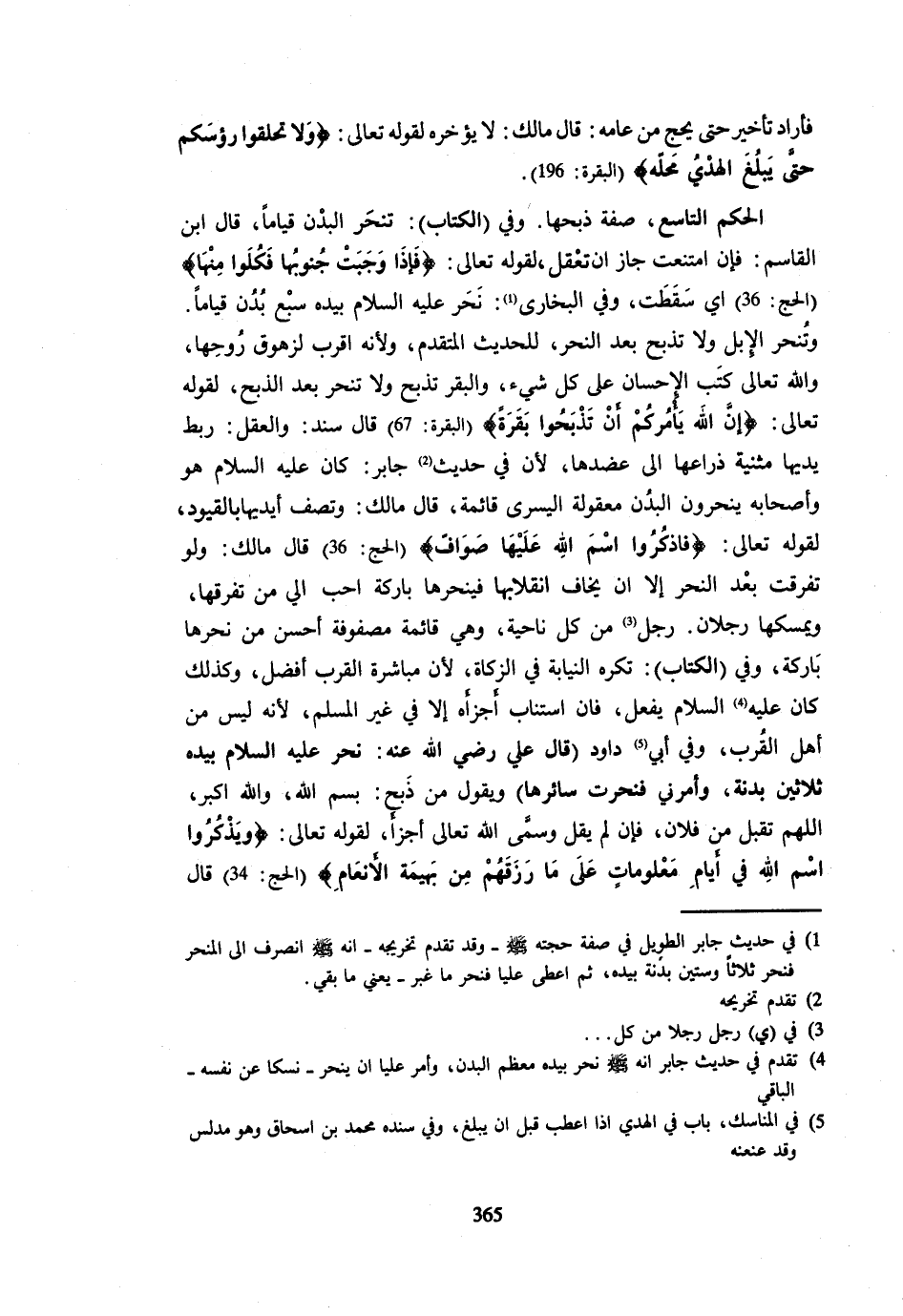 فَأَرَادَ تَأْخِير حَتَّى يَحُجَّ مِنْ عَامِهِ قَالَ مَالِكٌ لَا يُؤَخِّرهُ لقَوْله تَعَالَى {فَلَا تحلقوا رؤسكم حَتَّى يَبْلُغَ الْهَدْيُ مَحِلَّهُ} الْبَقَرَة 196 الْحُكْمُ التَّاسِعُ صفة ذَبحهَا فِي الْكِتَابِ تُنْحَرُ الْبُدْنُ قِيَامًا قَالَ ابْنُ الْقَاسِمِ فَإِنِ امْتَنَعَتْ جَازَ أَنْ تُعْقَلَ لِقَوْلِهِ تَعَالَى {فَإِذَا وَجَبَتْ جُنُوبُهَا فَكُلُوا مِنْهَا} الْحَج 36 أَيْ سَقَطت وَفِي البُخَارِيّ نحر - صَلَّى اللَّهُ عَلَيْهِ وَسَلَّم َ - بِيَدِهِ سَبْعَ بُدْنٍ قِيَامًا وَتُنْحَرُ الْإِبِلُ وَلَا تُذْبَحُ بَعْدَ النَّحْرِ لِلْحَدِيثِ الْمُتَقَدِّمِ وَلِأَنَّهُ أَقْرَبُ لِزُهُوقِ رُوحِهَا وَاللَّهُ تَعَالَى كَتَبَ الْإِحْسَانَ عَلَى كُلِّ شَيْءٍ وَالْبَقْرُ تُذْبَحُ وَلَا تُنْحَرُ بَعْدَ الذَّبْحِ لِقَوْلِهِ تَعَالَى {إِنَّ اللَّهَ يَأْمُرُكُمْ أَنْ تَذْبَحُوا بَقَرَةً} الْبَقَرَة 67 قَالَ سَنَدٌ وَالْعَقْلُ رَبْطُ يَدَيْهَا مَثْنِيَّةً ذِرَاعُهَا إِلَى عَضُدِهَا لِأَنَّ فِي حَدِيث جَابر كَانَ - صَلَّى اللَّهُ عَلَيْهِ وَسَلَّم َ - هُوَ أَصْحَابه يَنْحَرُونَ الْبُدْنَ مَعْقُولَةَ الْيُسْرَى قَائِمَةً قَالَ مَالِكٌ وَتُصَفُّ أَيْدِيهَا بِالْقُيُودِ لِقَوْلِهِ تَعَالَى {فَاذْكُرُوا اسْمَ اللَّهِ عَلَيْهَا صَوَافَّ} الْحَج 36 قَالَ مَالِكٌ وَلَوْ تَفَرَّقَتْ بَعْدَ النَّحْرِ إِلَّا أَنْ يَخَافَ انْقِلَابَهَا فَيَنْحَرَهَا بَارِكَةً أَحَبُّ إِلَيَّ مِنْ تَفَرُّقِهَا وَيُمْسِكُهَا رَجُلَانِ رَجُلٌ مِنْ كُلِّ نَاحِيَةٍ وَهِيَ قَائِمَةٌ مَصْفُوفَةٌ أَحْسَنُ مِنْ نَحْرِهَا بَارِكَةً وَفِي الْكِتَابِ تكره النِّيَابَة فِي الزَّكَاة لِأَن مُبَاشرَة الْقرب أفضل وَكَذَلِكَ كَانَ - صَلَّى اللَّهُ عَلَيْهِ وَسَلَّم َ - يَفْعَلُ فَإِنِ اسْتَنَابَ أَجَزْأَهُ إِلَّا فِي غَيْرِ الْمُسْلِمِ لِأَنَّهُ لَيْسَ مِنْ أَهْلِ الْقُرَبِ وَفِي