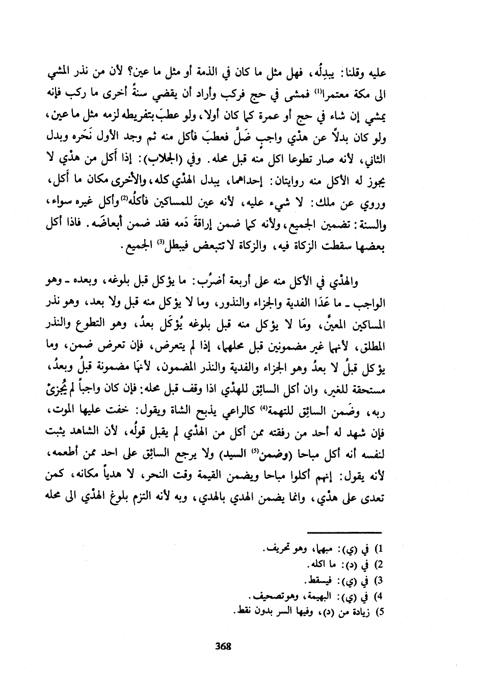 عَلَيْهِ وَقُلْنَا يُبْدِلُهُ فَهَلْ مِثْلُ مَا كَانَ فِي الذِّمَّةِ أَوْ مِثْلُ مَا عَيَّنَ لِأَنَّ مَنْ نَذَرَ الْمَشْيَ إِلَى مَكَّةَ مُعْتَمِرًا فَمَشَى فِي حج فَركب وَأَرَادَ يَقْضِيَ سَنَةً أُخْرَى مَا رَكِبَ فَإِنَّهُ يَمْشِي إِنْ شَاءَ فِي حَجٍّ أَوْ عُمْرَةٍ كَمَا كَانَ أَوَّلًا وَلَوْ عَطِبَ بِتَفْرِيطِهِ لَزِمَهُ مِثْلُ مَا عَيَّنَ وَلَوْ كَانَ بَدَلًا عَنْ هَدْيٍ وَاجِبٍ ضَلَّ فَعَطِبَ فَأَكَلَ مِنْهُ ثُمَّ وَجَدَ الأول نَحره وَبدل الثَّانِي لِأَنَّهُ صَارَ تَطَوُّعًا أَكَلَ مِنْهُ قَبْلَ مَحِلِّهِ وَفِي الْجُلَّابِ إِذَا أَكَلَ مِنْ هَدْيٍ لَا يَجُوزُ لَهُ الْأَكْلُ مِنْهُ رِوَايَتَانِ إِحْدَاهُمَا يُبْدِلُ الْهَدْيَ كُلَّهُ وَالْأُخْرَى مَكَانَ مَا أَكَلَ وَرُوِيَ عَنْ مَالِكٍ لَا شَيْءَ عَلَيْهِ لِأَنَّهُ عُيِّنَ لِلْمَسَاكِينِ فَأَكْلُهُ وَأَكْلُ غَيْرِهِ سَوَاءٌ وَالسُّنَّةُ تَضْمِينُ الْجَمِيعِ وَلِأَنَّهُ كَمَا ضَمِنَ إِرَاقَةَ دَمِهِ فَقَدْ ضَمِنَ أَبْعَاضَهُ فَإِذَا أَكَلَ بَعْضَهَا سَقَطَتِ الزَّكَاةُ فِيهِ وَالزَّكَاةُ لَا تَتَبَعَّضُ فَيَبْطُلُ الْجَمِيعُ وَالْهَدْيُ فِي الْأَكْلِ مِنْهُ عَلَى أَرْبَعَةِ أَضْرُبٍ مَا يُؤْكَلُ قَبْلَ بُلُوغِهِ وَبَعْدَهُ وَهُوَ الْوَاجِبُ مَا عَدَا الْفِدْيَةَ وَالْجَزَاءَ وَالنُّذُورَ وَمَا لَا يُؤْكَلُ مِنْهُ قبل وَلَا بَعْدُ وَهُوَ نَذْرُ الْمَسَاكِينِ الْمُعَيَّنُ وَمَا لَا يُؤْكَل مِنْهُ قبل بُلُوغه يُؤْكَل بعد وَهُوَ التَّطَوُّعُ وَالنَّذْرُ الْمُطْلَقُ لِأَنَّهُمَا غَيْرُ مَضْمُونَيْنِ قَبْلَ مَحِلِّهِمَا إِذَا لَمْ يَتَعَرَّضْ فَإِنْ تَعَرَّضَ ضمن وَمَا يُؤْكَل قبل لَا بَعْدُ وَهُوَ الْجَزَاءُ وَالْفِدْيَةُ وَالنَّذْرُ الْمَضْمُونُ لِأَنَّهَا مَضْمُونَةٌ قَبْلُ وَبَعْدُ مُسْتَحَقَّةٌ لِلْغَيْرِ وَإِنْ أَكَلَ السَّائِق للهدي وَإِذا وَقَفَ قَبْلَ مَحِلِّهِ فَإِنْ كَانَ وَاجِبًا لَمْ يُجْزِئْ رَبَّهُ وَضَمِنَ السَّائِقُ لِلتُّهْمَةِ كَالرَّاعِي يَذْبَحُ الشَّاة يَقُول خِفْتُ عَلَيْهَا الْمَوْتَ فَإِنْ شَهِدَ لَهُ أَحَدٌ مِنْ رُفْقَتِهِ مِمَّنْ أَكَلَ مِنَ الْهَدْيِ لَمْ يُقْبَلْ قَوْلُهُ لِأَنَّ الشَّاهِدَ يُثْبِتُ لِنَفْسِهِ أَنَّهُ أكل مُبَاحا وَضمن السَّيِّد وَلَا يَرْجِعُ السَّائِقُ عَلَى أَحَدٍ مِمَّنْ أَطْعَمَهُ لِأَن يَقُولُ إِنَّهُمْ أَكَلُوا مُبَاحًا وَيَضْمَنُ الْقِيمَةَ وَقْتَ النَّحْرِ لَا هَدْيًا مَكَانَهُ كَمَنْ تَعَدَّى عَلَى هَدْيٍ وَإِنَّمَا يَضْمَنُ الْهَدْيَ بِالْهَدْيِ وَبِهِ لِأَنَّهُ الْتَزَمَ بُلُوغَ الْهَدْيِ إِلَى مَحِلِّهِ