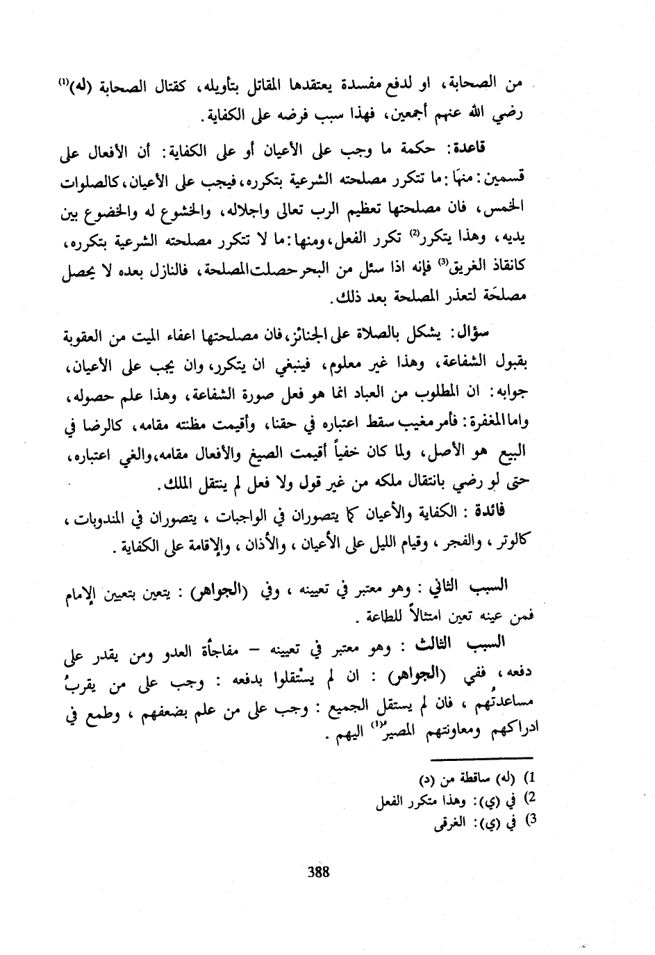 مِنَ الصَّحَابَةِ أَوْ لِدَفْعِ مَفْسَدَةٍ يَعْتَقِدُهَا الْمُقَاتِلُ بِتَأْوِيلِهِ كَقِتَالِ الصَّحَابَةِ لَهُ رَضِيَ اللَّهُ عَنْهُمْ أَجْمَعِينَ فَهَذَا سَبَبُ فَرْضِهِ عَلَى الْكِفَايَةِ قَاعِدَةٌ حِكْمَةُ مَا وَجَبَ عَلَى الْأَعْيَانِ أَوْ عَلَى الْكِفَايَةِ أَنَّ الْأَفْعَالَ عَلَى قِسْمَيْنِ مِنْهَا مَا تَتَكَرَّرُ مَصْلَحَتُهُ الشَّرْعِيَّةُ بِتَكَرُّرِهِ فَيَجِبُ عَلَى الْأَعْيَانِ كَالصَّلَوَاتِ الْخَمْسِ فَإِنَّ مَصْلَحَتَهَا تَعْظِيمُ الرَّبِّ تَعَالَى وَإِجْلَالُهُ وَالْخُشُوعُ لَهُ وَالْخُضُوعُ بَيْنَ يَدَيْهِ وَهَذَا يَتَكَرَّرُ تَكَرُّرَ الْفِعْلِ وَمِنْهَا مَا لَا تَتَكَرَّرُ مَصْلَحَتُهُ الشَّرْعِيَّةُ بِتَكَرُّرِهِ كَإِنْقَاذِ الْغَرِيقِ فَإِنَّهُ إِذَا سُئِلَ مِنَ الْبَحْرِ حَصَلَتِ الْمَصْلَحَةُ فَالنَّازِلُ بَعْدَهُ لَا يُحَصِّلُ مُصْلَحَةً لِتَعَذُّرِ الْمَصْلَحَةِ بَعْدَ ذَلِكَ سُؤَالٌ يُشْكِلُ بِالصَّلَاةِ عَلَى الْجَنَائِزِ فَإِنَّ مَصْلَحَتَهَا إِعْفَاءُ الْمَيِّتِ مِنَ الْعُقُوبَةِ بِقَبُولِ الشَّفَاعَةِ وَهَذَا غَيْرُ مَعْلُومٍ فَيَنْبَغِي أَنْ يَتَكَرَّرَ وَأَنْ يَجِبَ عَلَى الْأَعْيَانِ جَوَابُهُ أَنَّ الْمَطْلُوبَ مِنَ الْعِبَادِ إِنَّمَا هُوَ فِعْلُ صُورَةِ الشَّفَاعَةِ وَهَذَا عُلِمَ حُصُولُهُ وَأَمَّا الْمَغْفِرَةُ فَأَمْرٌ مُغَيَّبٌ سَقَطَ اعْتِبَارُهُ فِي حَقِّنَا وَأُقِيمَتْ مَظِنَّتُهُ مَقَامَهُ كَالرِّضَا فِي الْبَيْعِ هُوَ الْأَصْلُ وَلَمَّا كَانَ خَفِيًّا أُقِيمَتِ الصِّيَغُ وَالْأَفْعَالُ مَقَامَهُ وَأُلْغِيَ اعْتِبَارُهُ حَتَّى لَوْ رَضِيَ بِانْتِقَالِ مِلْكِهِ مِنْ غَيْرِ قَوْلٍ وَلَا فِعْلٍ لَمْ يَنْتَقِلِ الْمِلْكُ فَائِدَةٌ الْكِفَايَةُ وَالْأَعْيَانُ كَمَا يُتَصَوَّرَانِ فِي الْوَاجِبَاتِ يُتَصَوَّرَانِ فِي الْمَنْدُوبَاتِ كَالْوِتْرِ وَالْفَجْرِ وَقِيَامِ اللَّيْلِ عَلَى الْأَعْيَانِ وَالْأَذَانِ وَالْإِقَامَةِ عَلَى الْكِفَايَةِ السَّبَبُ الثَّانِي وَهُوَ مُعْتَبَرٌ فِي تَعْيِينِهِ وَفِي الْجَوَاهِرِ يَتَعَيَّنُ بِتَعْيِينِ الْإِمَامِ فَمَنْ عَيَّنَهُ تَعَيَّنَ امْتِثَالًا لِلطَّاعَةِ السَّبَبُ الثَّالِثُ وَهُوَ مُعْتَبَرٌ فِي تَعْيِينِهِ مُفَاجَأَةَ الْعَدُوِّ وَمَنْ يَقْدِرُ عَلَى دَفْعِهِ فَفِي الْجَوَاهِرِ إِنْ لَمْ يَسْتَقِلُّوا بِدَفْعِهِ وَجَبَ عَلَى مَنْ يَقْرُبُ مُسَاعَدَتُهُمْ فَإِنْ لَمْ يَسْتَقِلَّ الْجَمِيعُ وَجَبَ عَلَى مَنْ عَلِمَ بِضَعْفِهِمْ وَطَمِعَ فِي إِدْرَاكِهِمْ وَمُعَاوَنَتِهِمُ الْمَصِيرُ إِلَيْهِمْ