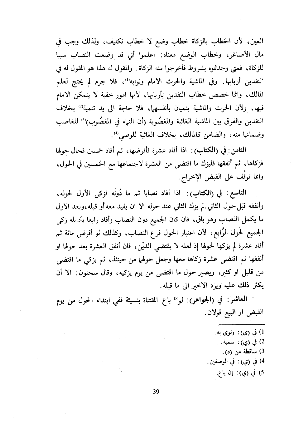 الْعَيْنِ لِأَنَّ الْخِطَابَ بِالزَّكَاةِ خِطَابُ وَضْعٍ لَا خِطَابَ تَكْلِيفٍ وَلِذَلِكَ وَجَبَ فِي مَالِ الْأَصَاغِرِ وَخِطَابُ الْوَضْعِ مَعْنَاهُ اعْلَمُوا أَنِّي قَدْ وَضَعْتُ النِّصَابَ سَبَبًا لِلزَّكَاةِ فَمَتَى وَجَدْتُمُوهُ بِشُرُوطٍ فَأَخْرِجُوا مِنْهُ الزَّكَاة وَالْمقول لَهُ هَذَا هُوَ الْمَقُول لَهُ فِي النَّقْدَيْنِ أَرْبَابُهَا وَفِي الْمَاشِيَةِ وَالْحَرْثِ الامام ونوابه فَلَا جرم لَمْ يَحْتَجْ لِعِلْمِ الْمَالِكِ وَإِنَّمَا خَصَّصَ خِطَّابَ النَّقْدَيْنِ بِأَرْبَابِهَا لِأَنَّهَا أُمُورٌ خَفِيَّةٌ لَا يَتَمَكَّنُ الْإِمَامُ فِيهَا وَلِأَنَّ الْحَرْثَ وَالْمَاشِيَةَ يَنْمَيَانِ بِأَنْفُسِهِمَا فَلَا حَاجَة الى يَد تنمية بِخِلَافِ النَّقْدَيْنِ وَالْفَرْقُ بَيْنَ الْمَاشِيَةِ الْغَائِبَةِ وَالْمَغْصُوبَةِ أَنَّ النَّمَاءَ فِي الْمَغْصُوبِ لِلْغَاصِبِ وَضَمَانُهَا مِنْهُ والضامن كالمالك بِخِلَاف الغائبة للْوَصِيّ الثَّامِن فِي الْكِتَابِ إِذَا أَفَادَ عَشْرَةً فَأَقْرَضَهَا ثُمَّ أَفَادَ خَمْسِينَ فَحَالَ حَوْلُهَا فَزَكَّاهَا ثُمَّ أَنْفَقَهَا فَلْيُزَكِّ مَا اقْتَضَى مِنَ الْعَشْرَةِ لِاجْتِمَاعِهَا مَعَ الْخَمْسِينَ فِي الْحَوْلِ وَإِنَّمَا تَوَقَّفَ عَلَى الْقَبْضِ الْإِخْرَاج التَّاسِع فِي الْكِتَابِ إِذَا أَفَادَ نِصَابًا ثُمَّ مَا دُونَهُ فَزَكَّى الْأَوَّلَ لِحَوْلِهِ وَأَنْفَقَهُ قَبْلَ حَوْلِ الثَّانِي لَمْ يُزَكِّ الثَّانِي عِنْدَ حَوْلِهِ إِلَّا أَنْ يُفِيدَ مَعَهُ أَوْ قَبْلَهُ وَبَعْدَ الْأَوَّلِ مَا يكمل النّصاب وَهُوَ بَاقٍ فَإِنْ كَانَ الْجَمِيعُ دُونَ النِّصَابِ وَأَفَادَ رَابِعًا يُكْمِلُهُ زَكَّى الْجَمِيعَ لِحَوَلِ الرَّابِعِ لِأَنَّ اعْتِبَارَ الْحَوْلِ فَرْعُ النِّصَابِ وَكَذَلِكَ لَوْ أَقْرَضَ مِائَةً ثُمَّ أَفَادَ عَشْرَةً لَمْ يُزَكِّهَا لِحَوْلِهَا إِذْ لَعَلَّهُ لَا يَقْتَضِي الدَّيْنَ فَإِنْ أَنْفَقَ الْعَشْرَةَ بَعْدَ حَوْلِهَا أَوْ أَنْفَقَهَا ثُمَّ اقْتَضَى عَشْرَةً زَكَّاهَا مَعَهَا وَجَعَلَ حَوْلَهُمَا مِنْ حِينَئِذٍ ثُمَّ يُزَكِّي مَا اقْتَضَى مِنْ قَلِيلٍ أَوْ كَثِيرٍ وَيَصِيرُ حَوْلُ مَا اقْتَضَى مِنْ يَوْمِ يُزَكِّيهِ وَقَالَ سَحْنُونٌ إِلَّا أَنْ يَكْثُرَ ذَلِكَ عَلَيْهِ وَيَرُدَّ الْأَخِيرَ إِلَى مَا قَبْلَهُ الْعَاشِر فِي الْجَوَاهِرِ لَوْ بَاعَ الْمُقْتِنَاةَ بِنَسِيئَةٍ فَفِي ابْتِدَاءِ الْحَوْلِ مِنْ يَوْمِ الْقَبْضِ أَوِ الْبَيْعِ قَولَانِ