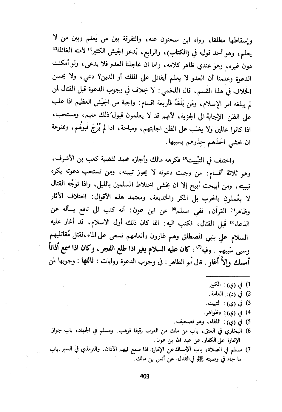 وَإِسْقَاطُهَا مُطْلَقًا رَوَاهُ ابْنُ سَحْنُونٍ عَنْهُ وَالتَّفْرِقَةُ بَيْنَ مَنْ يَعْلَمُ وَبَيْنَ مَنْ لَا يَعْلَمُ وَهُوَ أَحَدُ قَوْلَيْهِ فِي الْكِتَابِ وَالرَّابِعُ يَدْعُو الْجَيْش الْكَثْرَة لأمنه العائلة دُونَ غَيْرِهِ وَهُوَ عِنْدِي ظَاهِرُ كَلَامِهِ وَأَمَّا إِنْ عَاجَلَنَا الْعَدُوُّ فَلَا يُدْعَى وَلَوْ أَمْكَنَتِ الدَّعْوَةُ وَعَلِمْنَا أَنَّ الْعَدُوَّ لَا يَعْلَمُ أَيُقَاتَلُ عَن الْمُلْكِ أَوِ الدِّينِ دُعِيَ وَلَا يَحْسُنُ الْخِلَافُ فِي هَذَا الْقِسْمِ قَالَ اللَّخْمِيُّ لَا خِلَافَ فِي وُجُوبِ الدَّعْوَةِ قَبْلَ الْقِتَالِ لِمَنْ لَمْ يَبْلُغْهُ أَمْرُ الْإِسْلَامِ وَمَنْ بَلَغَهُ فَأَرْبَعَةُ أَقْسَامٍ وَاجِبَةٌ مِنَ الْجَيْشِ الْعَظِيمِ إِذَا غَلَبَ عَلَى الظَّن الْإِجَابَة على الْجِزْيَةِ لِأَنَّهُمْ قَدْ لَا يَعْلَمُونَ قَبُولَ ذَلِكَ مِنْهُمْ وَمُسْتَحَبٌّ إِذَا كَانُوا عَالِمِينَ وَلَا يَغْلِبُ عَلَى الظَّنِّ إِجَابَتُهُمْ وَمُبَاحَةٌ إِذَا لَمْ يُرْجَ قَبُولُهُمْ وَمَمْنُوعَةٌ إِنْ خُشِيَ أَحَدُهُمْ لِحَذَرِهِمْ بِسَبَبِهَا وَاخْتُلِفَ فِي التَّبْيِيتِ فَكَرِهَهُ مَالِكٌ وَأَجَازَهُ مُحَمَّدٌ لِقَضِيَّةِ كَعْبِ بْنِ الْأَشْرَفِ وَهُوَ ثَلَاثَةُ أَقْسَامٍ مَنْ وَجَبَتْ دَعْوَتُهُ لَا يَجُوزُ تَبْيِيتُهُ وَمَنْ تُسْتَحَبُّ دَعْوَتُهُ يُكْرَهُ تَبْيِيتُهُ وَمَنْ أُبِيحَتْ أُبِيحَ إِلَّا أَن يخْشَى اخْتِلَاط الْمُسلمين بِاللَّيْلِ وغذ تَوَجَّهَ الْقِتَالُ لَا يَعْمَلُونَ بِالْحَرْبِ بَلِ الْمَكْرُ وَالْخَدِيعَةُ وَمُعْتَمَدُ هَذِهِ الْأَقْوَالِ اخْتِلَافُ الْآثَارِ وَظَاهِرُ الْقُرْآنِ فَفِي مُسْلِمٍ عَنِ ابْنِ عَوْنٍ أَنَّهُ كَتَبَ إِلَى نَافِعٍ يَسْأَلُهُ عَنِ الدُّعَاءِ قَبْلَ الْقِتَالِ فَكَتَبَ إِلَيْهِ إِنَّمَا كَانَ ذَلِكَ أَوَّلَ الْإِسْلَام قد أغار عَلَيْهِ السَّلَام عَليّ بِنَبِي المصطلق وَهُوَ غَارُّونَ وَأَنْعَامُهُمْ تَسْعَى عَلَى الْمَاءِ فَقَتَلَ مُقَاتِلِيهِمْ وسبى سَبْيهمْ وَفِيه كَانَ - صَلَّى اللَّهُ عَلَيْهِ وَسَلَّم َ - يُغِيرُ إِذَا طَلَعَ الْفَجْرُ وَكَانَ إِذَا سَمِعَ أَذَانًا أَمْسَكَ وَإِلَّا أَغَارَ قَالَ أَبُو الطَّاهِرِ فِي وجوب الدعْوَة وَرِوَايَات ثَالِثُهَا وُجُوبُهَا لِمَنْ