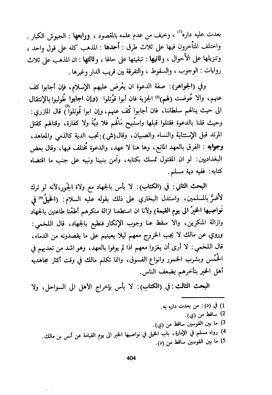 بَعُدَتْ عَلَيْهِ دَارُهُ وَخِيفَ مِنْ عَدَمِ عِلْمِهِ بِالْمَقْصُودِ وَرَابِعُهَا الْجُيُوشُ الْكِبَارُ وَاخْتَلَفَ الْمُتَأَخِّرُونَ فِيهَا عَلَى ثَلَاثِ طُرُقٍ أَحَدُهَا الْمَذْهَبُ كُلُّهُ عَلَى قَوْلٍ وَاحِدٍ وَتَنْزِيلُهَا عَلَى الْأَحْوَالِ وَثَانِيهَا تَبْقِيَتُهَا عَلَى حَالِهَا وَثَالِثُهَا أَنَّ الْمَذْهَبَ عَلَى ثَلَاثِ رِوَايَاتٍ الْوُجُوبُ وَالسُّقُوطُ وَالتَّفْرِقَةُ بَيْنَ قَرِيبِ الدَّارِ وَغَيْرِهَا وَفِي الْجَوَاهِرِ صِفَةُ الدَّعْوَةِ أَنْ يَعْرِضَ عَلَيْهِمُ الْإِسْلَامَ فَإِنْ أَجَابُوا كَفَّ عَنْهُمْ وَإِلَّا عُوِّضَتْ لَهُمُ الْجِزْيَةُ فَإِنْ أَبَوْا قُوتِلُوا وَإِنْ أَجَابُوا طُولِبُوا بِالِانْتِقَالِ إِلَى حَيْثُ يَنَالُهُمْ سُلْطَانُنَا فَإِنْ أَجَابُوا كُفَّ عَنْهُمْ وَإِنْ أَبَوْا قُوتِلُوا قَالَ الْمَازِرِيُّ وَحَيْثُ قُلْنَا بِالدَّعْوَةِ فَقُتِلُوا قَبْلَهَا وَاسْتُبِيحَ مَالُهُمْ فَلَا دِيَةَ وَلَا كَفَّارَةَ وَقِتَالُهُمْ كَقَتْلِ الْمُرْتَدِّ قَبْلَ الِاسْتِتَابَةِ وَالنِّسَاءِ وَالصِّبْيَانِ وَقَالَ ش تَجِبُ الدِّيَةُ كَالذِّمِّيِّ وَالْمُعَاهَدِ وَجَوَابُهُ الْفَرْقُ بالعهد الْمَانِع وَهَا هُنَا لَا عَهْدَ وَالدَّعْوَةُ مُخْتَلَفٌ فِيهَا وَقَالَ بَعْضُ البغداديين لَو أَن الْمَقْتُول تمسك بكتابه وآمن بنبينا وَنبيه على جنب مَا اقْتَضَاهُ كِتَابُهُ فَفِيهِ دِيَةُ مُسْلِمٍ الْبَحْثُ الثَّانِي فِي الْكِتَابِ لَا بَأْسَ بِالْجِهَادِ مَعَ وُلَاةِ الْجَوْرِ لِأَنَّهُ لَوْ تُرِكَ لَأَضَرَّ بِالْمُسْلِمِينَ وَاسْتدلَّ البُخَارِيّ على ذَلِك