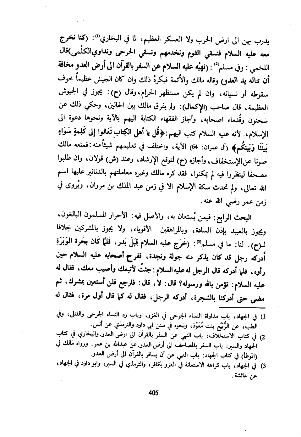 نَهْيه - صَلَّى اللَّهُ عَلَيْهِ وَسَلَّم َ - عَن السّفر بِالْقُرْآنِ إِلَى أَرْضِ الْعَدُوِّ مَخَافَةَ أَنْ تَنَالَهُ يَدُ الْعَدُوِّ وَقَالَهُ مَالِكٌ وَالْأَئِمَّةُ فَيُكْرَهُ ذَلِكَ وَإِنْ كَانَ الْجَيْشُ عَظِيمًا خَوْفَ سُقُوطِهِ أَوْ نِسْيَانِهِ وَإِنْ لَمْ يَكُنْ مُسْتَظْهِرَ الْحَرَامِ وَقَالَ ح يَجُوزُ فِي الْجُيُوشِ الْعَظِيمَةِ قَالَ صَاحِبُ الْإِكْمَالِ وَلَمْ يُفَرِّقْ مَالِكٌ بَيْنَ الْحَالَيْنِ وَحُكِيَ ذَلِكَ عَنْ سَحْنُونٍ وَقُدَمَاءِ أَصْحَابِهِ وَأَجَازَ الْفُقَهَاءُ الْكِتَابَةَ إِلَيْهِمْ بِالْآيَةِ وَنَحْوِهَا دَعْوَةً إِلَى الْإِسْلَامِ لِأَنَّهُ - صَلَّى اللَّهُ عَلَيْهِ وَسَلَّم َ - كَتَبَ إِلَيْهِمْ {قُلْ يَا أَهْلَ الْكِتَابِ تَعَالَوْا إِلَى كَلِمَةٍ سَوَاءٍ بَيْنَنَا وَبَيْنَكُمْ} آل عمرَان 64 الْآيَةَ وَاخْتُلِفَ فِي تَعْلِيمِهِمْ شَيْئًا مِنْهُ فَمَنَعَهُ مَالِكٌ صَوْنًا عَنِ الِاسْتِخْفَافِ وَأَجَازَهُ ح لِتَوَقُّعِ الْإِرْشَاد وَعند ش قَولَانِ إِن طَلَبُوا مُصْحَفًا لِيَنْظُرُوا فِيهِ لَمْ يُمَكَّنُوا فَقَدْ كَرِهَ مَالِكٌ وَغَيْرُهُ مُعَامَلَتَهُمْ بِالدَّنَانِيرِ عَلَيْهَا اسْمُ اللَّهِ تَعَالَى وَلَمْ تَحْدُثْ سِكَّةُ الْإِسْلَامِ إِلَّا فِي زَمَنِ عَبْدِ الْمَلِكِ بْنِ مَرْوَانَ وَيُرْوَى فِي زَمَنِ عُمَرَ رَضِيَ اللَّهُ عَنْهُ الْبَحْثُ الرَّابِعُ فِيمَنْ يُسْتَعَانُ بِهِ وَالْأَصْلُ فِيهِ الْأَحْرَارُ الْمُسْلِمُونَ الْبَالِغُونَ وَيَجُوزُ بِالْعَبِيدِ بِإِذْنِ السَّادَةِ وَبِالْمُرَاهِقِينَ الأقوياء وَلَا يجوز بالمشركين خلافًا ل ح لنا مَا فِي مُسلم