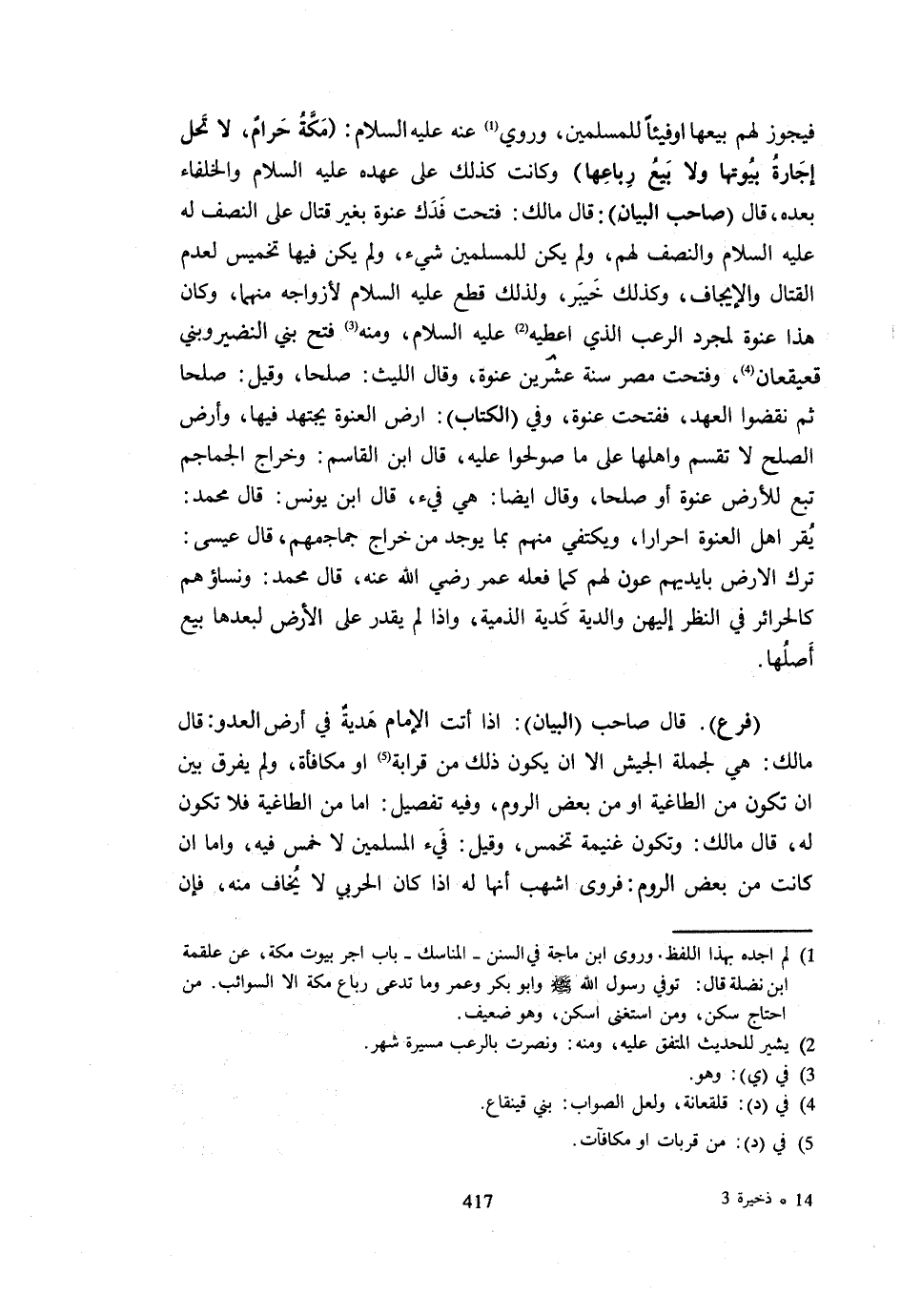 وفيجوز لَهُمْ بَيْعُهَا أَوْ فَيْئًا لِلْمُسْلِمِينَ وَرُوِيَ عَنْهُ - صَلَّى اللَّهُ عَلَيْهِ وَسَلَّم َ - مَكَّةُ حَرَامٌ لَا تَحِلُّ إِجَارَةُ بُيُوتِهَا وَلَا بيع رباعها وَكَانَ كَذَلِك على عَهده - صَلَّى اللَّهُ عَلَيْهِ وَسَلَّم َ - وَالْخُلَفَاءِ بَعْدَهُ قَالَ صَاحِبُ الْبَيَانِ قَالَ مَالِكٌ فُتِحَتْ فَدَكُ عَنْوَةً بِغَيْرِ قِتَالٍ عَلَى النِّصْفِ لَهُ - صَلَّى اللَّهُ عَلَيْهِ وَسَلَّم َ - وَالنِّصْفِ لَهُمْ وَلَمْ يَكُنْ لِلْمُسْلِمِينَ شَيْءٌ وَلَمْ يَكُنْ فِيهَا تَخْمِيسٌ لِعَدَمِ الْقِتَالِ وَالْإِيجَافِ وَكَذَلِكَ خَيْبَر وَلذَلِك قطع - صَلَّى اللَّهُ عَلَيْهِ وَسَلَّم َ - لأزواجة فهما وَكَانَ هَذَا عَنْوَةً لِمُجَرَّدِ الرُّعْبِ الَّذِي أُعْطِيَهُ - صَلَّى اللَّهُ عَلَيْهِ وَسَلَّم َ - وَمِنْه فتح بني النَّضِير وَبني قعيقعان وَفتحت مصر سنة عشرُون عَنْوَةً وَقَالَ الْلَّيْثُ صُلْحًا وَقِيلَ صُلْحًا ثُمَّ نَقَضُوا الْعَهْدَ فَفُتِحَتْ عَنْوَةً وَفِي الْكِتَابِ أَرْضُ الْعَنْوَةِ يُجْتَهَدُ فِيهَا وَأَرْضُ الصُّلْحِ لَا تُقْسَمُ وَأَهْلُهَا عَلَى مَا صُولِحُوا عَلَيْهِ قَالَ ابْنُ الْقَاسِمِ وَخَرَاجُ الْجَمَاجِمِ تَبَعٌ لِلْأَرْضِ عَنْوَةً أَوْ صُلْحًا وَقَالَ أَيْضًا هِيَ فَيْءٌ قَالَ ابْنُ يُونُسَ قَالَ مُحَمَّدٌ يُقَرُّ أَهْلُ الْعَنْوَةِ أَحْرَارًا وَيَكْتَفِي مِنْهُمْ بِمَا يُوجَدُ مِنْ خَرَاجِ جَمَاجِمِهِمْ قَالَ عِيسَى تَرْكُ الْأَرْضِ بِأَيْدِيهِمْ عَوْنٌ لَهُمْ كَمَا فَعَلَهُ عُمَرُ رَضِيَ اللَّهُ عَنْهُ قَالَ مُحَمَّدٌ وَنِسَاؤُهُمْ كَالْحَرَائِرِ فِي النَّظَرِ إِلَيْهِنَّ وَالدِّيَةُ كَدِيَةِ الذِّمِّيَّةِ وَإِذَا لَمْ يُقْدَرُ عَلَى الْأَرْضِ لِبُعْدِهَا بِيعَ أَصْلُهَا فَرْعٌ قَالَ صَاحِبُ الْبَيَانِ إِذَا أَتَتِ الْإِمَامَ هَدِيَّةٌ فِي أَرْضِ الْعَدُوِّ قَالَ مَالِكٌ هِيَ لِجُمْلَةِ الْجَيْشِ إِلَّا أَنْ يَكُونَ ذَلِكَ مِنْ قَرَابَةٍ أَوْ مُكَافَأَةٍ وَلَمْ يُفَرِّقْ بَيْنَ أَنْ تَكُونَ مِنَ الطَّاغِيَةِ أَوْ مِنْ بَعْضِ الرُّومِ وَفِيهِ تَفْصِيلٌ أَمَّا مِنَ الطَّاغِيَةِ فَلَا تَكُونُ لَهُ قَالَ مَالِكٌ وَتَكُونُ غَنِيمَةً تُخَمَّسُ وَقِيلَ فَيْءُ الْمُسْلِمِينَ لَا خُمُسَ فِيهِ وَأَمَّا إِنْ كَانَتْ مِنْ بَعْضِ الرُّومِ فَرَوَى أَشْهَبُ أَنَّهَا لَهُ إِذَا كَانَ الْحَرْبِيُّ لَا يُخَافُ مِنْهُ فَإِنْ