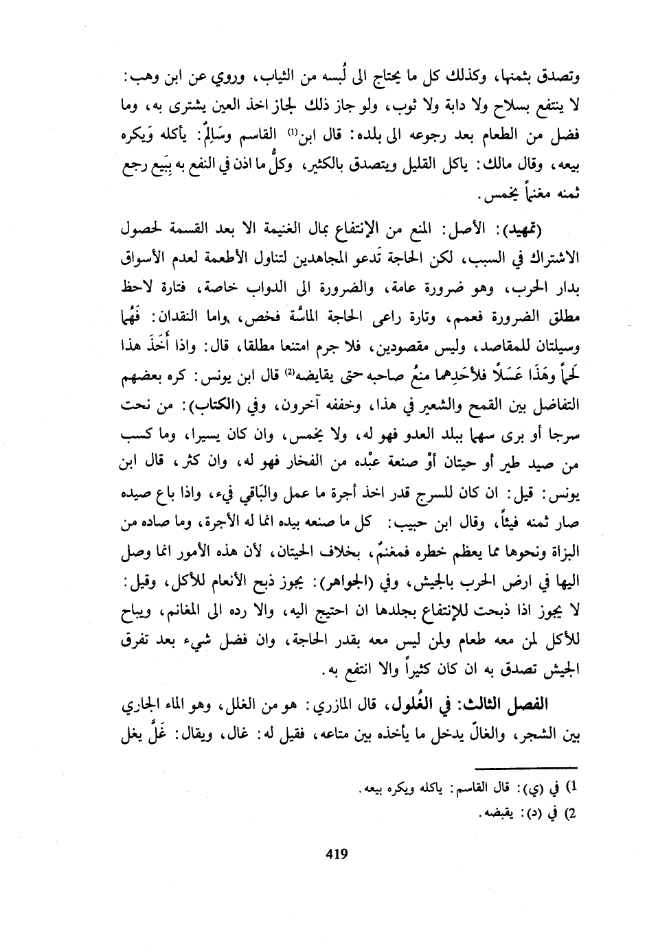 وَتَصَدَّقَ بِثَمَنِهَا وَكَذَلِكَ كُلُّ مَا يُحْتَاجُ إِلَى لُبْسِهِ مِنَ الثِّيَابِ وَرُوِيَ عَنِ ابْنِ وَهْبٍ لَا يَنْتَفِعُ بِسِلَاحٍ وَلَا دَابَّةٍ وَلَا ثَوْبٍ وَلَوْ جَازَ ذَلِكَ لَجَازَ أَخَذُ الْعَيْنِ يَشْتَرِي بِهِ وَمَا فَضَلَ مِنَ الطَّعَامِ بَعْدَ رُجُوعِهِ إِلَى بَلَدِهِ قَالَ ابْنُ الْقَاسِمِ وَسَالِمٌ يَأْكُلُهُ وَيُكْرَهُ بَيْعُهُ وَقَالَ مَالِكٌ يَأْكُلُ الْقَلِيلَ وَيَتَصَدَّقُ بِالْكَثِيرِ وَكُلُّ مَا أُذِنَ فِي النَّفْعِ بِهِ بِبَيْعٍ رَجَعَ ثَمَنُهُ مَغْنَمًا يُخَمَّسُ تَمْهِيدٌ الْأَصْلُ الْمَنْع من الِانْتِفَاع بِمَال الْغَنِيمَة لَا بَعْدَ الْقِسْمَةِ لِحُصُولِ الِاشْتِرَاكِ فِي السَّبَبِ لَكِنَّ الْحَاجة تَدْعُو الْمُجَاهدين لتناول الْأَطْعِمَة لعدم الْأَسْوَاق بدار الْحَرْب وَهُوَ ضَرُورَة عَامَّة وضرورة إِلَى الدَّوَابِّ خَاصَّةٌ فَتَارَةً لَاحَظَ مُطْلَقَ الضَّرُورَةِ فَعَمَّمَ وَتَارَةً رَاعَى الْحَاجَةَ الْمَاسَّةَ فَخَصَّ وَأَمَّا النقدان فهما وسيلتان للمقاصد وَلَيْسَ مَقْصُودَيْنِ فَلَا جَرَمَ امْتَنَعَا مُطْلَقًا قَالَ وَإِذَا أَخَذَ هَذَا لَحْمًا وَهَذَا عَسَلًا فَلِأَحَدِهِمَا مَنْعُ صَاحِبِهِ حَتَّى يُقَايِضَهُ قَالَ ابْنُ يُونُسَ كَرِهَ بَعْضُهُمُ التَّفَاضُلَ بَيْنَ الْقَمْحِ وَالشَّعِيرِ فِي هَذَا وَخَفَّفَهُ آخَرُونَ وَفِي الْكِتَابِ مَنْ نَحَتَ سَرْجًا أَوْ بَرَى سَهْمًا بِبَلَدِ الْعَدُوِّ فَهُوَ لَهُ وَلَا يُخَمَّسُ وَإِنْ كَانَ يَسِيرًا وَمَا كَسَبَ مِنْ صَيْدِ طَيْرٍ أَوْ حِيتَانٍ أَوْ صَنَعَةُ عَبْدُهُ مِنَ الْفَخَّارِ فَهُوَ لَهُ وَإِنْ كَثُرَ قَالَ ابْنُ يُونُسَ قِيلَ إِنْ كَانَ لِلسَّرْجِ قَدْرٌ أَخَذَهُ أُجْرَةَ مَا عَمِلَ وَالْبَاقِي فَيْءٌ وَإِذا بَاعَ صيدا صَارَ ثَمَنُهُ فَيْئًا وَقَالَ ابْنُ حَبِيبٍ كُلُّ مَا صَنَعَهُ بِيَدِهِ إِنَّمَا لَهُ الْأُجْرَةُ وَمَا صَادَهُ مِنَ الْبُزَاةِ وَنَحْوِهَا مِمَّا يَعْظُمُ خَطَرُهُ فَمَغْنَمٌ بِخِلَافِ الْحِيتَانِ لِأَنَّ هَذِهِ الْأُمُورَ إِنَّمَا وُصِلَ إِلَيْهَا فِي أَرْضِ الْحَرْبِ بِالْجَيْشِ وَفِي الْجَوَاهِر يجوز ذبح الْأَنْعَام للْأَكْل وَيَقُول لَا يَجُوزُ إِذَا ذُبِحَتْ لِلِانْتِفَاعِ بِجِلْدِهَا إِنِ احْتِيجَ إِلَيْهِ وَإِلَّا رَدَّهُ إِلَى الْمَغَانِمِ وَيُبَاحُ لِلْأَكْلِ لِمَنْ مَعَهُ طَعَامٌ وَلِمَنْ لَيْسَ مَعَهُ بِقَدْرِ الْحَاجَةِ وَإِنْ فَضَلَ شَيْءٌ بَعْدَ تَفَرُّقِ الْجَيْشِ تَصَدَّقَ بِهِ إِنْ كَانَ كَثِيرًا وَإِلَّا انْتَفَعَ بِهِ الْفَصْلُ الثَّالِثُ فِي الْغُلُولِ قَالَ الْمَازِرِيُّ هُوَ مِنَ الْغَلَلِ وَهُوَ الْمَاءُ الْجَارِي بَيْنَ الشَّجَرِ وَالْغَالُّ يُدْخِلُ مَا يَأْخُذُهُ بَيْنَ مَتَاعِهِ فَقِيلَ لَهُ غَالٌّ وَيُقَالُ غَلَّ يَغُلُّ