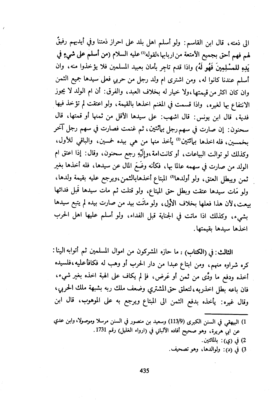 مَنْ أَسْلَمَ عَلَى شَيْءٍ فِي يَدِهِ لِلْمُسْلِمِينَ فَهُوَ لَهُ وَإِذَا قَدِمَ تَاجِرٌ بِأَمَانٍ بِعَبِيدِ الْمُسلمين فَلَا يؤخذوا مِنْهُ وَإِنْ أَسْلَمَ عِنْدِنَا كَانُوا لَهُ وَمَنِ اشْتَرَى أُمَّ وَلَدِ رَجُلٍ مِنْ حَرْبِيٍّ فَعَلَى سَيِّدِهَا جَمِيعُ الثَّمَنِ وَإِنْ كَانَ أَكْثَرَ مِنْ قِيمَتِهَا وَلَا خِيَارَ لَهُ بِخِلَافِ الْعَبْدِ وَالْفَرْقُ أَنَّ أُمَّ الْوَلَدِ لَا يَجُوزُ الِانْتِفَاعُ بِهَا لغيره وَإِذَا قُسِمَتْ فِي الْمَغْنَمِ أَخَذَهَا بِالْقِيمَةِ وَلَوْ أُعْتِقَتْ لَمْ تُؤْخَذْ فِيهَا فِدْيَةٌ قَالَ ابْنُ يُونُسَ قَالَ أَشْهَبُ عَلَى سَيِّدِهَا الْأَقَلُّ مِنْ ثمنهَا أَو قمتها قَالَ سَحْنُونٌ إِنْ صَارَتْ فِي سَهْمِ رَجُلٍ بِمِائَتَيْنِ ثُمَّ غُنِمَتْ فَصَارَتْ فِي سَهْمِ رَجُلٍ آخَرَ بِخَمْسِينَ فَلَهُ أَخْذُهَا بِمِائَتَيْنِ يَأْخُذُ مِنْهَا مَنْ هِيَ بِيَدِهِ خَمْسِينَ وَالْبَاقِي لِلْأَوَّلِ وَكَذَلِكَ لَوْ تَوَالَتِ الْبِيَاعَاتُ أَوْ كَانَتْ أَمَةً وَإِلَيْهِ رَجَعَ سَحْنُونٌ وَقَالَ إِذَا أَعْتَقَ أُمَّ الْوَلَدِ مَنْ صَارَتْ فِي سَهْمِهِ عَالِمًا بِهَا فَكَأَنَّهُ وَضَعَ الْمَالَ عَنْ سَيِّدِهَا فَلَهُ أَخْذُهَا بِغَيْرِ ثَمَنٍ وَيَبْطُلُ الْعِتْقُ وَلَوْ أَوْلَدَهَا الْمُبْتَاعُ أَخَذَهَا بِالثَّمَنِ وَيُرْجَعُ عَلَيْهِ بِقِيمَةِ وَلَدِهَا وَلَوْ مَاتَ سَيِّدهَا عتقت وَبَطل حق الميتاع وَلَوْ قَتَلَتْ ثُمَّ مَاتَ سَيِّدُهَا قَبْلَ فِدَائِهَا بِيعَتْ لِأَنَّ هَذَا فِعْلُهَا بِخِلَافِ الْأَوَّلِ وَلَوْ مَاتَتْ بِيَدِ مَنْ صَارَتْ بِيَدِهِ لَمْ يُتْبَعْ سَيِّدُهَا بِشَيْءٍ وَكَذَلِكَ إِذَا مَاتَتْ فِي الْجِنَايَةِ قَبْلَ الْفِدَاءِ وَلَوْ أَسْلَمَ عَلَيْهَا أَهْلُ الْحَرْبِ أَخَذَهَا سَيِّدُهَا بِقِيمَتِهَا الثَّالِثُ فِي الْكِتَابِ مَا حازه الْمُشْركُونَ من أَمْوَال الْمُسلمين ثمَّ أتوابه إِلَيْنَا كره شراوه مِنْهُمْ وَمَنِ ابْتَاعَ عَبْدًا مِنْ دَارِ الْحَرْبِ أَوْ وُهِبَ لَهُ فَكَافَأَ عَلَيْهِ فَلِسَيِّدِهِ أَخْذُهُ وَدفع مَا ودى من ثمن أَو عرض فإلم لم يكاف عَلَى الْهِبَةِ أَخَذَهُ بِغَيْرِ شَيْءٍ فَإِنْ بَاعَهُ بَطَلَ أَخْذُ رَبِّهِ لِتَعَلُّقِ حَقِّ الْمُشْتَرِي وَضَعْفِ مِلْكِ رَبِّهِ بِشُبْهَةِ مِلْكِ الْحَرْبِيِّ وَقَالَ غَيْرُهُ يَأْخُذُهُ بِدَفْعِ الثَّمَنِ إِلَى الْمُبْتَاعِ وَيَرْجِعُ بِهِ عَلَى الْمَوْهُوبِ قَالَ ابْنُ
