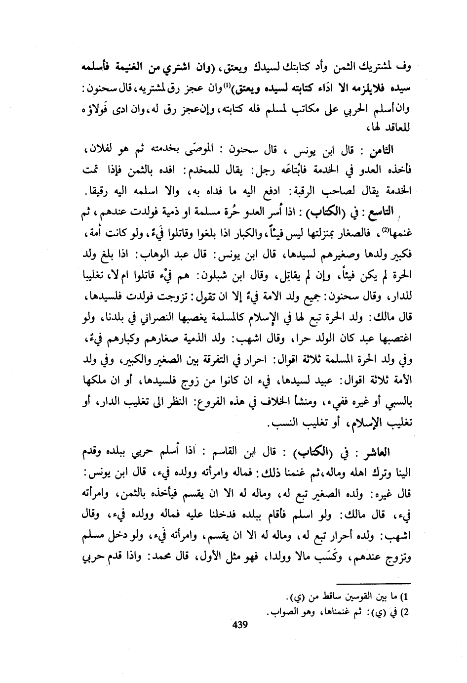 وف لمشتريك الثّمن وأد كتابتك لسيدك وَيعتق وَإِنِ اشْتُرِيَ مِنَ الْغَنِيمَةِ فَأَسْلَمَهُ سَيِّدُهُ فَلَا يلْزمه إِلَّا أَدَاء كِتَابه لِسَيِّدِهِ وَيُعْتَقُ وَإِنْ عَجَزَ رُقَّ لِمُشْتَرِيهِ قَالَ سَحْنُونٌ وَإِنْ أَسْلَمَ الْحَرْبِيُّ عَلَى مُكَاتَبِ لِمُسْلِمٍ فَلَهُ كِتَابَتُهُ وَإِنْ عَجَزَ رُقَّ لَهُ وَإِنْ أَدَّى فَوَلَاؤُهُ لِلْعَاقِدِ لَهَا الثَّامِنُ قَالَ ابْنُ يُونُس قَالَ سَحْنُون الْمُوصَى بِخِدْمَتِهِ ثُمَّ هُوَ لِفُلَانٍ فَأَخَذَهُ الْعَدُوُّ فِي الْخِدْمَةِ فَابْتَاعَهُ رَجُلٌ يُقَالُ لِلْمُخْدَمِ افْدِهِ بِالثَّمَنِ فَإِذَا تَمَّتِ الْخِدْمَةُ يُقَالُ لِصَاحِبِ الرَّقَبَةِ ادْفَعْ إِلَيْهِ مَا فَدَاهُ بِهِ وَإِلَّا أَسْلِمْهُ إِلَيْهِ رَقِيقًا التَّاسِعُ فِي الْكِتَابِ إِذَا أَسَرَ الْعَدُوُّ حُرَّةً مَسْلَمَةً أَوْ ذِمِّيَّةً فَوَلِدَتْ عِنْدَهُمْ ثُمَّ غَنِمَهَا فَالصِّغَارُ بِمَنْزِلَتِهَا لَيْسَ فَيْئًا وَالْكِبَارُ إِذَا بَلَغُوا وَقَاتَلُوا فَيْءٌ وَلَوْ كَانَتْ أَمَةً فَكَبِيرُ وَلَدِهَا وَصَغِيرُهُمْ لِسَيِّدِهَا قَالَ ابْنُ يُونُسَ قَالَ عَبْدُ الْوَهَّابِ إِذَا بَلَغَ وَلَدُ الْحُرَّةِ لَمْ يَكُنْ فَيْئًا وَإِنْ لَمْ يُقَاتِلْ وَقَالَ ابْنُ شَبْلُونٍ هُمْ فَيْءٌ قَاتَلُوا أَمْ لَا تَغْلِيبًا لِلدَّارِ وَقَالَ سَحْنُونٌ جَمِيعُ وَلَدِ الْأَمَةِ فَيْءٌ إِلَّا أَنْ تَقُولَ تَزَوَّجْتُ فَوَلَدْتُ فَلِسَيِّدِهَا قَالَ مَالِكٌ وَلَدُ الْحُرَّةِ تَبَعٌ لَهَا فِي الْإِسْلَامِ كَالْمُسْلِمَةِ يَغْصِبُهَا النَّصْرَانِيُّ فِي بَلَدِنَا وَلَوِ اغْتَصَبَهَا عَبْدٌ كَانَ الْوَلَدُ حُرًّا وَقَالَ أَشْهَبُ وَلَدُ الذِّمِّيَّةِ صِغَارُهُمْ وَكِبَارُهُمْ فَيْءٌ وَفِي وَلَدِ الْحرَّة الْمسلمَة ثَلَاثَة أَقْوَال أَحْرَار فِي التَّفْرِقَةِ بَيْنَ الصَّغِيرِ وَالْكَبِيرِ وَفِي وَلَدِ الْأَمَةِ ثَلَاثَةُ أَقْوَالٍ عَبِيدٌ لِسَيِّدِهَا فَيْءٌ إِنْ كَانُوا مِنْ زَوْجٍ فَلِسَيِّدِهَا أَوْ إِنْ مَلَكَهَا بِالسَّبْيِ أَوْ غَيْرِهِ فَفَيْءٌ وَمَنْشَأُ الْخِلَافِ فِي هَذِهِ الْفُرُوعِ النَّظَرُ إِلَى تَغْلِيبِ الدَّارِ أَوْ تَغْلِيبِ الْإِسْلَامِ أَوْ تَغْلِيبِ النَّسَبِ الْعَاشِرُ فِي الْكِتَابِ قَالَ ابْنُ الْقَاسِمِ إِذَا أَسْلَمَ حَرْبِيٌّ بِبَلَدِهِ وَقَدِمَ إِلَيْنَا وَتَرَكَ أَهْلَهُ وَمَالَهُ ثُمَّ غَنِمْنَا ذَلِكَ فَمَالُهُ وَامْرَأَتُهُ وَوَلَدُهُ فَيْءٌ قَالَ ابْنُ يُونُسَ قَالَ غَيْرُهُ وَلَدُهُ الصَّغِيرُ تَبَعٌ لَهُ وَمَالُهُ لَهُ إِلَّا أَنْ يُقْسَمَ فَيَأْخُذُهُ بِالثَّمَنِ وَامْرَأَتُهُ فَيْءٌ قَالَ مَالِكٌ وَلَوْ أَسْلَمَ فَأَقَامَ بِبَلَدِهِ فَدَخَلْنَا عَلَيْهِ فَمَالُهُ وَوَلَدُهُ فَيْءٌ وَقَالَ أَشْهَبُ وَلَدُهُ أَحْرَارٌ تَبَعٌ لَهُ وَمَالُهُ لَهُ إِلَّا أَنْ يُقْسَمَ وَامْرَأَتُهُ فَيْءٌ وَلَوْ دَخَلَ مُسْلِمٌ وَتَزَوَّجَ عِنْدَهُمْ وَكَسَبَ مَالًا وَوَلَدًا فَهُوَ مِثْلُ الْأَوَّلِ قَالَ مُحَمَّدٌ وَإِذَا قَدِمَ حَرْبِيٌّ