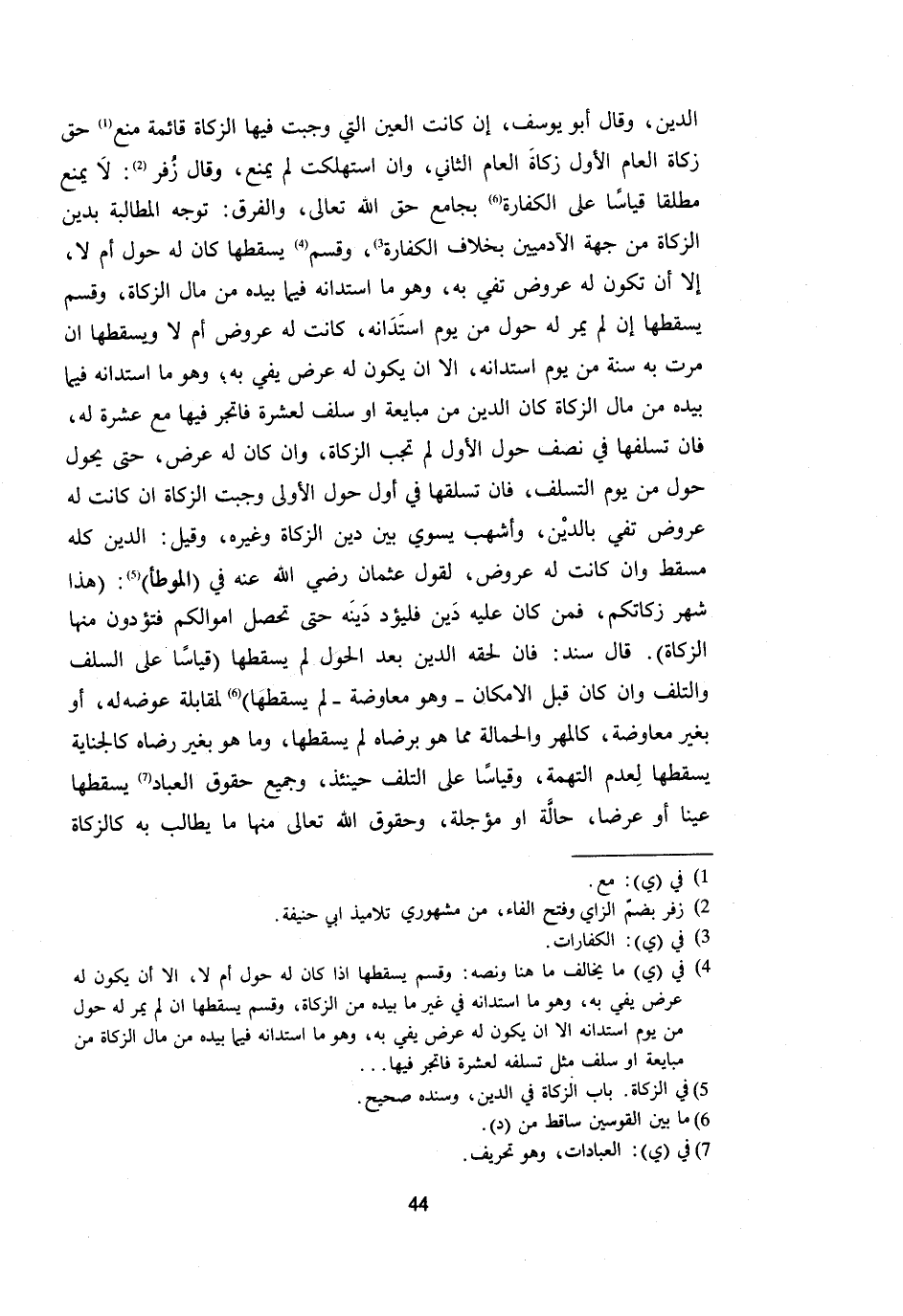 الدَّيْنِ وَقَالَ أَبُو يُوسُفَ إِنْ كَانَتِ الْعَيْنُ الَّتِي وَجَبَتْ فِيهَا الزَّكَاةُ قَائِمَةً مَنَعَ حَقَّ زَكَاةِ الْعَامِ الْأَوَّلِ زَكَاةَ الْعَامِ الثَّانِي وَإِنِ اسْتُهْلِكَتْ لَمْ يَمْنَعْ وَقَالَ زُفَرُ لَا يُمْنَعُ مُطْلَقًا قِيَاسًا عَلَى الْكَفَّارَةِ بِجَامِعِ حَقِّ اللَّهِ تَعَالَى وَالْفَرْقُ تَوَجُّهُ الْمُطَالَبَةِ بِدَيْنِ الزَّكَاةِ مِنْ جِهَةِ الْآدَمِيِّينَ بِخِلَافِ الْكَفَّارَةِ وَقِسْمٌ يُسْقِطُهَا كَانَ لَهُ حَوْلٌ أَمْ لَا إِلَّا أَنْ تَكُونَ لَهُ عُرُوضٌ تَفِي بِهِ وَهُوَ مَا اسْتَدَانَهُ فِيمَا بِيَدِهِ مِنْ مَالِ الزَّكَاةِ وَقِسْمٌ يُسْقِطُهَا إِنْ لم يمر لَهُ حول من يَوْم استدانه كَانَتْ لَهُ عُرُوضٌ أَمْ لَا وَيُسْقِطُهَا إِنْ مرت بِهِ سنة من يَوْم استدانه إِلَّا أَنْ يَكُونَ لَهُ عَرْضٌ يَفِي بِهِ وَهُوَ مَا اسْتَدَانَهُ فِيمَا بِيَدِهِ مِنْ مَالِ الزَّكَاةِ كَانَ الدَّيْنُ مِنْ مُبَايَعَةٍ أَوْ سَلَفٍ لِعَشَرَةٍ فَاتجر فِيهَا مَعَ عِشْرَةٍ لَهُ فَإِنْ تَسَلَّفَهَا فِي نِصْفِ حَوْلِ الْأَوَّلِ لَمْ تَجِبِ الزَّكَاةُ وَإِنْ كَانَ لَهُ عَرْضٌ حَتَّى يَحُولَ حول من يَوْم التسلف فان تسلقها فِي أَوَّلِ حَوْلِ الْأَوْلَى وَجَبَتِ الزَّكَاةُ إِنْ كَانَت لَهُ عرُوض تفي بِالدّينِ وَأَشْهَب يُسَوِّي بَيْنَ دَيْنِ الزَّكَاةِ وَغَيْرِهِ وَقِيلَ الدَّيْنُ كُلُّهُ مُسْقِطٌ وَإِنْ كَانَتْ لَهُ عُرُوضٌ لِقَوْلِ عُثْمَانَ رَضِيَ اللَّهُ عَنْهُ فِي الْمُوَطَّأِ هَذَا شَهْرُ زَكَاتكُمْ فَمن كَانَ عَلَيْهِ دين فليؤد دينه حَتَّى تحصل اموالكم فتؤدون مِنْهَا الزَّكَاةَ قَالَ سَنَدٌ فَإِنْ لَحِقَهُ الدَّيْنُ بَعْدَ الْحَوْلِ لَمْ يُسْقِطْهَا قِيَاسًا عَلَى السَّلَفِ وَالتَّلَفِ وَإِنْ كَانَ قَبْلَ الْإِمْكَانِ وَهُوَ مُعَاوَضَةٌ لَمْ يُسْقِطْهَا لِمُقَابَلَةِ عِوَضِهِ لَهُ أَوْ بِغَيْرِ مُعَاوَضَةٍ كَالْمَهْرِ وَالْحِمَالَةِ مِمَّا هُوَ بِرِضَاهُ لَمْ يُسْقِطْهَا وَمَا هُوَ بِغَيْرِ رِضَاهُ كَالْجِنَايَةِ يُسْقِطُهَا لِعَدَمِ التُّهْمَةِ وَقِيَاسًا عَلَى التَّلَفِ حِينَئِذٍ وَجَمِيعِ حُقُوقِ الْعِبَادِ يُسْقِطُهَا عَيْنًا أَوْ عَرْضًا حَالَّةٌ أَوْ مُؤَجَّلَةٌ وَحُقُوقُ اللَّهِ تَعَالَى مِنْهَا مَا يُطَالب بِهِ كَالزَّكَاةِ