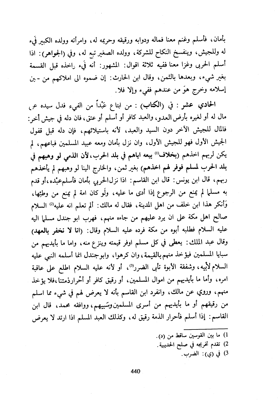 بِأَمَانٍ فَأَسْلَمَ وَغَنِمَ مَعَنَا فَمَالُهُ وَدَوَابُّهُ وَرَقِيقُهُ وَحَرِيمُهُ لَهُ وَامْرَأَتُهُ وَوَلَدُهُ الْكَبِيرُ فَيْءٌ لَهُ وَلِلْجَيْشِ وَيَنْفَسِخُ النِّكَاحُ لِلشَّرِكَةِ وَوَلَدُهُ الصَّغِيرُ تَبَعٌ لَهُ وَفِي الْجَوَاهِر إِذا أَسْلَمَ الْحَرْبِيُّ وَغَزَا مَعَنَا فَفِيهِ ثَلَاثَةُ أَقْوَالٍ الْمَشْهُورُ أَنَّهُ فَيْءٌ وَأَخْذَهُ قَبْلَ الْقِسْمَةِ بِغَيْرِ شَيْءٍ وَبَعْدِهَا بِالثَّمَنِ وَقَالَ ابْنُ الْحَارِثِ إِنْ ضَمُّوهُ إِلَى أَمْلَاكِهِمْ مِنْ حِينِ إِسْلَامِهِ وَخَرَجَ هُوَ مِنْ عِنْدِهِمْ فَفَيْءٌ وَإِلَّا فَلَا الْحَادِيَ عَشَرَ فِي الْكِتَابِ مَنِ ابْتَاعَ عَبْدًا مِنَ الْفَيْءِ فَدُلَّ سَيِّدُهُ عَلَى مَالٍ لَهُ أَوْ لِغَيْرِهِ بِأَرْضِ الْعَدُوِّ وَالْعَبْدُ كَافِرٌ أَوْ أَسَلَمَ أَوْ عَتَقَ فَإِنْ دَلَّهُ فِي جَيْشٍ آخَرَ فَالْمَالُ لِلْجَيْشِ الْآخَرِ دُونَ السَّيِّدِ وَالْعَبْدِ لِأَنَّهُ باستيلائهم فَإِن دَلَّهُ قَبْلَ قُفُولِ الْجَيْش الْأَوَّلِ فَهُوَ لِلْجَيْشِ الأول وَإِن نزل بِأَمَان وَمَعَهُ عبيد الْمُسلمين فباعهم لم يكن لرَبهم أَخْذُهُمْ بِخِلَافِ بَيْعِهِ إِيَّاهُمْ فِي بَلَدِ الْحَرْبِ لِأَنَّ الذِّمِّيَّ لَوْ وَهَبَهُمْ فِي بَلَدِ الْحَرْبِ لمُسلم فوفر لَهُم أَخذهم بِغَيْرِ ثَمَنٍ وَالْخَارِجُ إِلَيْنَا لَوْ وَهَبَهُمْ لَمْ يَأْخُذْهُمْ رَبُّهُمْ قَالَ ابْنُ يُونُسَ قَالَ ابْنُ الْقَاسِمِ إِذَا نَزَلَ الْحَرْبِيُّ بِأَمَانٍ فَأَسْلَمَ عَبْدُهُ أَوْ قَدِمَ بِهِ مُسْلِمًا لَمْ يُمْنَعْ مِنَ الرُّجُوعِ إِذَا أَدَّى مَا عَلَيْهِ وَلَوْ كَانَ أَمَةً لَمْ يُمْنَعْ مِنْ وَطْئِهَا وَأَنْكَرَ هَذَا ابْنُ خَلَفٍ مِنْ أَهْلِ الْمَدِينَةِ فَقَالَ لَهُ مَالك ألم تعلم أَنه - صَلَّى اللَّهُ عَلَيْهِ وَسَلَّم َ - صَالَحَ أَهْلَ مَكَّةَ عَلَى أَنْ يَرُدَّ عَلَيْهِمْ مَنْ جَاءَهُ مِنْهُمْ فَهَرَبَ أَبُو جَنْدَلٍ مُسْلِمًا إِلَيْهِ - صَلَّى اللَّهُ عَلَيْهِ وَسَلَّم َ - فَطَلَبه أَبوهُ من مَكَّة فَرده - صَلَّى اللَّهُ عَلَيْهِ وَسَلَّم َ -