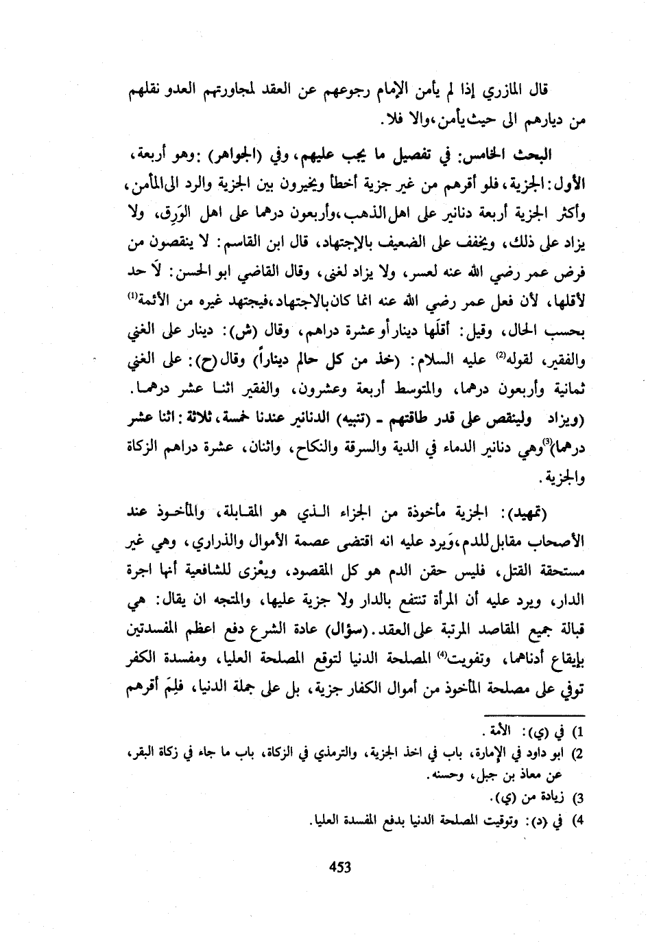 قَالَ الْمَازِرِيُّ إِذَا لَمْ يَأْمَنُ الْإِمَامُ رُجُوعَهُمْ عَنِ الْعَقْدِ لِمُجَاوَرَتِهِمُ الْعَدُوَّ نَقَلَهُمْ مِنْ دِيَارِهِمْ إِلَى حَيْثُ يَأْمَنُ وَإِلَّا فَلَا الْبَحْثُ الْخَامِسُ فِي تَفْصِيلِ مَا يَجِبُ عَلَيْهِمْ وَفِي الْجَوَاهِرِ وَهُوَ أَرْبَعَةٌ الْأَوَّلُ الْجِزْيَةُ فَلَوْ أَقَرَّهُمْ مِنْ غَيْرِ جِزْيَةٍ أَخْطَأَ وَيُخَيَّرُونَ بَيْنَ الْجِزْيَةِ وَالرَّدِّ إِلَى الْمَأْمَنِ وَأَكْثَرُ الْجِزْيَةِ أَرْبَعَةُ دَنَانِيرَ عَلَى أَهْلِ الذَّهَبِ وَأَرْبَعُونَ دِرْهَمًا عَلَى أَهْلِ الْوَرِقِ وَلَا يُزَادُ عَلَى ذَلِكَ وَيُخَفَّفُ عَلَى الضَّعِيفِ بِالِاجْتِهَادِ قَالَ ابْنُ الْقَاسِمِ لَا يُنْقَصُونَ مِنْ فَرْضِ عُمَرَ رَضِيَ اللَّهُ عَنْهُ لِعُسْرٍ وَلَا يُزَادُ لِغَنِيٍّ وَقَالَ الْقَاضِي أَبُو الْحَسَنِ لَا حَدًّ لِأَقَلِّهَا لِأَنَّ فِعْلَ عُمَرَ رَضِيَ اللَّهُ عَنْهُ إِنَّمَا كَانَ بِالِاجْتِهَادِ فَيَجْتَهِدُ غَيْرُهُ مِنَ الْأَئِمَّةِ بِحَسَبِ الْحَالِ وَقِيلَ أَقَلُّهَا دِينَارٌ أَوْ عَشَرَةُ دَرَاهِمَ وَقَالَ ش دِينَارٌ عَلَى الْغَنِيِّ وَالْفَقِيرِ