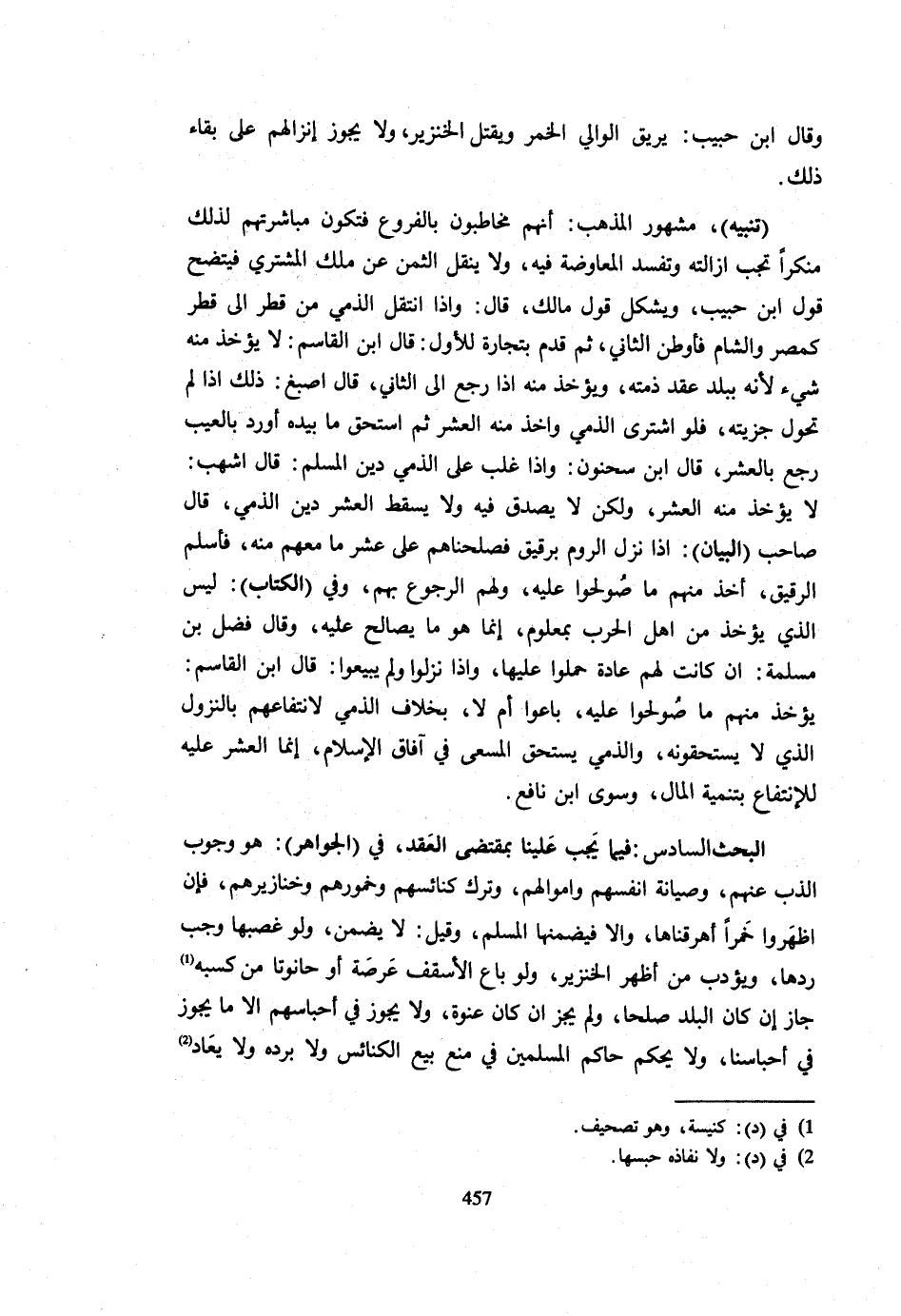 وَقَالَ ابْنُ حَبِيبٍ يُرِيقُ الْوَالِي الْخَمْرَ وَيَقْتُلُ الْخِنْزِيرَ وَلَا يَجُوزُ إِنْزَالُهُمْ عَلَى بَقَاءِ ذَلِكَ تَنْبِيهٌ مَشْهُورُ الْمَذْهَبِ أَنَّهُمْ مُخَاطَبُونَ بِالْفُرُوعِ فَتَكُونُ مباشرتهم لذَلِك مُنْكرا تحب إِزَالَتُهُ وَتَفْسُدُ الْمُعَاوَضَةُ فِيهِ وَلَا يُنْقَلُ الثَّمَنُ عَنْ مِلْكِ الْمُشْتَرِي فَيَتَّضِحُ قَوْلُ ابْنِ حَبِيبٍ وَيشكل قَول مَالك وَقَالَ إِذا انْتَقَلَ الذِّمِّيُّ مِنْ قُطْرٍ إِلَى قُطْرٍ كَمِصْرَ وَالشَّامِ فَأَوْطَنَ الثَّانِي ثُمَّ قَدِمَ بِتِجَارَةٍ لِلْأَوَّلِ قَالَ ابْنُ الْقَاسِمِ لَا يُؤْخَذُ مِنْهُ شَيْءٌ لِأَنَّهُ بِبَلَدِ عَقْدِ ذِمَّتِهِ وَيُؤْخَذُ مِنْهُ إِذَا رَجَعَ إِلَى الثَّانِي قَالَ أصْبع ذَلِكَ إِذَا لَمْ تُحَوَّلْ جِزْيَتُهُ فَلَوِ اشْتَرَى الذِّمِّيُّ وَأُخِذَ مِنْهُ الْعُشْرُ ثُمَّ اسْتُحِقَّ مَا بِيَدِهِ أورد بِالْعَيْبِ رَجَعَ بِالْعُشْرِ قَالَ ابْنُ سَحْنُونٍ وَإِذَا غَلَبَ عَلَى الذِّمِّيِّ دَيْنُ الْمُسْلِمِ قَالَ أَشْهَبُ لَا يُؤْخَذُ مِنْهُ الْعُشْرُ وَلَكِنْ لَا يُصَدَّقُ فِيهِ وَلَا يُسْقِطُ الْعُشْرُ دَيْنَ الذِّمِّيِّ قَالَ صَاحب الْبَيَان إِذا نزل الرّوم برقيق فصلحناهم عَلَى عُشْرِ مَا مَعَهُمْ مِنْهُ فَأَسْلَمَ الرَّقِيقُ أُخِذَ مِنْهُمْ مَا صُولِحُوا عَلَيْهِ وَلَهُمُ الرُّجُوعُ بِهِمْ وَفِي الْكِتَابِ لَيْسَ الَّذِي يُؤْخَذُ مِنْ أَهْلِ الْحَرْبِ بِمَعْلُومٍ إِنَّمَا هُوَ مَا يُصَالَحُ عَلَيْهِ وَقَالَ فَضْلُ بْنُ مَسْلَمَةَ إِنْ كَانَتْ لَهُمْ عَادَةً حُمِلُوا عَلَيْهَا وَإِذَا نَزَلُوا وَلَمْ يَبِيعُوا قَالَ ابْنُ الْقَاسِمِ يُؤْخَذُ مِنْهُمْ مَا صُولِحُوا عَلَيْهِ بَاعُوا أَمْ لَا بِخِلَافِ الذِّمِّيِّ لِانْتِفَاعِهِمْ بِالنُّزُولِ الَّذِي لَا يَسْتَحِقُّونَهُ وَالذِّمِّيُّ يَسْتَحِقُّ الْمَسْعَى فِي آفَاقِ الْإِسْلَامِ إِنَّمَا الْعُشْرُ عَلَيْهِ لِلِانْتِفَاعِ بِتَنْمِيَةِ الْمَالِ وَسوى ابْنُ نَافِعٍ الْبَحْثُ السَّادِسُ فِيمَا يَجِبُ عَلَيْنَا بِمُقْتَضَى الْعَقْدِ فِي الْجَوَاهِرِ هُوَ وُجُوبُ الذَّبِّ عَنْهُمْ وَصِيَانَةُ أَنْفُسِهِمْ وَأَمْوَالِهِمْ وَتَرْكُ كَنَائِسِهِمْ وَخُمُورِهِمْ وَخَنَازِيرِهِمْ فَإِنْ أَظْهَرُوا خمرًا أهرقناها وَإِلَّا فَيَضْمَنُهَا الْمُسْلِمُ وَقِيلَ لَا يَضْمَنُ وَلَوْ غَصَبَهَا وَجَبَ رَدُّهَا وَيُؤَدَّبُ مَنْ أَظْهَرَ الْخِنْزِيرَ وَلَوْ بَاعَ الْأَسْقُفُ عَرْصَةً أَوْ حَانُوتًا مِنْ كَسبه جَازَ إِنْ كَانَ الْبَلَدُ صُلْحًا وَلَمْ يَجُزْ إِنْ كَانَ عَنْوَةً وَلَا يَجُوزُ فِي أَحْبَاسِهِمْ إِلَّا مَا يَجُوزُ فِي أَحْبَاسِنَا وَلَا يَحْكُمُ حَاكِمُ الْمُسْلِمِينَ فِي مَنْعِ بَيْعِ الْكَنَائِسِ وَلَا برده وَلَا يُعَاد