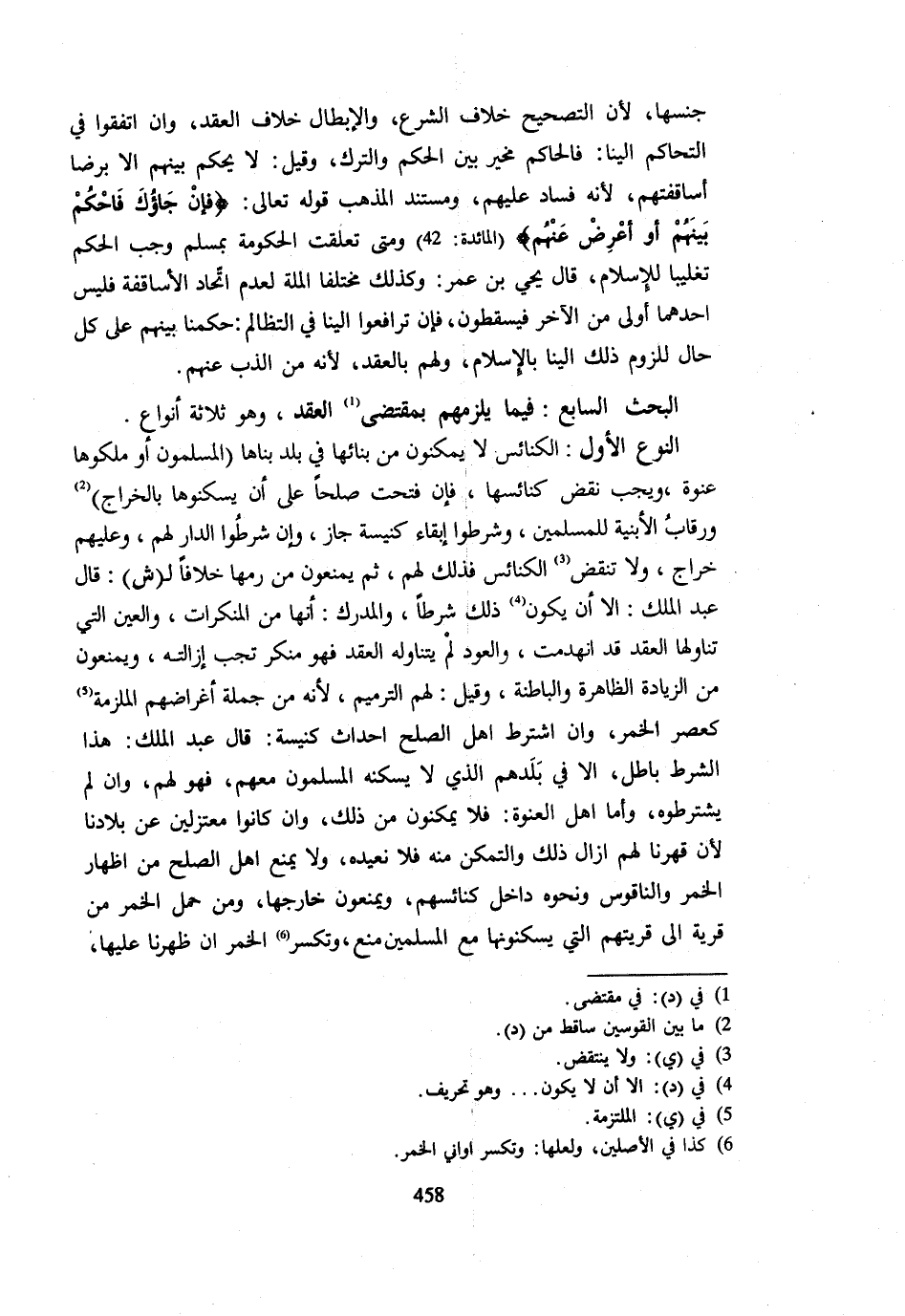 جِنْسهَا لِأَنَّ التَّصْحِيحَ خِلَافُ الشَّرْعِ وَالْإِبْطَالَ خِلَافُ الْعَقْدِ وَإِنِ اتَّفَقُوا فِي التَّحَاكُمِ إِلَيْنَا فَالْحَاكِمُ مُخَيَّرٌ بَيْنَ الْحُكْمِ وَالتَّرْكِ وَقِيلَ لَا يَحْكُمُ بَيْنَهُمْ إِلَّا بِرِضَا أَسَاقِفَتِهِمْ لِأَنَّهُ فَسَادٌ عَلَيْهِمْ وَمُسْتَنَدُ الْمَذْهَب قَوْله تَعَالَى {فَإِن جاؤك فَاحْكُمْ بَيْنَهُمْ أَوْ أَعْرِضْ عَنْهُمْ} الْمَائِدَة 42 وَمَتَى تَعَلَّقَتِ الْحُكُومَةُ بِمُسْلِمٍ وَجَبَ الْحُكْمُ تَغْلِيبًا لِلْإِسْلَامِ قَالَ يَحْيَى بْنُ عُمَرَ وَكَذَلِكَ مُخْتَلِفَا الْمِلَّةِ لِعَدَمِ اتِّحَادِ الْأَسَاقِفَةِ فَلَيْسَ أَحَدُهُمَا أَوْلَى مِنَ الآخر فيسقطون فَإِن ترافعوا إِلَيْنَا فِي التظالم حَكَمْنَا بَيْنَهُمْ عَلَى كُلِّ حَالٍ لِلُزُومٍ ذَلِكَ إِلَيْنَا بِالْإِسْلَامِ وَلَهُمْ بِالْعَقْدِ لِأَنَّهُ مِنَ الذَّبِّ عَنْهُمْ الْبَحْثُ السَّابِعُ فِيمَا يَلْزَمُهُمْ بِمُقْتَضَى الْعَقْدِ وَهُوَ ثَلَاثَةُ أَنْوَاعٍ النَّوْعُ الْأَوَّلُ الْكَنَائِسُ لَا يُمَكَّنُونَ مِنْ بِنَائِهَا فِي بَلَدٍ بَنَاهَا الْمُسْلِمُونَ أَوْ مَلَكُوهَا عَنْوَةً وَيَجِبُ نَقْضُ كَنَائِسِهَا فَإِنْ فُتِحَتْ صُلْحًا عَلَى أَنْ يَسْكُنُوهَا بِالْخَرَاجِ وَرِقَابُ الْأَبْنِيَةِ لِلْمُسْلِمِينَ وَشَرَطُوا إِبْقَاءَ كَنِيسَةٍ جَازَ وَإِنْ شَرَطُوا الدَّارَ لَهُمْ وَعَلَيْهِمْ خَرَاجٌ وَلَا تُنْقَضُ الْكَنَائِسُ فَذَلِكَ لَهُمْ ثُمَّ يُمْنَعُونَ مِنْ رَمِّهَا خِلَافًا لِ ش قَالَ عَبْدُ الْمَلِكِ إِلَّا أَنْ يَكُونَ ذَلِكَ شَرْطًا وَالْمُدْرَكُ أَنَّهَا مِنَ الْمُنْكَرَاتِ وَالْعَيْنُ الَّتِي تَنَاوَلَهَا الْعَقْدُ قَدِ انْهَدَمَتْ وَالْعَوْدُ لَمْ يَتَنَاوَلْهُ الْعَقْدُ فَهُوَ مُنْكَرٌ تَجِبُ إِزَالَتُهُ وَيُمْنَعُونَ مِنَ الزِّيَادَةِ الظَّاهِرَةِ وَالْبَاطِنَةِ وَقِيلَ لَهُمُ الترميم لِأَنَّهُ من جملَة أغراضهم الملزمة كعصير الْخَمْرِ وَإِنِ اشْتَرَطَ أَهْلُ الصُّلْحِ إِحْدَاثَ كَنِيسَةٍ قَالَ عَبْدُ الْمَلِكِ هَذَا الشَّرْطُ بَاطِلٌ إِلَّا فِي بَلَدِهِمُ الَّذِي لَا يَسْكُنُهُ الْمُسْلِمُونَ مَعَهُمْ فَهُوَ لَهُمْ وَإِنْ لَمْ يَشْتَرِطُوهُ وَأَمَّا أَهْلُ الْعَنْوَةِ فَلَا يُمَكَّنُونَ مِنْ ذَلِكَ وَإِنْ كَانُوا مُعْتَزِلِينَ عَنْ بِلَادِنَا لِأَنَّ قَهْرَنَا لَهُمْ أَزَالَ ذَلِكَ وَالتَّمَكُّنَ مِنْهُ فَلَا نُعِيدُهُ وَلَا يُمْنَعُ أَهْلُ الصُّلْحِ مِنْ إِظْهَارِ الْخَمْرِ وَالنَّاقُوسِ وَنَحْوِهِ دَاخِلَ كَنَائِسِهِمْ وَيُمْنَعُونَ خَارِجَهَا وَمَنْ حَمَلَ الْخَمْرَ مِنْ قَرْيَةٍ إِلَى قَرْيَتِهِمُ الَّتِي يَسْكُنُونَهَا مَعَ الْمُسْلِمِينَ مُنِعَ وَتُكْسَرُ الْخَمْرُ إِنْ ظَهَرْنَا عَلَيْهَا