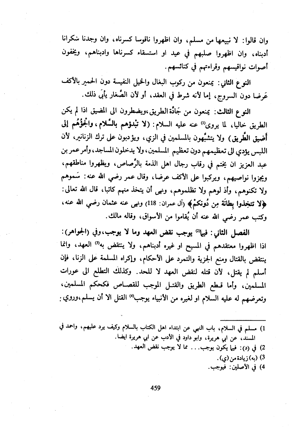 وَإِنْ قَالُوا لَا نَبِيعُهَا مِنْ مُسْلِمٍ وَإِنْ أَظْهَرُوا نَاقُوسًا كَسَرْنَاهُ وَإِنْ وَجَدْنَا سَكْرَانًا أَدَّبْنَاهُ وَإِنْ أَظْهَرُوا صُلُبَهُمْ فِي عِيدٍ أَوِ اسْتِسْقَاءٍ كَسَرْنَاهَا وَأَدَّبْنَاهُمْ وَيُخْفُونَ أَصْوَاتَ نَوَاقِيسِهِمْ وَقِرَاءَتَهُمْ فِي كنائسهم النَّوْع الثَّانِي يمْنَعُونَ من ركون الْبِغَالِ وَالْخَيْلِ النَّفِيسَةِ دُونَ الْحَمِيرِ بِالْأُكُفِ عَرْضًا دُونَ السُّرُوجِ إِمَّا لِأَنَّهُ شَرْطٌ فِي الْعَقْدِ أَوْ لِأَنَّ الصَّغَارَ يَأْبَى ذَلِكَ النَّوْعُ الثَّالِثُ يُمْنَعُونَ مِنْ جَادَّةِ الطَّرِيقِ وَيُضْطَرُّونَ إِلَى الْمَضِيقِ إِذَا لَمْ يَكُنِ الطَّرِيقُ خَالِيًا لِمَا يُرْوَى عَنهُ - صَلَّى اللَّهُ عَلَيْهِ وَسَلَّم َ - لَا تبدؤهم بِالسَّلَامِ والجؤهم إِلَى أَضْيَقِ الطَّرِيقِ وَلَا يَتَشَبَّهُونَ بِالْمُسْلِمِينَ فِي الزِّيِّ وَيُؤَدَّبُونَ عَلَى تَرْكِ الزَّنَانِيرِ لِأَنَّ اللُّبْسَ يُؤَدِّي إِلَى تَعْظِيمِهِمْ دُونَ تَعْظِيمِ الْمُسْلِمِينَ وَلَا يَدْخُلُونَ الْمَسَاجِدَ وَأَمَرَ عُمَرُ بْنُ عَبْدِ الْعَزِيزِ أَن يخْتم فِي رِقَاب رجال أهل الذِّمَّة بالرصاص ويظهرون مَنَاطِقَهُمْ وَيَجُزُّوا نَوَاصِيَهُمْ وَيَرْكَبُوا عَلَى الْأُكُفِ عَرْضًا وَقَالَ عُمَرُ رَضِيَ اللَّهُ عَنْهُ سَمُّوهُمْ وَلَا تُكَنُّوهُمْ وَأَذِلُّوهُمْ وَلَا تَظْلِمُوهُمْ وَنَهَى أَنْ يُتَّخَذَ مِنْهُم كَاتبا قَالَ اللَّهُ تَعَالَى {لَا تَتَّخِذُوا بِطَانَةً مِنْ دُونِكُمْ} آل عمرَان 118 وَنَهَى عَنْهُ عُثْمَانُ رَضِيَ اللَّهُ عَنْهُ وَكَتَبَ عُمَرُ رَضِيَ اللَّهُ عَنْهُ أَنْ يُقَامُوا مِنَ الْأَسْوَاقِ وَقَالَهُ مَالِكٌ الْفَصْلُ الثَّانِي فِيمَا يُوجب نقض الْعَهْد وَمَا لَا يُوجب وَفِي الْجَوَاهِرِ إِذَا أَظْهَرُوا مُعْتَقَدَهُمْ فِي الْمَسِيحِ أَو غَيره أدبناهم وَلَا ينْتَقض بِهِ الْعَهْد وَإِنَّمَا يَنْتَقِضُ بِالْقِتَالِ وَمَنْعِ الْجِزْيَةِ وَالتَّمَرُّدِ عَلَى الْأَحْكَامِ وإكراه الْمسلمَة على الزِّنَا فَإِنْ أَسْلَمَ لَمْ يُقْتَلْ لِأَنَّ قَتْلَهُ لِنَقْضِ الْعَهْدِ لَا لِلْحَدِّ وَكَذَلِكَ التَّطَلُّعُ إِلَى عَوْرَاتِ الْمُسْلِمِينَ وَأَمَّا قَطْعُ الطَّرِيقِ وَالْقَتْلُ الْمُوجِبُ لِلْقِصَاصِ فكحكم الْمُسلمين وتعرضهم لَهُ - صَلَّى اللَّهُ عَلَيْهِ وَسَلَّم َ - أَوْ لِغَيْرِهِ مِنَ الْأَنْبِيَاءِ يُوجِبُ الْقَتْلَ إِلَّا أَنْ يُسْلِمَ وَرُوِيَ