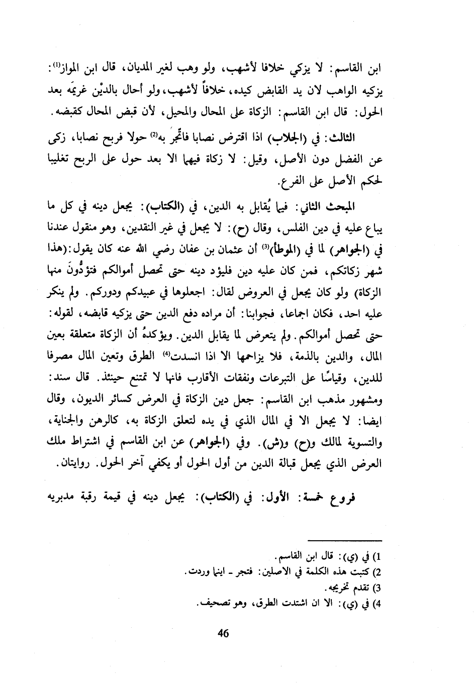 ابْنُ الْقَاسِمِ لَا يُزَكِّي خِلَافًا لِأَشْهَبَ وَلَوْ وَهَبَ لِغَيْرِ الْمِدْيَانِ قَالَ ابْنُ الْمَوَّازِ يُزَكِّيهِ الْوَاهِبُ لِأَنَّ يَدَ الْقَابِضِ كَيَدِهِ خِلَافًا لِأَشْهَبَ وَلَوْ أَحَالَ بِالدَّيْنِ غَرِيمَهُ بَعْدَ الْحَوْلِ قَالَ ابْنُ الْقَاسِمِ الزَّكَاةُ عَلَى الْمُحَالِ وَالْمُحِيلِ لِأَنَّ قَبْضَ الْمُحَالِ كَقَبْضِهِ الثَّالِثُ فِي الْجُلَّابِ إِذَا اقْترض نِصَابا فاتجر بِهِ حَوْلًا فَرَبِحَ نِصَابًا زَكَّى عَنِ الْفَضْلِ دُونَ الْأَصْلِ وَقِيلَ لَا زَكَاةَ فِيهِمَا إِلَّا بَعْدَ حَوْلٍ عَلَى الرِّبْحِ تَغْلِيبًا لِحُكْمِ الْأَصْلِ على الْفَرْع المبحث الثَّانِي فِيمَا يُقَابِلُ بِهِ الدَّيْنَ فِي الْكِتَابِ يَجْعَلُ دَيْنَهُ فِي كُلِّ مَا يُبَاعُ عَلَيْهِ فِي دَيْنِ الْفَلْسِ وَقَالَ (ح) لَا يَجْعَلُ فِي غَيْرِ النَّقْدَيْنِ وَهُوَ مَنْقُولٌ عِنْدَنَا فِي الْجَوَاهِرِ لِمَا فِي الْمُوَطَّأِ أَنَّ عُثْمَانَ بْنَ عَفَّانَ رَضِيَ اللَّهُ عَنْهُ كَانَ يَقُولُ هَذَا شَهْرُ زَكَاتِكُمْ فَمَنْ كَانَ عَلَيْهِ دَيْنٌ فَلْيُؤَدِّ دينه حَتَّى تحصل أَمْوَالكُم فتؤدون مِنْهَا الزَّكَاةَ وَلَوْ كَانَ يَجْعَلُ فِي الْعُرُوضِ لَقَالَ اجْعَلُوهَا فِي عَبِيدِكُمْ وَدَوْرِكُمْ وَلَمْ يُنْكِرْ عَلَيْهِ اُحْدُ فَكَانَ اجماعا فجوابنا أَنَّ مُرَادَهُ دَفْعُ الدَّيْنِ حَتَّى يُزَكِّيَهُ قَابِضُهُ لِقَوْلِهِ حَتَّى تُحَصَّلَ أَمْوَالُكُمْ وَلَمْ يَتَعَرَّضْ لِمَا يُقَابِلُ الدَّيْنَ وَيُؤَكِّدُهُ أَنَّ الزَّكَاةَ مُتَعَلِّقَةٌ بِعَيْنِ الْمَالِ وَالدَّيْنُ بِالذِّمَّةِ فَلَا يُزَاحِمُهَا إِلَّا إِذَا انْسَدَّتِ الطُّرُقُ وَتَعَيَّنَ الْمَالُ مَصْرِفًا لِلدَّيْنِ وَقِيَاسًا عَلَى التَّبَرُّعَاتِ وَنَفَقَاتِ الْأَقَارِبِ فَإِنَّهَا لَا تَمْتَنِعُ حِينَئِذٍ قَالَ سَنَدٌ وَمَشْهُورُ مَذْهَبِ ابْنِ الْقَاسِمِ جَعْلُ دَيْنِ الزَّكَاةِ فِي الْعَرْضِ كَسَائِرِ الدُّيُونِ وَقَالَ أَيْضًا لَا يُجْعَلُ إِلَّا فِي الْمَالِ الَّذِي فِي يَدِهِ لِتَعَلُّقِ الزَّكَاةِ بِهِ كَالرَّهْنِ وَالْجِنَايَةِ وَالتَّسْوِيَةُ لِمَالِكٍ وَ (ح) وَ (ش) وَفِي الْجَوَاهِرِ عَنِ ابْنِ الْقَاسِمِ فِي اشْتِرَاطِ ملك الْعرض الَّذِي يَجْعَل قبالة الدَّيْنِ مِنْ أَوَّلِ الْحَوْلِ أَوْ يَكْفِي آخِرَ الْحَوْلِ رِوَايَتَانِ فُرُوعٌ خَمْسَةٌ الْأَوَّلُ فِي الْكِتَابِ يُجْعَلُ دَيْنُهُ فِي قِيمَةِ رَقَبَةِ مُدَبِّرِيهِ