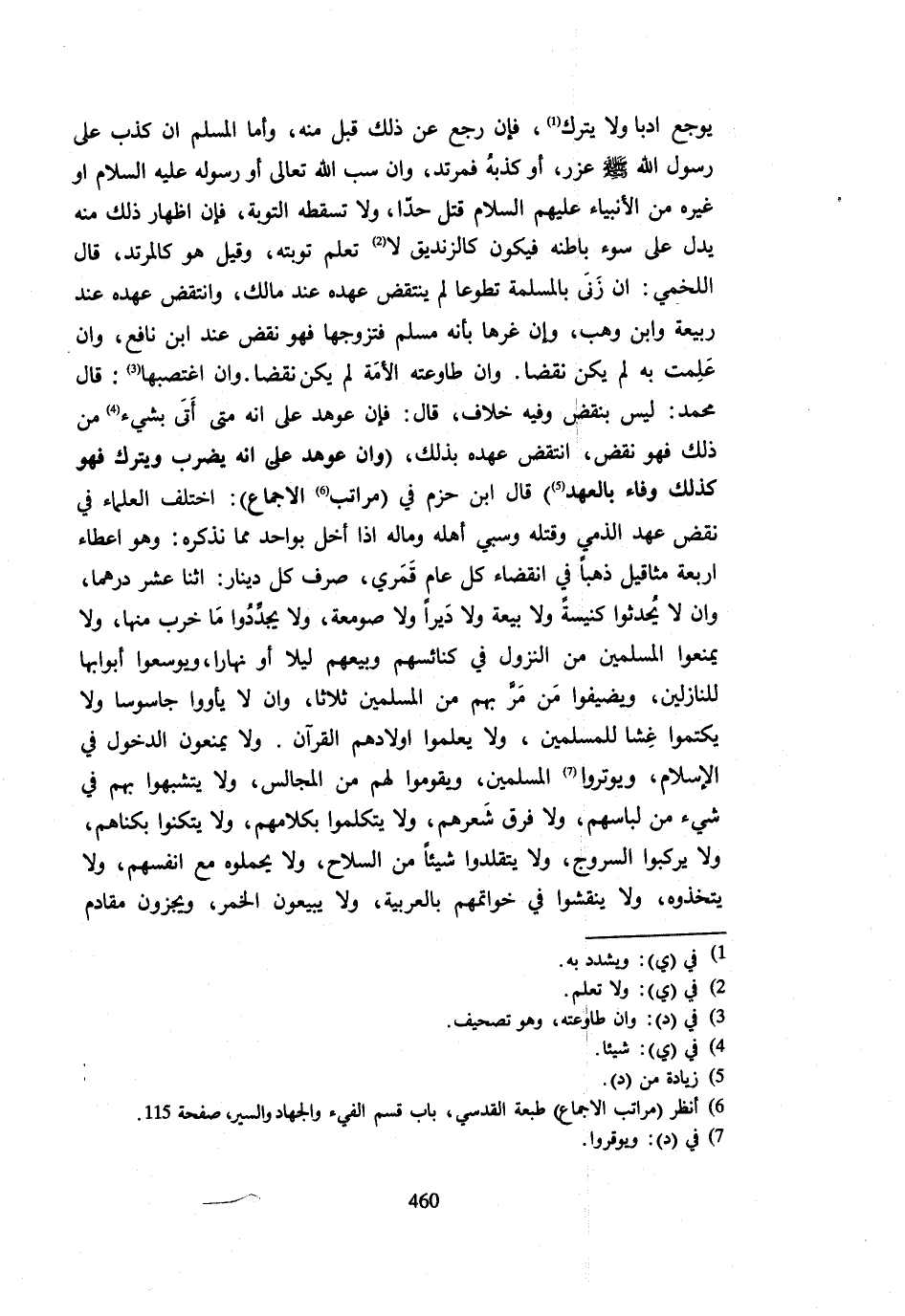 يُوجَعُ أَدَبًا وَلَا يُتْرَكُ فَإِنْ رَجَعَ عَنْ ذَلِكَ قُبِلَ مِنْهُ وَأَمَّا الْمُسْلِمُ إِنْ كَذَبَ عَلَى رَسُولِ اللَّهِ - صَلَّى اللَّهُ عَلَيْهِ وَسَلَّم َ - عُزِّرَ أَوْ كَذَّبَهُ فَمُرْتَدٌّ وَإِنْ سَبَّ اللَّهَ تَعَالَى أَو رَسُوله - صَلَّى اللَّهُ عَلَيْهِ وَسَلَّم َ - أَوْ غَيْرَهُ مِنَ الْأَنْبِيَاءِ عَلَيْهِمْ السَّلَامُ قُتِلَ حَدًّا وَلَا تُسْقِطُهُ التَّوْبَةُ فَإِنَّ إِظْهَارَ ذَلِكَ مِنْهُ يَدُلُّ عَلَى سُوءِ بَاطِنِهِ فَيَكُونُ كَالزِّنْدِيقِ لَا تُعْلَمُ تَوْبَتُهُ وَقِيلَ هُوَ كَالْمُرْتَدِّ قَالَ اللَّخْمِيُّ إِنْ زَنَى بِالْمُسْلِمَةِ تَطَوُّعًا لَمْ يَنْتَقِضْ عَهْدُهُ عِنْدَ مَالِكٍ وَانْتَقَضَ عَهْدُهُ عِنْدَ رَبِيعَةَ وَابْنِ وَهْبٍ وَإِنْ غَرَّهَا بِأَنَّهُ مُسْلِمٌ فَتَزَوَّجَهَا فَهُوَ نَقْضٌ عِنْدَ ابْنِ نَافِعٍ وَإِنْ عَلِمَتْ بِهِ لَمْ يَكُنْ نَقْضًا وَإِنْ طَاوَعَتْهُ الْأَمَةُ لَمْ يَكُنْ نَقْضًا وَإِنِ اغْتَصَبَهَا قَالَ مُحَمَّدٌ لَيْسَ بِنَقْضٍ وَفِيهِ خِلَافٌ قَالَ فَإِنْ عُوهِدَ على انه مَتى بِشَيْءٍ مِنْ ذَلِكَ فَهُوَ نَقْضٌ انْتَقَضَ عَهْدُهُ بِذَلِكَ وَإِنْ عُوهِدَ عَلَى أَنَّهُ يُضْرَبُ وَيُتْرَكُ فَهُوَ كَذَلِكَ وَفَاءً بِالْعَهْدِ قَالَ ابْنُ حَزْمٍ فِي مَرَاتِبِ الْإِجْمَاعِ اخْتَلَفَ الْعُلَمَاءُ فِي نَقْضِ عَهْدِ الذِّمِّيِّ وَقَتْلِهِ وَسَبْيِ أَهْلِهِ وَمَالِهِ إِذَا أَخَلَّ بِوَاحِدٍ مِمَّا نَذْكُرُهُ وَهُوَ إِعْطَاءُ أَرْبَعَةِ مَثَاقِيلَ ذَهَبًا فِي انْقِضَاءِ كُلِّ عَامٍ قَمَرِيٍّ صرف كل دِينَار أثنا عشر درهما وَإِن لَا يُحْدِثُوا كَنِيسَةً وَلَا بِيعَةً وَلَا دَيْرًا وَلَا صَوْمَعَةً وَلَا يُجَدِّدُوا مَا خَرِبَ مِنْهَا وَلَا يَمْنَعُوا الْمُسْلِمِينَ مِنَ النُّزُولِ فِي كَنَائِسِهِمْ وَبِيَعِهِمْ لَيْلًا أَوْ نَهَارًا وَيُوَسِّعُوا أَبْوَابَهَا لِلنَّازِلِينَ وَيُضَيِّفُوا من مر بهم من الْمُسلمين ثَلَاثًا وَإِن لَا يأووا جَاسُوسًا وَلَا يَكْتُمُوا غِشًّا لِلْمُسْلِمِينَ وَلَا يُعَلِّمُوا أَوْلَادهم الْقُرْآن وَلَا يمْنَعُونَ الدُّخُول فِي الْإِسْلَام ويوتروا الْمُسلمين ويقوموا لَهُم من الْمَجَالِسِ وَلَا يَتَشَبَّهُوا بِهِمْ فِي شَيْءٍ مِنْ لِبَاسِهِمْ وَلَا فَرْقِ شَعَرِهِمْ وَلَا يَتَكَلَّمُوا بِكَلَامِهِمْ وَلَا يَتَكَنَّوْا بِكُنَاهُمْ وَلَا يَرْكَبُوا السُّرُوجَ وَلَا يَتَقَلَّدُوا شَيْئًا مِنَ السِّلَاحِ وَلَا يَحْمِلُوهُ مَعَ أنفسهم وَلَا يتخذوه وَلَا ينقشوا فِي خواتمهم بِالْعَرَبِيَّةِ وَلَا يبيعون الْخمر ويجزون مقادم