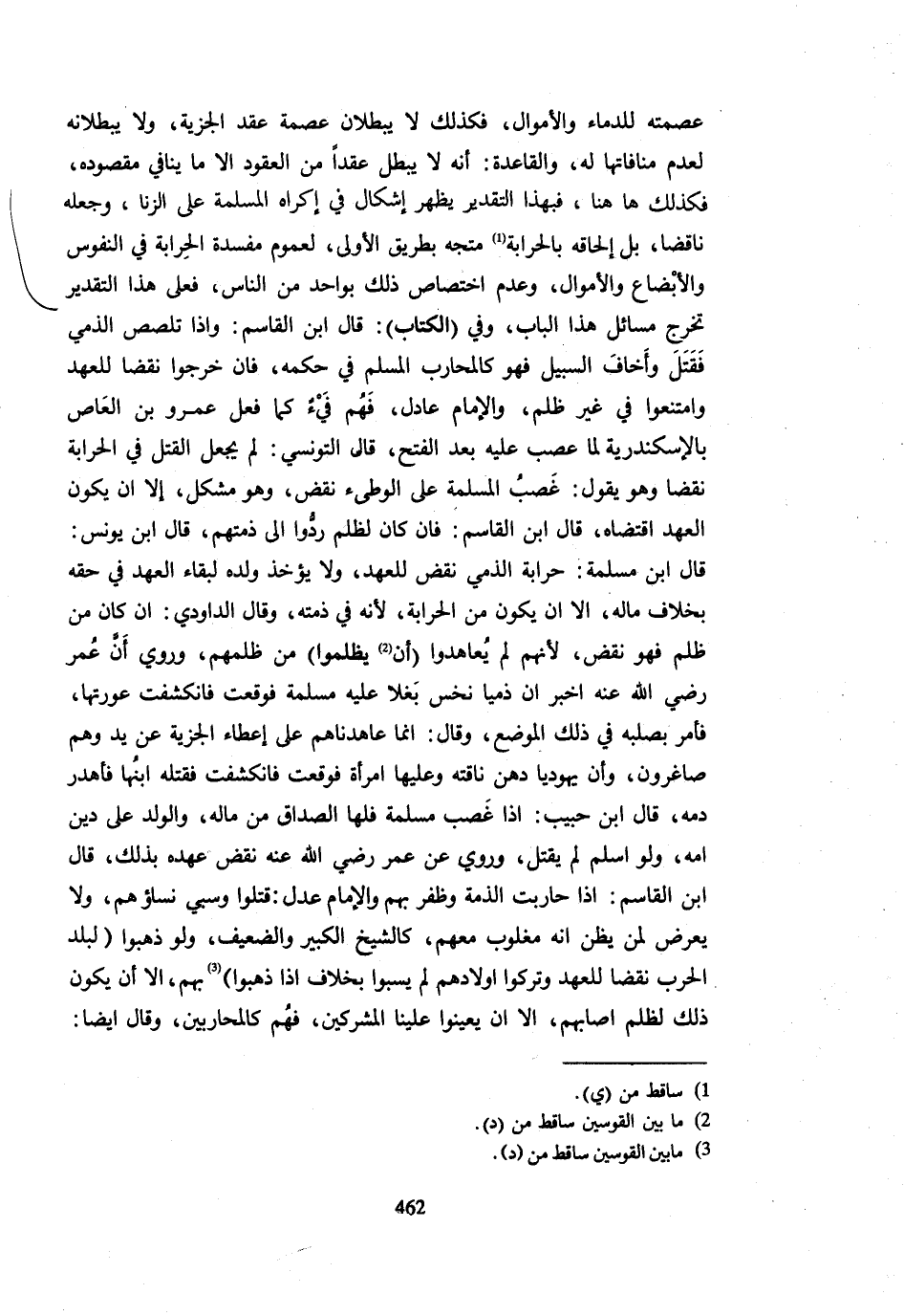 عصمته للدماء وَالْأَمْوَال فَكَذَلِك لَا يبطلان عصمَة عقد الْجِزْيَة وَلَا يبطلانه لعدم منافاتها لَهُ وَالْقَاعِدَةُ أَنَّهُ لَا يُبْطِلُ عَقْدًا مِنَ الْعُقُود إِلَّا مَا يُنَافِي مَقْصُوده فَكَذَلِك هَا هُنَا فَبِهَذَا التَّقْدِيرِ يَظْهَرُ إِشْكَالٌ فِي إِكْرَاهِ الْمُسْلِمَةِ على الزِّنَا وَجعله نَاقِصا بَلْ إِلْحَاقُهُ بِالْحِرَابَةِ مُتَّجِهٌ بِطَرِيقِ الْأَوْلَى لِعُمُومِ مَفْسَدَةِ الْحِرَابَةِ فِي النُّفُوسِ وَالْأَبْضَاعِ وَالْأَمْوَالِ وَعَدَمِ اخْتِصَاصِ ذَلِكَ بِوَاحِدٍ مِنَ النَّاسِ فَعَلَى هَذَا التَّقْدِيرِ تَخْرُجُ مَسَائِلُ هَذَا الْبَابِ وَفِي الْكِتَابِ قَالَ ابْنُ الْقَاسِمِ وَإِذَا تَلَصَّصَ الذِّمِّيُّ فَقَتَلَ وَأَخَافَ السَّبِيلَ فَهُوَ كَالْمُحَارِبِ الْمُسْلِمِ فِي حُكْمِهِ فَإِنْ خَرَجُوا نَقْضًا لِلْعَهْدِ وَامْتَنَعُوا فِي غَيْرِ ظلم وَالْإِمَام عَادل فهم فَيْء كَمَا فعل عَمْرو بن الْعَاصِ بالإسكندرية لما عصب عَلَيْهِ بعد الْفَتْح قَالَ التّونسِيّ لم يَجْعَل الْقَتْلُ فِي الْحِرَابَةِ نَقْضًا وَهُوَ يَقُولُ غَصْبُ الْمسلمَة على الوطئ نَقْضٌ وَهُوَ مُشْكِلٌ إِلَّا أَنْ يَكُونَ الْعَهْدُ اقْتَضَاهُ قَالَ ابْنُ الْقَاسِمِ فَإِنْ كَانَ لِظُلْمٍ رُدُّوا إِلَى ذِمَّتِهِمْ قَالَ ابْنُ يُونُسَ قَالَ ابْنُ مَسْلَمَةَ حِرَابَةُ الذِّمِّيِّ نَقْضٌ لِلْعَهْدِ وَلَا يُؤْخَذُ وَلَدُهُ لِبَقَاءِ الْعَهْدِ فِي حَقِّهِ بِخِلَافِ مَالِهِ إِلَّا أَنْ يَكُونَ مِنَ الْحِرَابَةِ لِأَنَّهُ فِي ذِمَّتِهِ وَقَالَ الدَّاوُدِيُّ إِنْ كَانَ مَنْ ظلم فَهُوَ نقض لأَنهم لم يعاهدوا أَنْ يَظْلِمُوا مَنْ ظَلَمَهُمْ وَرُوِيَ أَنَّ عُمَرَ رَضِيَ اللَّهُ عَنْهُ أُخْبِرَ أَنَّ ذِمِّيًّا نَخَسَ بَغْلًا عَلَيْهِ مُسْلِمَة فَوَقَعَتْ فَانْكَشَفَتْ عَوْرَتُهَا فَأَمَرَ بِصَلْبِهِ فِي ذَلِكَ الْمَوْضِعِ وَقَالَ إِنَّمَا عَاهَدْنَاهُمْ عَلَى إِعْطَاءِ الْجِزْيَةِ عَنْ يَدٍ وَهُمْ صَاغِرُونَ وَأَن يَهُودِيًّا دَهَنَ نَاقَتَهُ وَعَلَيْهَا امْرَأَةٌ فَوَقَعَتْ فَانْكَشَفَتْ فَقَتَلَهُ ابْنُهَا فَأَهْدَرَ دَمَهُ قَالَ ابْنُ حَبِيبٍ إِذَا غَصَبَ مُسْلَمَةً فَلَهَا الصَّدَاقُ مِنْ مَالِهِ وَالْوَلَدُ عَلَى دِينِ أُمِّهِ وَلَوْ أَسْلَمَ لَمْ يُقْتَلْ وَرُوِيَ عَنْ عُمَرَ رَضِيَ اللَّهُ عَنْهُ نَقْضُ عَهْدِهِ بِذَلِكَ قَالَ ابْنُ الْقَاسِمِ إِذَا حَارَبت الذِّمَّةُ وَظُفِرَ بِهِمْ وَالْإِمَامُ عَدْلٌ قُتِلُوا وَسُبِيَ نِسَاؤُهُم وَلَا يعرض لِمَنْ يُظَنُّ أَنَّهُ مَغْلُوبٌ مَعَهُمْ كَالشَّيْخِ الْكَبِيرِ وَالضَّعِيفِ وَلَوْ ذَهَبُوا لِبَلَدِ الْحَرْبِ نَقْضًا لِلْعَهْدِ وَتركُوا أَوْلَادهم لم يسبوا بِخِلَاف إِذَا ذَهَبُوا بِهِمْ إِلَّا أَنْ يَكُونَ ذَلِكَ لِظُلْمٍ أَصَابَهُمْ إِلَّا أَنْ يُعِينُوا عَلَيْنَا الْمُشْرِكِينَ فَهُمْ كَالْمُحَارِبِينَ وَقَالَ أَيْضًا