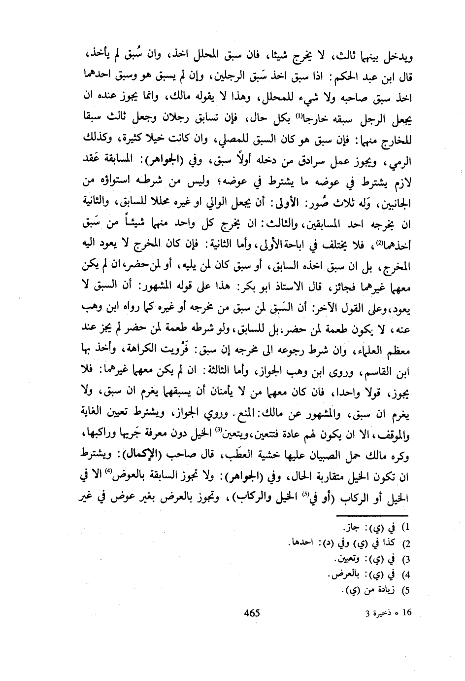 وَيَدْخُلُ بَيْنَهُمَا ثَالِثٌ لَا يُخْرِجُ شَيْئًا فَإِنْ سَبَقَ الْمُحَلِّلُ أَخَذَ وَإِنْ سُبِقَ لَمْ يَأْخُذْ قَالَ ابْنُ عَبْدِ الْحَكَمِ إِذَا سَبَقَ أَخَذَ سبق الرجلَيْن وَإِن لَمْ يَسْبِقْ هُوَ وَسَبَقَ أَحَدُهُمَا أَخَذَ سَبَقَ صَاحِبِهِ وَلَا شَيْءَ لِلْمُحَلِّلِ وَهَذَا لَا يَقُولُهُ مَالك وَإِنَّمَا يجوز عِنْدَهُ أَنْ يَجْعَلَ الرَّجُلُ سَبَقَهُ خَارِجًا بِكُلِّ حَالٍ فَإِنْ تَسَابَقَ رَجُلَانِ وَجَعَلَ ثَالِثٌ سَبَقًا لِلْخَارِجِ مِنْهُمَا فَإِنْ سَبَقَ هُوَ كَانَ السَّبَقُ لِلْمُصَلِّي وَإِنْ كَانَتْ خَيْلًا كَثِيرَةً وَكَذَلِكَ الرَّمْيُ وَيَجُوزُ عَمَلُ سُرَادِقَ مَنْ دَخَلَهُ أَوَّلًا سَبَقَ وَفِي الْجَوَاهِرِ الْمُسَابَقَةُ عَقْدٌ لَازِمٌ يُشْتَرَطُ فِي عِوَضِهِ مَا يُشْتَرَطُ فِي عِوَضِهِ وَلَيْسَ مِنْ شَرْطِهِ اسْتِوَاؤُهُ مِنَ الْجَانِبَيْنِ وَلَهُ ثَلَاثُ صُوَرٍ الْأُولَى أَنْ يَجْعَلَ الْوَالِي أَوْ غَيْرُهُ مُحَلِّلًا للسابق وَالثَّانيَِة أَن يُخرجهُ أحد المسابقين وَالثَّالِث أَنْ يُخْرِجَ كُلُّ وَاحِدٍ مِنْهُمَا شَيْئًا مَنْ سَبَقَ أَخْذَهُمَا فَلَا يُخْتَلَفُ فِي إِبَاحَةِ الْأُولَى وَأَمَّا الثَّانِيَةُ فَإِنْ كَانَ الْمُخْرِجُ لَا يَعُودُ إِلَيْهِ الْمُخْرَجُ بَلْ إِنْ سَبَقَ أَخَذَهُ السَّابِقُ أَوْ سَبَقَ كَانَ لِمَنْ يَلِيهِ أَوْ لِمَنْ حَضَرَ إِنْ لَمْ يَكُنْ مَعَهُمَا غَيْرُهُمَا فَجَائِزٌ قَالَ الْأُسْتَاذُ أَبُو بَكْرٍ هَذَا عَلَى قَوْلِهِ الْمَشْهُورِ إِنَّ السَّبَقَ لَا يَعُودُ وَعَلَى الْقَوْلِ الْآخَرِ إِنَّ السَّبَقَ لِمَنْ سَبَقَ مِنْ مُخْرِجِهِ أَوْ غَيْرِهِ كَمَا رَوَاهُ ابْنُ وَهْبٍ عَنْهُ لَا يَكُونُ طُعْمَةً لِمَنْ حَضَرَ بَلْ لِلسَّابِقِ وَلَوْ شَرَطَهُ طُعْمَةً لِمَنْ حَضَرَ لَمْ يَجُزْ عِنْدَ مُعْظَمِ الْعُلَمَاءِ وَإِنْ شَرَطَ رُجُوعَهُ إِلَى مُخْرِجِهِ إِنْ سَبَقَ فَرُوِيَتِ الْكَرَاهَةُ وَأَخَذَ بِهَا ابْنُ الْقَاسِمِ وَرَوَى ابْنُ وَهْبٍ الْجَوَازَ وَأَمَّا الثَّالِثَةُ إِنْ لَمْ يَكُنْ مَعَهُمَا غَيْرُهُمَا فَلَا يَجُوزُ قَوْلًا وَاحِدًا فَإِنْ كَانَ مَعَهُمَا مَنْ لَا يأمنان أَن يسبقهما يغرم إِن سبق وَلَا يغرم إِن سبق وَالْمَشْهُور عَنْ مَالِكٍ الْمَنْعُ وَرُوِيَ الْجَوَازُ وَيُشْتَرَطُ تَعْيِينُ الْغَايَةِ وَالْمَوْقِفُ إِلَّا أَنْ يَكُونَ لَهُمْ عَادَةً فتتعين وَيتَعَيَّن الْخَيْلُ دُونَ مَعْرِفَةِ جَرْيِهَا وَرَاكِبِهَا وَكَرِهَ مَالِكٌ حَمْلَ الصِّبْيَانِ عَلَيْهَا خَشْيَةَ الْعَطَبِ قَالَ صَاحِبُ الْإِكْمَال يشْتَرط أَنْ تَكُونَ الْخَيْلُ مُتَقَارِبَةَ الْحَالِ وَفِي الْجَوَاهِرِ وَلَا تجوز السَّابِقَة بِالْعِوَضِ إِلَّا فِي الْخَيل أَو الركاب أَو فِي الْخَيْلِ وَالرِّكَابِ وَتَجُوزُ بِالْعَرَضِ بِغَيْرِ عِوَضٍ فِي غير