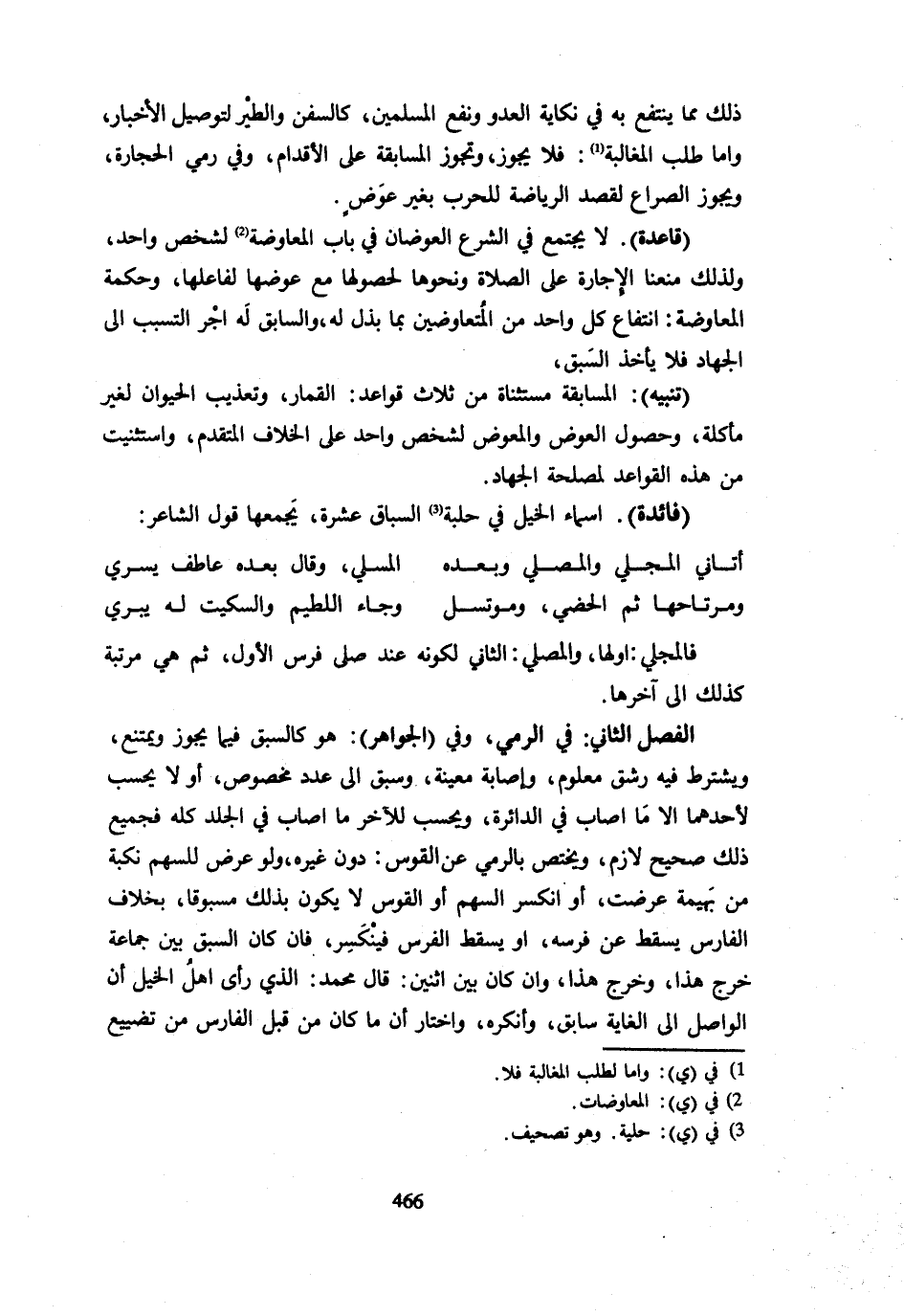 فالمجلي أَولهَا وَالْمُصَلي الثَّانِي لكَونه عِنْد صلى فرس الأول ثمَّ هِيَ مرتبَة كَذَلِك إِلَى آخرهَا الْفَصْل الثَّانِي فِي الرَّمْي وَفِي الْجَوَاهِرِ هُوَ كَالسَّبَقِ فِيمَا يَجُوزُ وَيَمْتَنِعُ وَيُشْتَرَطُ فِيهِ رَشْقٌ مَعْلُومٌ وَإِصَابَةٌ مُعَيَّنَةٌ وَسَبَقٌ إِلَى عَدَدٍ مَخْصُوصٍ أَوْ لَا يُحْسَبُ لِأَحَدِهِمَا إِلَّا مَا أَصَابَ فِي الدَّائِرَةِ وَيُحْسَبُ لِلْآخَرِ مَا أَصَابَ فِي الْجِلْدِ كُلِّهِ فَجَمِيعُ ذَلِكَ صَحِيحٌ لَازِمٌ وَيَخْتَصُّ بِالرَّمْيِ عَنِ الْقَوْسِ دُونَ غَيْرِهِ وَلَوْ عَرَضَ لِلسَّهْمِ نَكْبَةٌ مِنْ بَهِيمَةٍ عَرَضَتْ أَوِ انْكَسَرَ السَّهْمُ أَوِ الْقَوْسُ لَا يَكُونُ بِذَلِكَ مَسْبُوقًا بِخِلَافِ الْفَارِسِ يَسْقُطُ عَنْ فَرَسِهِ أَوْ يَسْقُطُ الْفَرَسُ فَيَنْكَسِرُ فَإِنْ كَانَ السَّبَقُ بَيْنَ جَمَاعَةٍ خَرَجَ هَذَا وَخَرَجَ هَذَا وَإِنْ كَانَ بَيْنَ اثْنَيْنِ قَالَ مُحَمَّدٌ الَّذِي رَأَى أَهْلُ الْخَيْلِ أَنَّ الْوَاصِلَ إِلَى الْغَايَةِ سَابِقٌ وَأَنْكَرَهُ وَاخْتَارُ أَنَّ مَا كَانَ مِنْ قبل الْفَارِس من تَضْييع