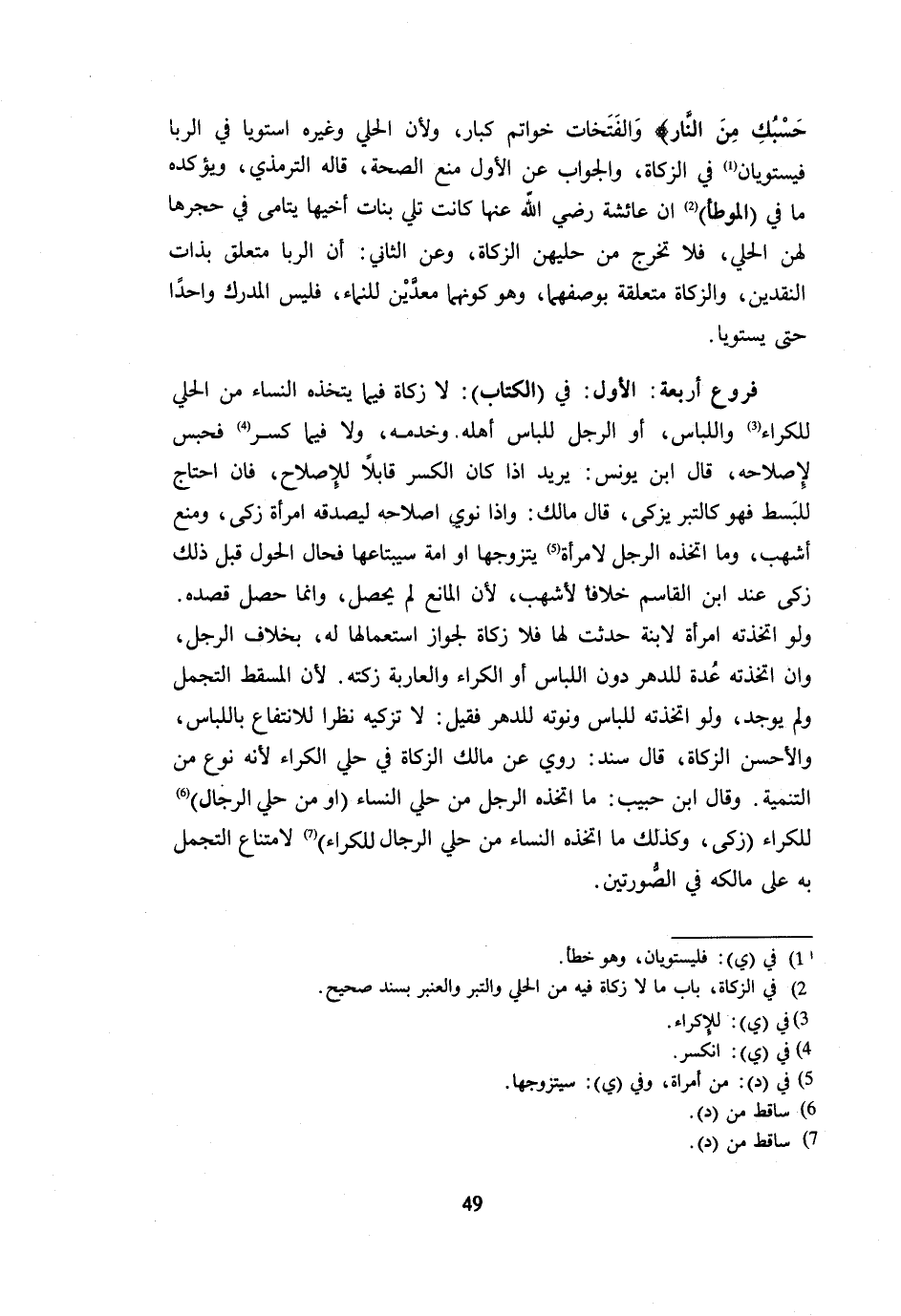 {حَسْبُكِ مِنَ النَّارِ} وَالْفَتَخَاتُ خَوَاتِمُ كِبَارٌ وَلِأَنَّ الْحُلِيَّ وَغَيْرَهُ اسْتَوَيَا فِي الرِّبَا فَيَسْتَوِيَانِ فِي الزَّكَاةِ وَالْجَوَابُ عَنِ الْأَوَّلِ مَنْعُ الصِّحَّةِ قَالَهُ التِّرْمِذِيّ ويؤكد هـ مَا فِي الْمُوَطَّأِ أَنَّ عَائِشَةَ رَضِيَ اللَّهُ عَنْهَا كَانَتْ تَلِي بَنَاتَ أَخِيهَا يَتَامَى فِي حِجْرِهَا لَهُنَّ الْحُلِيُّ فَلَا تُخْرِجُ مِنْ حُلِيِّهِنَّ الزَّكَاةَ وَعَنِ الثَّانِي أَنَّ الرِّبَا مُتَعَلِّقٌ بِذَاتِ النَّقْدَيْنِ وَالزَّكَاةُ مُتَعَلِّقَةٌ بِوَصْفِهِمَا وَهُوَ كَوْنُهُمَا مُعَدَّيْنِ لِلنَّمَاءِ فَلَيْسَ الْمَدْرَكُ وَاحِدًا حَتَّى يَسْتَوِيَا فُرُوعٌ أَرْبَعَةٌ الْأَوَّلُ فِي الْكِتَابِ لَا زَكَاةَ فِيمَا يَتَّخِذُهُ النِّسَاءُ مِنَ الْحُلِيِّ لِلْكِرَاءِ وَاللِّبَاسِ أَوِ الرَّجُلُ لِلِبَاسِ أَهْلِهِ وَخَدَمِهِ وَلَا فِيمَا كُسِرَ فَحُبِسَ لِإِصْلَاحِهِ قَالَ ابْنُ يُونُسَ يُرِيدُ إِذَا كَانَ الْكسر قَابلا للإصلاح فان احْتَاجَ للبسط فَهُوَ كَالتِّبْرِ يُزَكَّى قَالَ مَالِكٌ وَإِذَا نَوَى إِصْلَاحَهُ لِيَصْدُقَهُ امْرَأَةً زَكَّى وَمَنَعَ أَشْهَبُ وَمَا اتَّخَذَهُ الرَّجُلُ لِامْرَأَةٍ يَتَزَوَّجُهَا أَوْ أَمَةٍ سَيَبْتَاعُهَا فَحَالَ الْحَوْلُ قَبْلَ ذَلِكَ زَكَّى عِنْدَ ابْنِ الْقَاسِمِ خِلَافًا لِأَشْهَبَ لِأَنَّ الْمَانِعَ لَمْ يَحْصُلْ وَإِنَّمَا حَصَلَ قَصْدُهُ وَلَوِ اتَّخَذَتْهُ امْرَأَةٌ لِابْنَةٍ حَدَثَتْ لَهَا فَلَا زَكَاةَ لِجَوَازِ اسْتِعْمَالِهَا لَهُ بِخِلَاف الرجل وان اتَّخَذَتْهُ عُدَّةً لِلدَّهْرِ دُونَ اللِّبَاسِ أَوِ الْكِرَاءِ والعاربة زكته لِأَن الْمسْقط التجمل وَلَو يُوجَدْ وَلَوِ اتَّخَذَتْهُ لِلِبَاسٍ وَنَوَتْهُ لِلدَّهْرِ فَقِيلَ لَا تُزَكِّيهِ نَظَرًا لِلِانْتِفَاعِ بِاللِّبَاسِ وَالْأَحْسَنُ الزَّكَاةُ قَالَ سَنَد رُوِيَ عَنْ مَالِكٍ الزَّكَاةَ فِي حُلِيِّ الْكِرَاءِ لِأَنَّهُ نَوْعٌ مِنَ التَّنْمِيَةِ وَقَالَ ابْنُ حَبِيبٍ مَا اتَّخَذَهُ الرَّجُلُ مِنْ حُلِيِّ النِّسَاءِ أَوْ مِنْ حلي الرِّجَال للكراء زكى وَكَذَلِكَ مَا اتَّخَذَهُ النِّسَاءُ مِنْ حُلِيِّ الرِّجَالِ لِلْكِرَاءِ لِامْتِنَاعِ التَّجَمُّلِ بِهِ عَلَى مَالِكِهِ فِي الصُّورَتَيْنِ