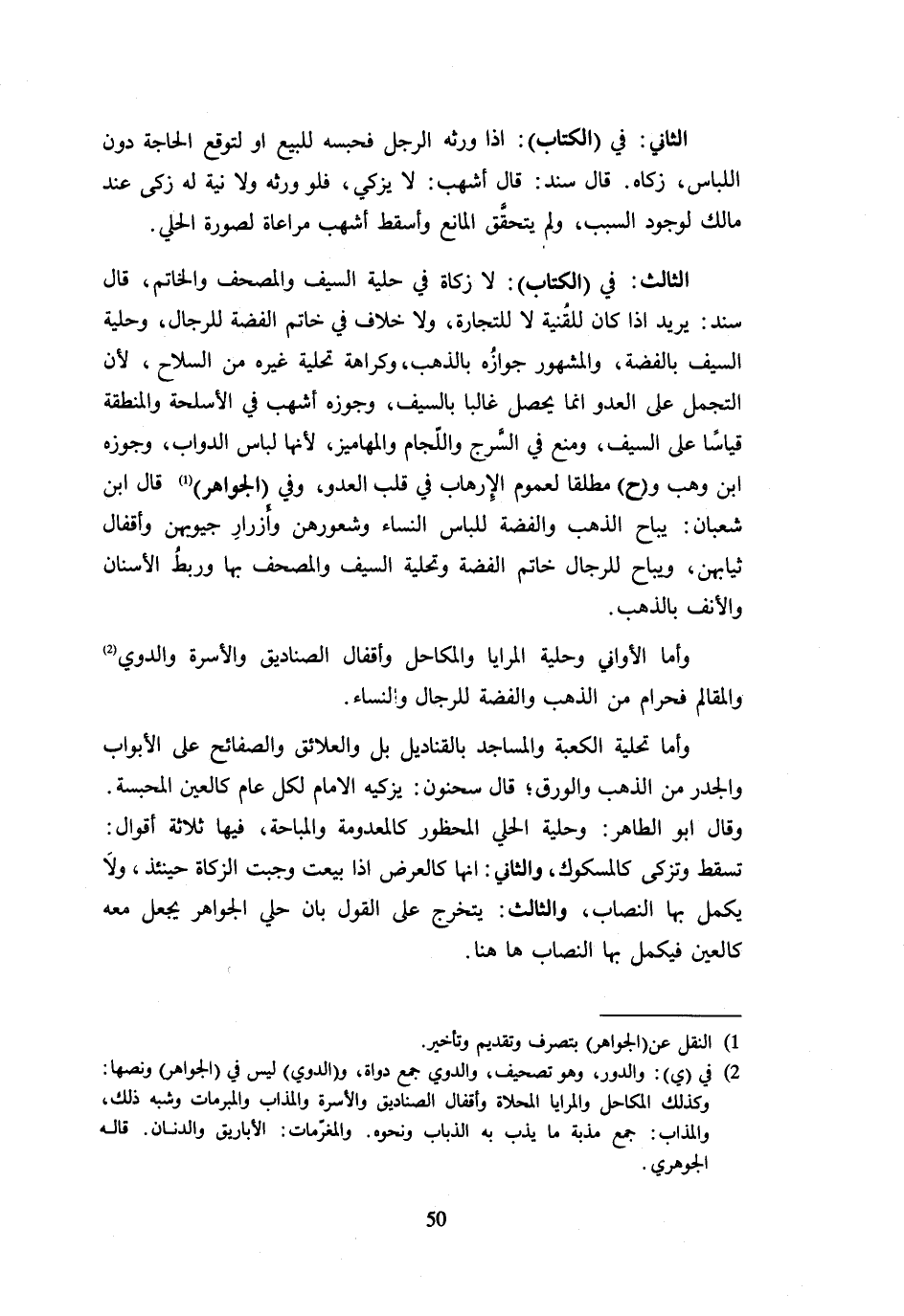 الثَّانِي فِي الْكِتَابِ إِذَا وَرِثَهُ الرَّجُلُ فَحَبَسَهُ لِلْبَيْعِ أَوْ لِتَوَقُّعِ الْحَاجَةِ دُونَ اللِّبَاسِ زَكَّاهُ قَالَ سَنَدٌ قَالَ أَشْهَبُ لَا يُزَكَّى فَلَوْ وَرِثَهُ وَلَا نِيَّةَ لَهُ زَكَّى عِنْدَ مَالِكٍ لِوُجُودِ السَّبَبِ وَلَمْ يَتَحَقَّقِ الْمَانِعُ وَأَسْقَطَ أَشْهَبُ مُرَاعَاةً لِصُورَةِ الْحُلِيِّ الثَّالِثُ فِي الْكِتَابِ لَا زَكَاةَ فِي حِلْيَةِ السَّيْفِ وَالْمُصْحَفِ وَالْخَاتَمِ قَالَ سَنَدٌ يُرِيدُ إِذَا كَانَ لِلْقِنْيَةِ لَا لِلتِّجَارَةِ وَلَا خِلَافَ فِي خَاتَمِ الْفِضَّةِ لِلرِّجَالِ وَحِلْيَةِ السَّيْفِ بِالْفِضَّةِ وَالْمَشْهُورُ جَوَازُهُ بِالذَّهَبِ وَكَرَاهَةُ تَحْلِيَةِ غَيْرِهِ مِنَ السِّلَاحِ لِأَنَّ التَّجَمُّلَ عَلَى الْعَدُوِّ إِنَّمَا يَحْصُلُ غَالِبًا بِالسَّيْفِ وَجَوَّزَهُ أَشْهَبُ فِي الْأَسْلِحَةِ وَالْمِنْطَقَةِ قِيَاسًا عَلَى السَّيْفِ وَمَنَعَ فِي السَّرْجِ وَاللِّجَامِ وَالْمَهَامِيزِ لِأَنَّهَا لِبَاسُ الدَّوَابِّ وَجَوَّزَهُ ابْنُ وَهْبٍ وَ (ح) مُطْلَقًا لِعُمُومِ الْإِرْهَابِ فِي قَلْبِ الْعَدُوِّ وَفِي الْجَوَاهِرِ قَالَ ابْنُ شَعْبَانَ يُبَاحُ الذَّهَبُ وَالْفِضَّةُ لِلِبَاسِ النِّسَاءِ وَشُعُورِهِنَّ وأزرار جُيُوبهنَّ وأقفال ثياببهن وَيُبَاحُ لِلرِّجَالِ خَاتَمُ الْفِضَّةِ وَتَحْلِيَةُ السَّيْفِ وَالْمُصْحَفِ بِهَا وَرَبْطُ الْأَسْنَانِ وَالْأَنْفِ بِالذَّهَبِ وَأَمَّا الْأَوَانِي وَحِلْيَةُ الْمَرَايَا وَالْمَكَاحِلُ وَأَقْفَالُ الصَّنَادِيقِ وَالْأَسِرَّةِ وَالدُّوِيِّ وَالْمَقَالِمِ فَحَرَامٌ مِنَ الذَّهَبِ وَالْفِضَّةِ لِلرِّجَالِ وَالنِّسَاءِ وَأَمَّا تَحْلِيَةُ الْكَعْبَةِ وَالْمَسَاجِدِ بِالْقَنَادِيلِ بَلْ وَالْعَلَائِقِ وَالصَّفَائِحِ عَلَى الْأَبْوَابِ وَالْجُدُرِ مِنَ الذَّهَبِ وَالْوَرِقِ قَالَ سَحْنُونٌ يُزَكِّيهِ الْإِمَامُ لِكُلِّ عَامٍ كَالْعَيْنِ الْمُحْبَسَةِ وَقَالَ أَبُو الطَّاهِرِ وَحِلْيَةُ الْحُلِيِّ الْمَحْظُورِ كَالْمَعْدُومَةِ وَالْمُبَاحَةِ فِيهَا ثَلَاثَةُ أَقْوَالٍ تَسْقُطُ وَتُزَكَّى كَالْمَسْكُوكِ وَالثاني أنَّهَا كَالْعَرْضِ إِذَا بِيعَتْ وَجَبَتِ الزَّكَاةُ حِينَئِذٍ وَلَا يُكْمِلُ بِهَا النِّصَابَ وَالثَّالِثُ يَتَخَرَّجُ عَلَى الْقَوْلِ بِأَنَّ حُلِيِّ الْجَوَاهِرِ يُجْعَلُ مَعَه كَالْعَيْنِ فيكمل بهَا النّصاب هَا هُنَا