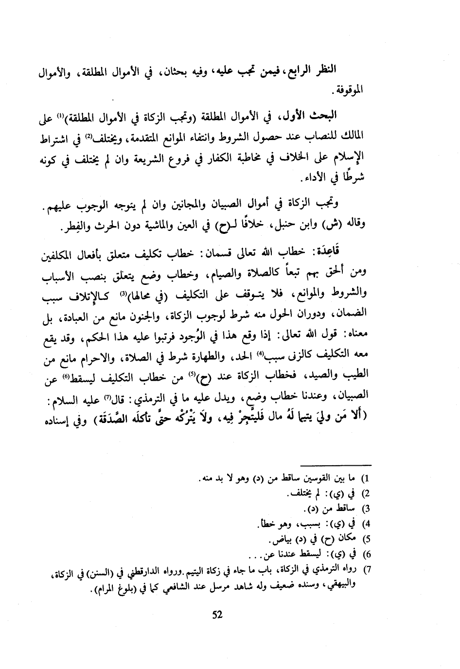 النَّظَرُ الرَّابِعُ فِيمَنْ تَجِبُ عَلَيْهِ وَفِيهِ بَحْثَانِ فِي الْأَمْوَالِ الْمُطْلَقَةِ وَالْأَمْوَالِ الْمَوْقُوفَةِ الْبَحْثُ الْأَوَّلُ فِي الْأَمْوَالِ الْمُطْلَقَةِ وَتَجِبُ الزَّكَاةُ فِي الْأَمْوَالِ الْمُطلقَة على المَال لِلنِّصَابِ عِنْدَ حُصُولِ الشُّرُوطِ وَانْتِفَاءِ الْمَوَانِعِ الْمُتَقَدِّمَةِ وَيُخْتَلَفُ فِي اشْتِرَاطِ الْإِسْلَامِ عَلَى الْخِلَافِ فِي مُخَاطبَة الْكفَّار فِي فروع الشَّرِيعَةِ وَإِنْ لَمْ يُخْتَلَفْ فِي كَوْنِهِ شَرْطًا فِي الْأَدَاءِ وَتَجِبُ الزَّكَاةُ فِي أَمْوَالِ الصِّبْيَانِ وَالْمَجَانِينَ وَإِنْ لَمْ يَتَوَجَّهِ الْوُجُوبُ عَلَيْهِمْ وَقَالَهُ (ش) وَابْنُ حَنْبَلٍ خِلَافًا لِ (ح) فِي الْعَيْنِ وَالْمَاشِيَةِ دُونَ الْحَرْثِ وَالْفِطْرِ قَاعِدَةٌ خِطَابُ اللَّهِ تَعَالَى قِسْمَانِ خِطَابُ تَكْلِيفٍ مُتَعَلِّقٌ بِأَفْعَالِ الْمُكَلَّفِينَ وَمَنْ أُلْحِقَ بِهِمْ تَبَعًا كَالصَّلَاةِ وَالصِّيَامِ وَخِطَابُ وَضْعٍ يَتَعَلَّقُ بِنَصْبِ الْأَسْبَابِ وَالشُّرُوطِ وَالْمَوَانِعِ فَلَا يَتَوَقَّفُ عَلَى التَّكْلِيفِ فِي مَحَالِّهَا كَالْإِتْلَافِ سَبَبُ الضَّمَانِ وَدَوَرَانُ الْحَوْلِ مِنْهُ شَرْطٌ لِوُجُوبِ الزَّكَاة وَالْجُنُون مَانع من الْعِبَادَة بل مَعْنَاهُ قَوْلُ اللَّهِ تَعَالَى إِذَا وَقَعَ هَذَا فِي الْوُجُودِ فَرَتِّبُوا عَلَيْهِ هَذَا الْحَكَمَ وَقَدْ يَقَعُ مَعَهُ التَّكْلِيفُ كَالزِّنَى سَبَبُ الْحَدِّ وَالطَّهَارَةُ شَرْطٌ فِي الصَّلَاةِ وَالْإِحْرَامُ مَانِعٌ مِنَ الطِّيبِ وَالصَّيْدِ فَخِطَابُ الزَّكَاةِ عِنْدَ (ح) مِنْ خِطَابِ التَّكْلِيفِ لِيَسْقُطَ عَنِ الصِّبْيَانِ وَعِنْدَنَا خِطَابُ وَضْعٍ وَيَدُلُّ عيه مَا فِي التِّرْمِذِيِّ قَالَ عَلَيْهِ السَّلَامُ