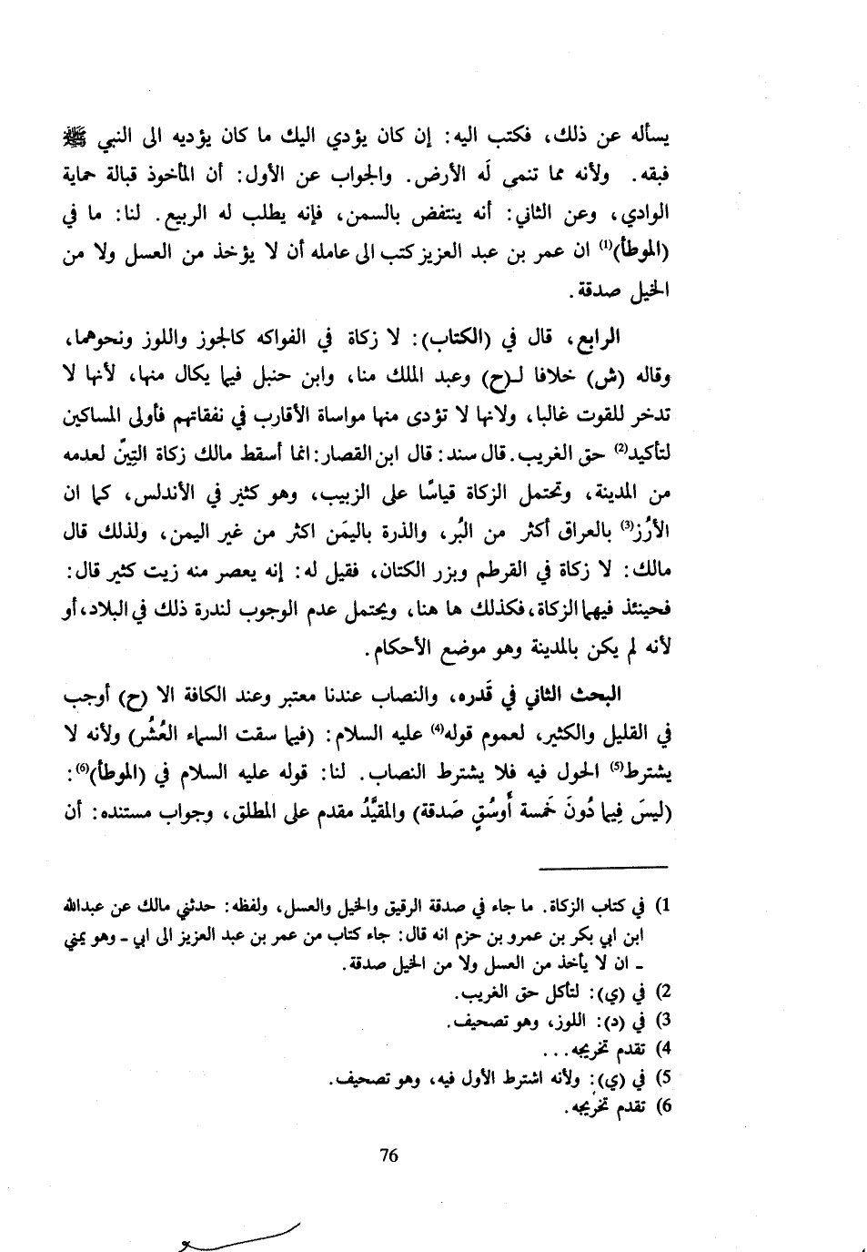 يَسْأَلُهُ عَنْ ذَلِكَ فَكَتَبَ إِلَيْهِ إِنْ كَانَ يُؤَدِّي إِلَيْكَ مَا كَانَ يُؤَدِّيهِ إِلَى النَّبِيِّ - صَلَّى اللَّهُ عَلَيْهِ وَسَلَّم َ - فَبَقِّهِ وَلِأَنَّهُ مِمَّا تُنَمَّى لَهُ الْأَرْضُ وَالْجَوَابُ عَنِ الْأَوَّلِ أَنَّ الْمَأْخُوذَ قُبَالَةُ حِمَايَةِ الْوَادِي وَعَن الثَّانِي أَنه ينتفض بِالسَّمْنِ فَإِنَّهُ يُطْلَبُ لَهُ الرَّبِيعُ لَنَا مَا فِي الْمُوَطَّأِ أَنَّ عُمَرَ بْنَ عَبْدِ الْعَزِيزِ كتب إِلَى عَامله أَن لَا يُؤْخَذَ مِنَ الْعَسَلِ وَلَا مِنَ الْخَيْلِ صَدَقَةٌ الرَّابِعُ قَالَ فِي الْكِتَابِ لَا زَكَاةَ فِي الْفَوَاكِهِ كَالْجَوْزِ وَاللَّوْزِ وَنَحْوِهِمَا وَقَالَهُ ش خِلَافًا لِ ح وَعَبْدِ الْمَلِكِ مِنَّا وَابْنِ حَنْبَلٍ فِيمَا يُكَالُ مِنْهَا لِأَنَّهَا لَا تُدَّخَرُ لِلْقُوتِ غَالِبًا وَلِأَنَّهَا لَا تُؤَدَّى مِنْهَا مُوَاسَاةُ الْأَقَارِبِ فِي نَفَقَاتِهِمْ فَأَوْلَى الْمَسَاكِينُ لِتَأْكِيدِ حَقِّ الْغَرِيبِ قَالَ سَنَدٌ قَالَ ابْنُ الْقَصَّارِ إِنَّمَا أَسْقَطَ مَالك زَكَاة التِّين لعدمه من الْمَدِينَة وتحتمل الزَّكَاةُ قِيَاسًا عَلَى الزَّبِيبِ وَهُوَ كَثِيرٌ فِي الأندلس كَمَا أَن الْأرز بِالْعِرَاقِ أَكْثَرُ مِنَ الْبُرِّ وَالذُّرَةِ بِالْيَمَنِ أَكْثَرُ مِنْ غَيْرِ الْيَمَنِ وَلِذَلِكَ قَالَ مَالِكٌ لَا زَكَاة فِي القرطم وبزر الْكَتَّانِ فَقِيلَ لَهُ إِنَّهُ يُعْصَرُ مِنْهُ زَيْتٌ كثير قَالَ فَحِينَئِذٍ فيهمَا الزَّكَاة فَكَذَلِك هَا هُنَا وَيُحْتَمَلُ عَدَمُ الْوُجُوبِ لِنُدْرَةِ ذَلِكَ فِي الْبِلَادِ أَوْ لِأَنَّهُ لَمْ يَكُنْ بِالْمَدِينَةِ وَهُوَ مَوْضِعُ الْأَحْكَامِ الْبَحْثُ الثَّانِي فِي قَدْرِهِ وَالنِّصَابُ عِنْدَنَا مُعْتَبَرٌ وَعِنْدَ الْكَافَّةِ إِلَّا ح أَوْجَبَ فِي الْقَلِيل وَالْكثير لعُمُوم قَوْله - صَلَّى اللَّهُ عَلَيْهِ وَسَلَّم َ - فِيمَا سَقَتِ السَّمَاءُ الْعُشْرُ وَلِأَنَّهُ لَا يُشْتَرَطُ الْحَوْلُ فِيهِ فَلَا يُشْتَرَطُ النِّصَابُ لَنَا قَوْلُهُ - صَلَّى اللَّهُ عَلَيْهِ وَسَلَّم َ - فِي الْمُوَطَّأِ